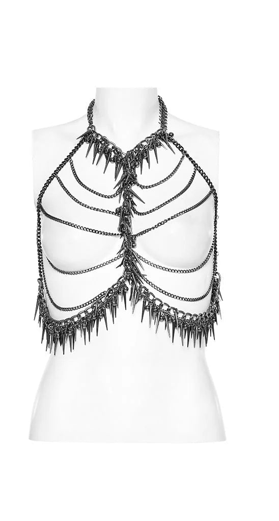 Statement Piece, ein avantgardistisches Accessoire, das die Brust mit auffälligen Ketten- und Nieten-Details neu definiert. Dieses Harness ist für Mutige und Draufgänger gemacht und bietet eine transformative Ergänzung zu jedem Outfit. Perfekt für diejenigen, die ihren Stil mit einer einzigartigen Note verstärken möchten, verkörpert dieses Stück die Spitze rebellischer Eleganz.
