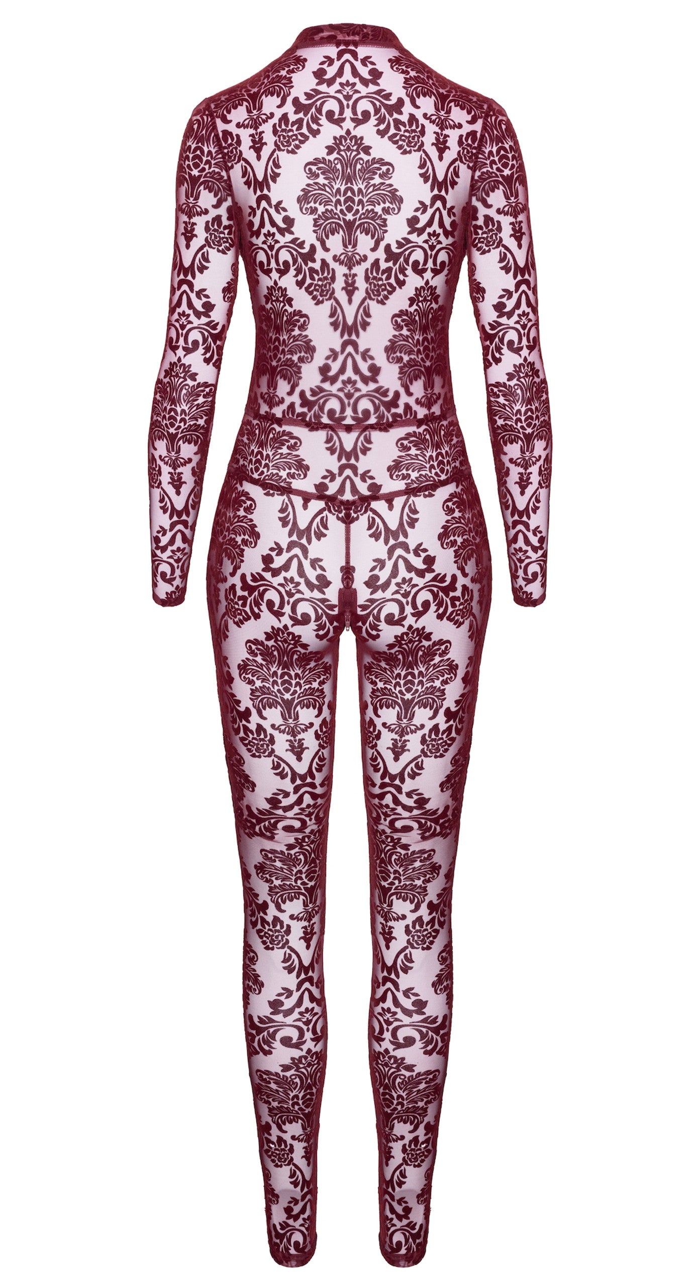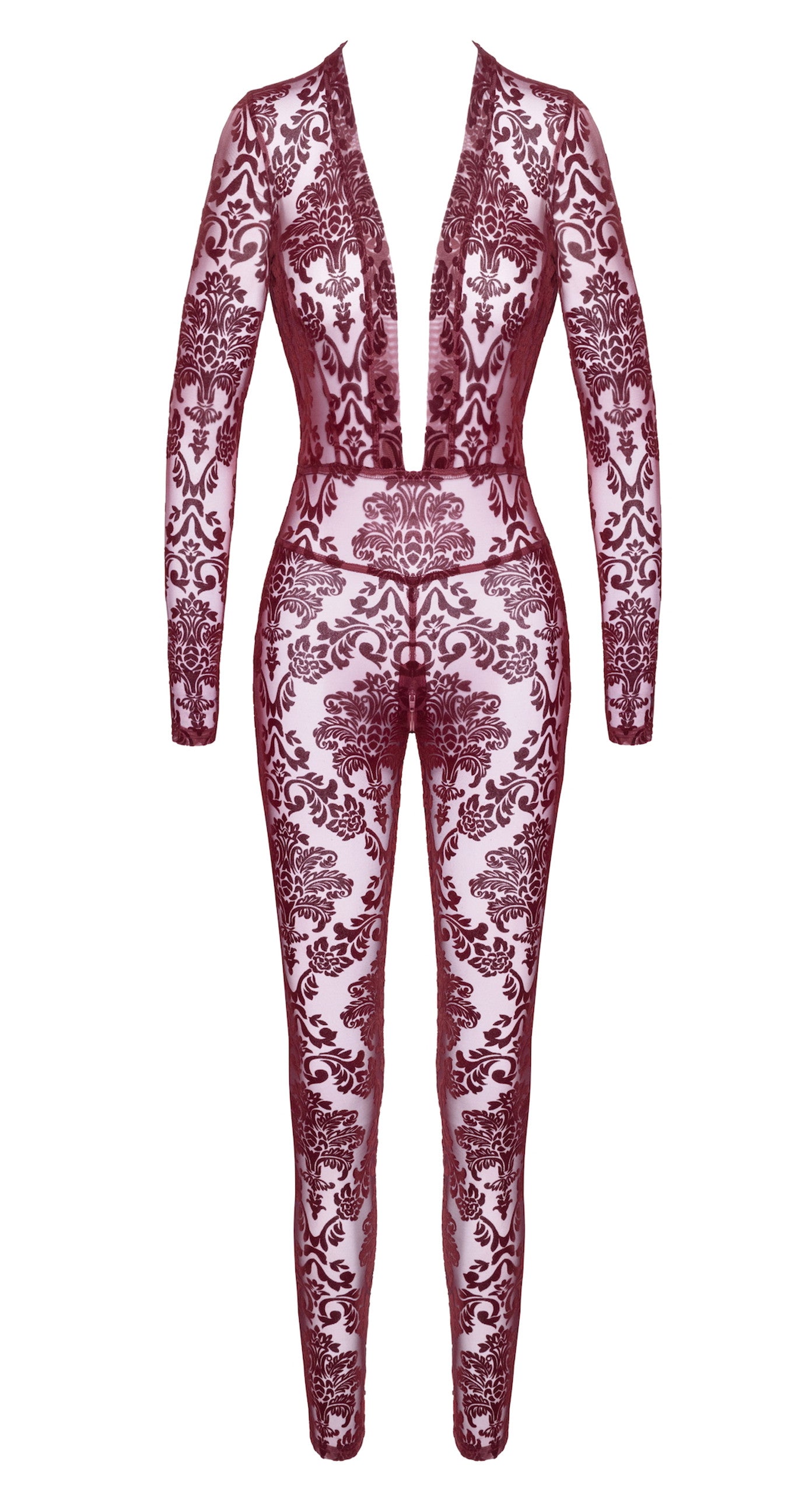 Design: Mit einem gewagten, tiefen V-Ausschnitt rahmt der Jumpsuit das Dekolleté wunderschön, während lange Ärmel und Beine in voller Länge eine schlanke, gestreckte Silhouette schaffen. Ein diskreter Schritt-Reißverschluss fügt sich nahtlos in das Design ein und bietet sowohl Funktionalität als auch kühne Sinnlichkeit.