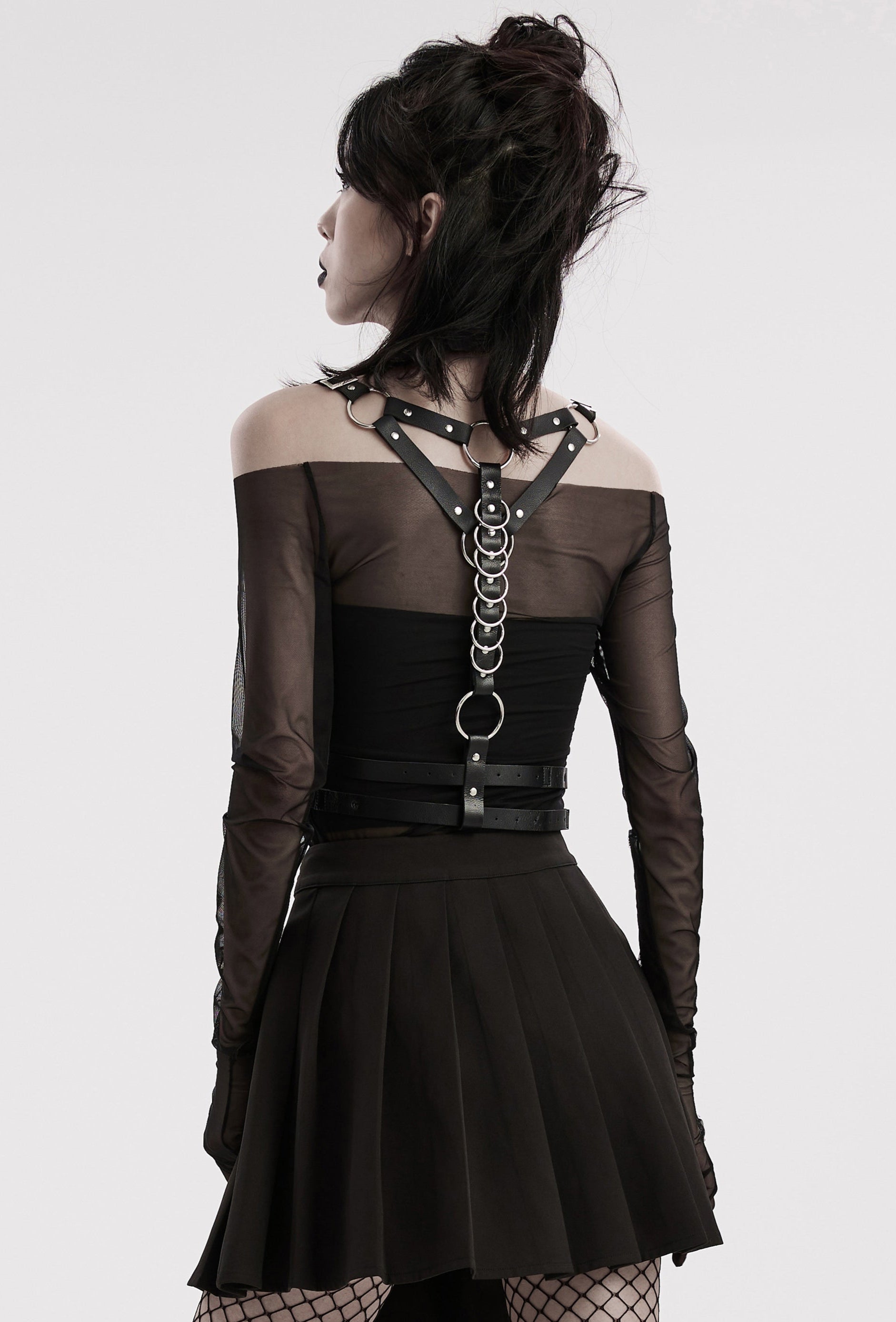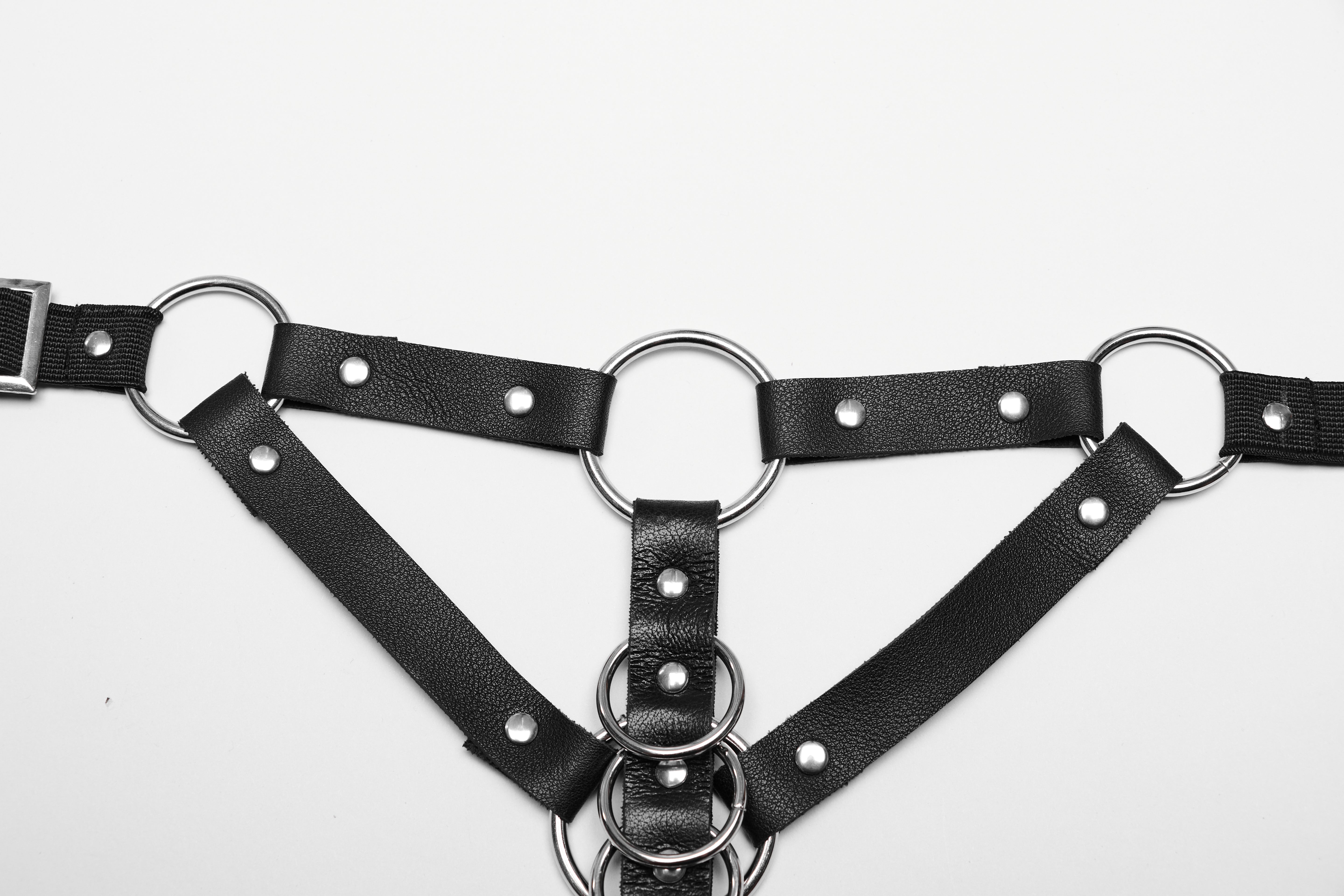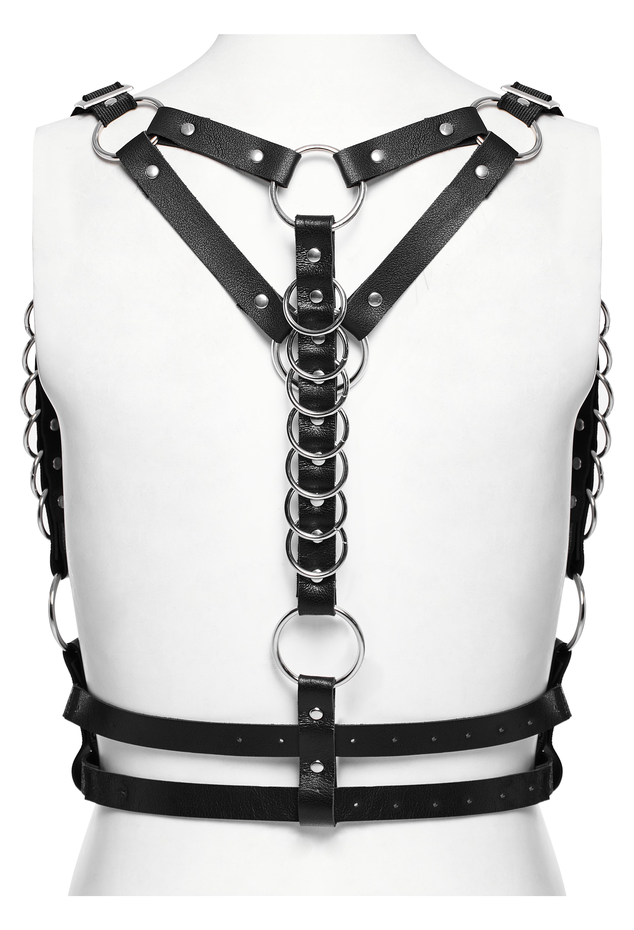 Dieses Kunstleder-Harness besticht durch mehrere Metallringe, Schultergurte und verstellbare Schlaufen an der Taille. Ein stylisches Accessoire, das deinem Look eine mutige und trendige Note verleiht.