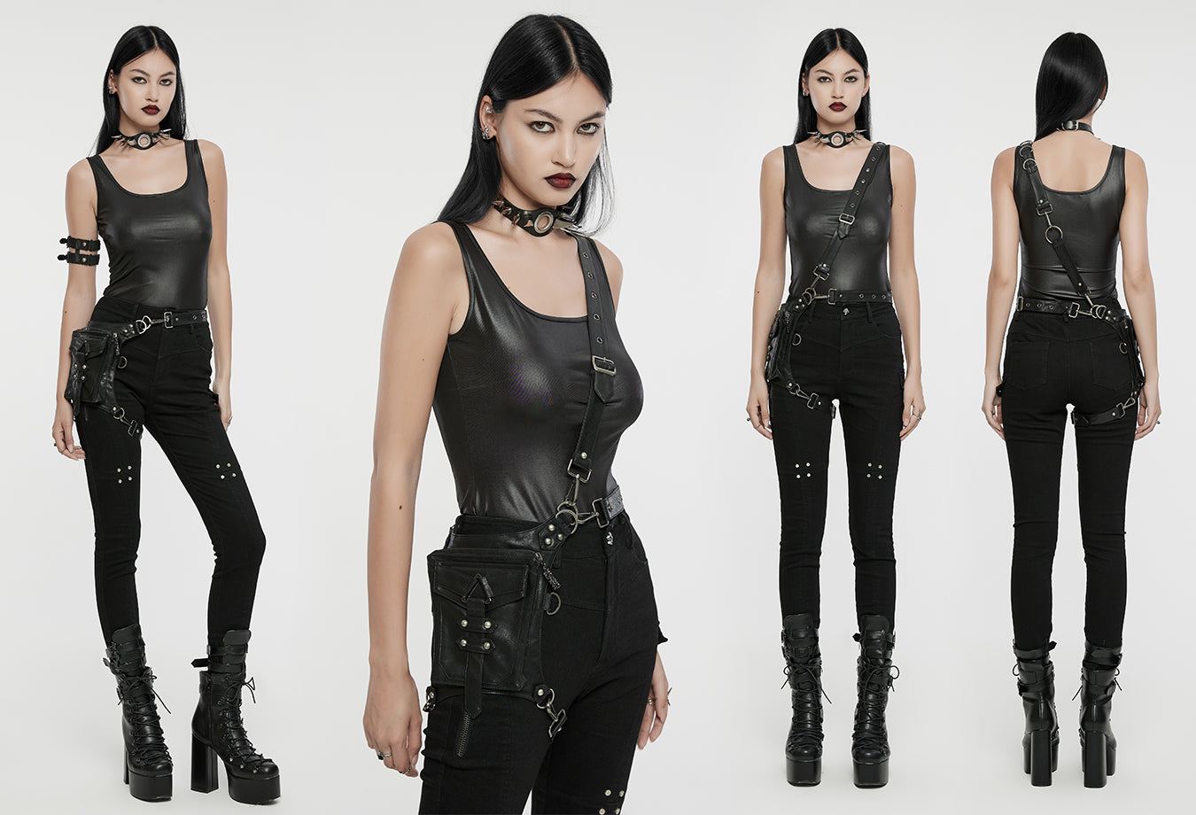 Diese vielseitige Kunstleder-Harness-Tasche lässt sich als Taillengürtel, Crossbody, Schultertasche oder Gurt tragen. Gefertigt aus gealtertem, handveredeltem Lederimitat, bietet sie ein Reißverschlussfach (24x27 cm) und ein Klappenfach (14 cm breit). Mit drei verstellbaren, abnehmbaren Trageriemen, Nietenakzenten und D-Ringen setzt sie ein rebellisches Statement im post-apokalyptischen Stil.