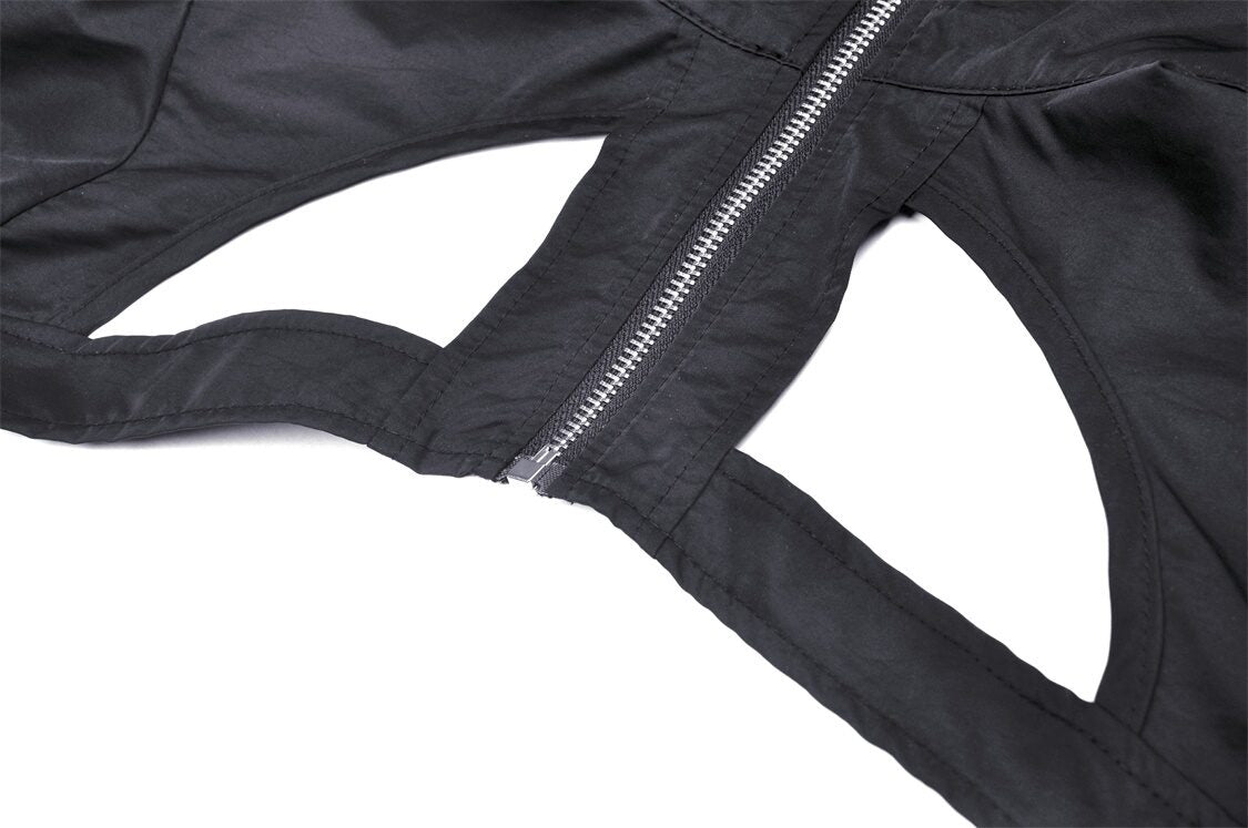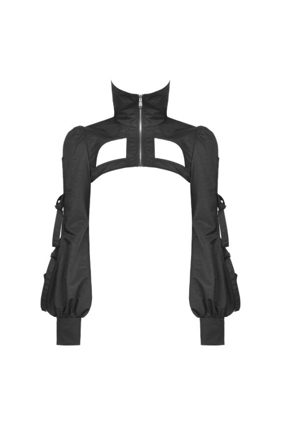 Dieser schwarze Bolero im Cyberpunk-Design besticht durch seinen hohen Reißverschlusskragen und die langen, voluminösen Ärmel mit Cut-Outs und Riemendetails. Ein markantes und auffälliges Kleidungsstück, das selbst einfache Looks mit einer kraftvollen, rebellischen Note aufwertet.