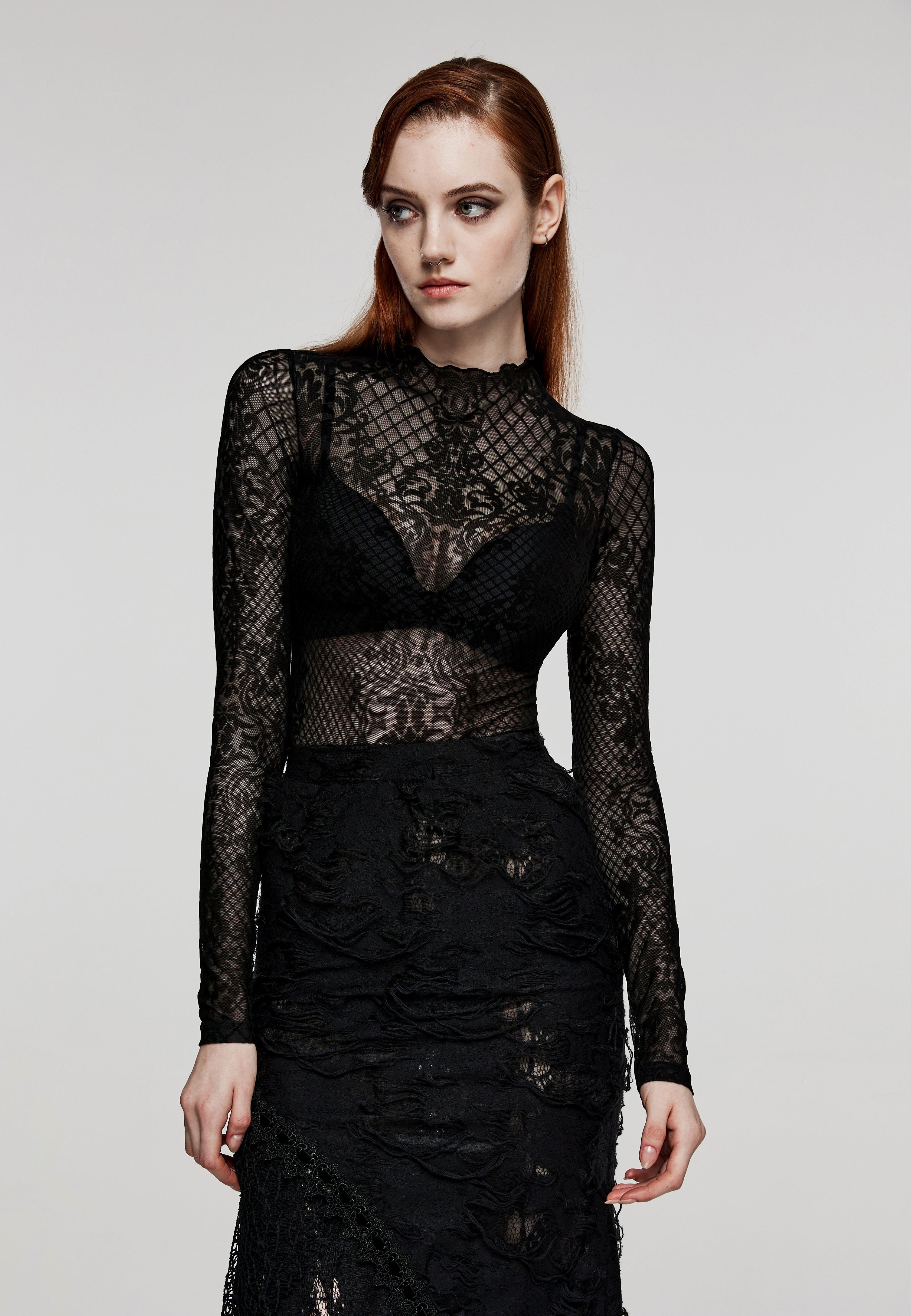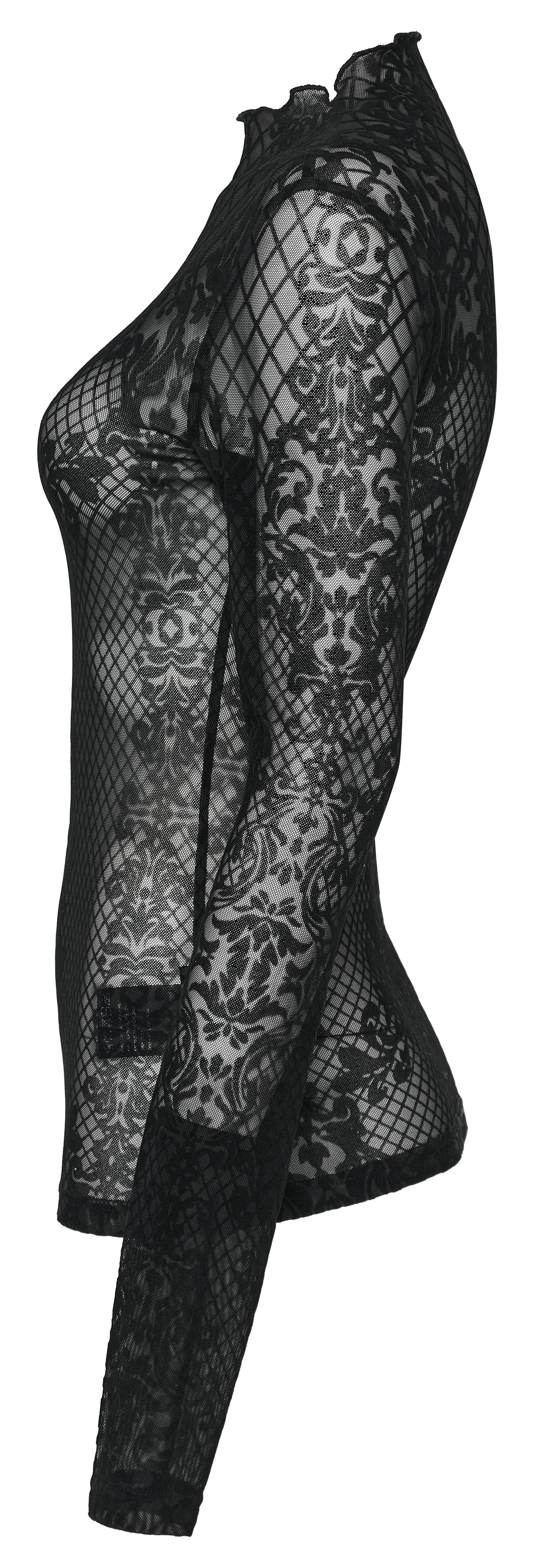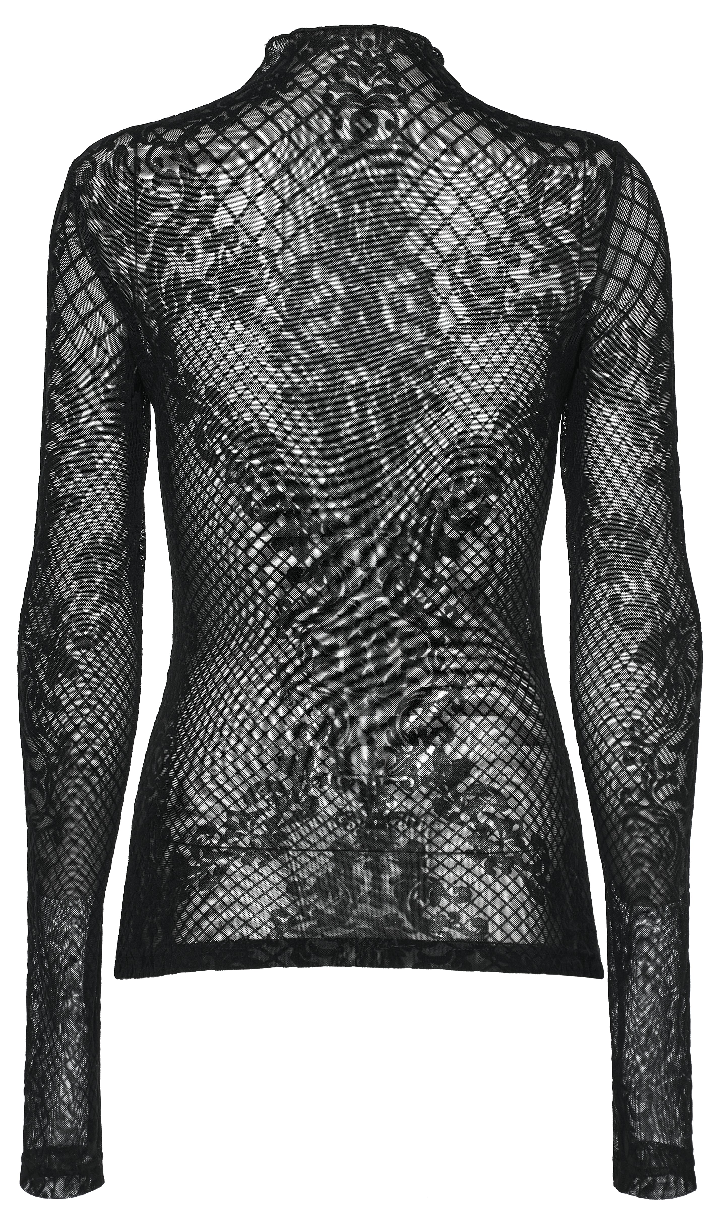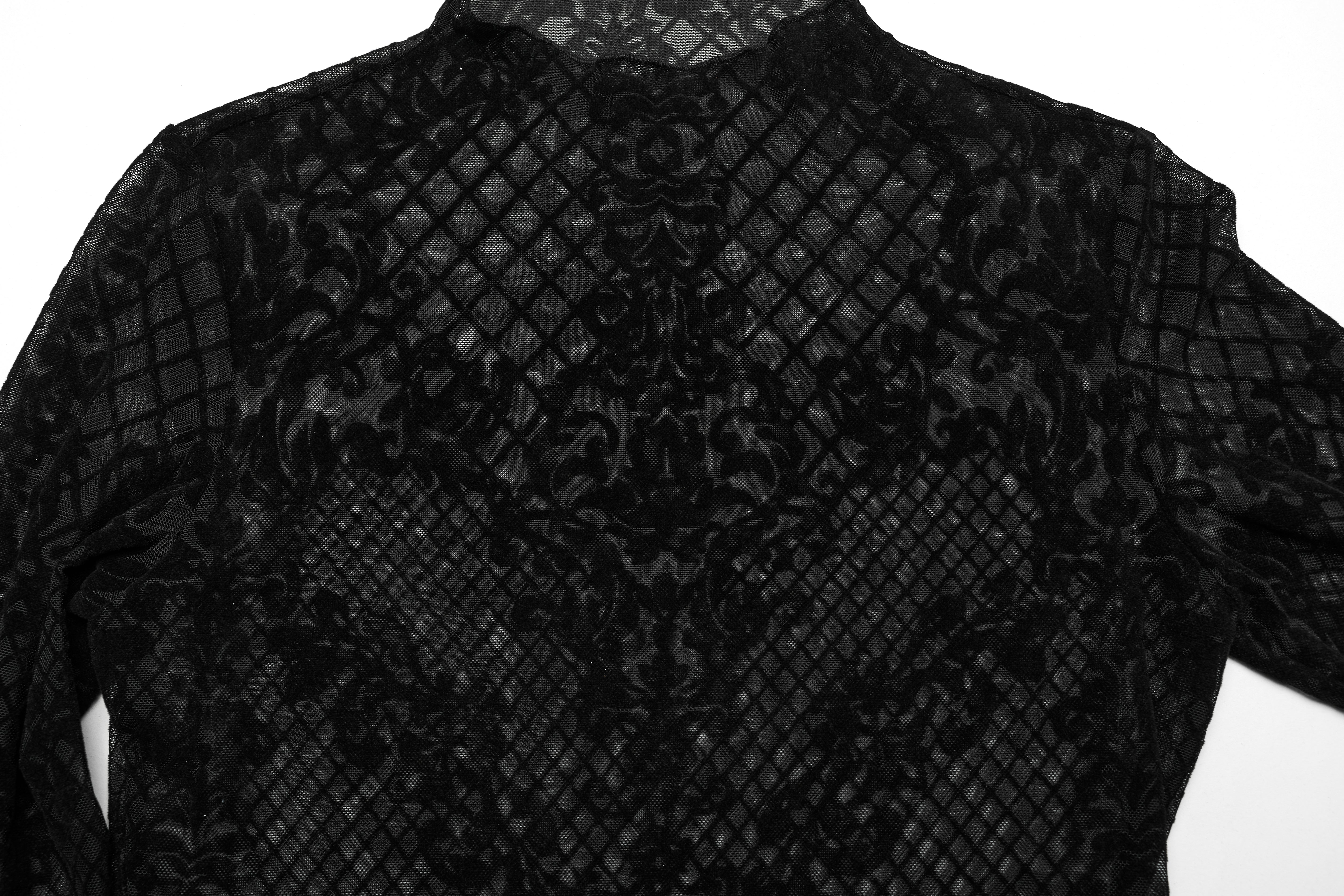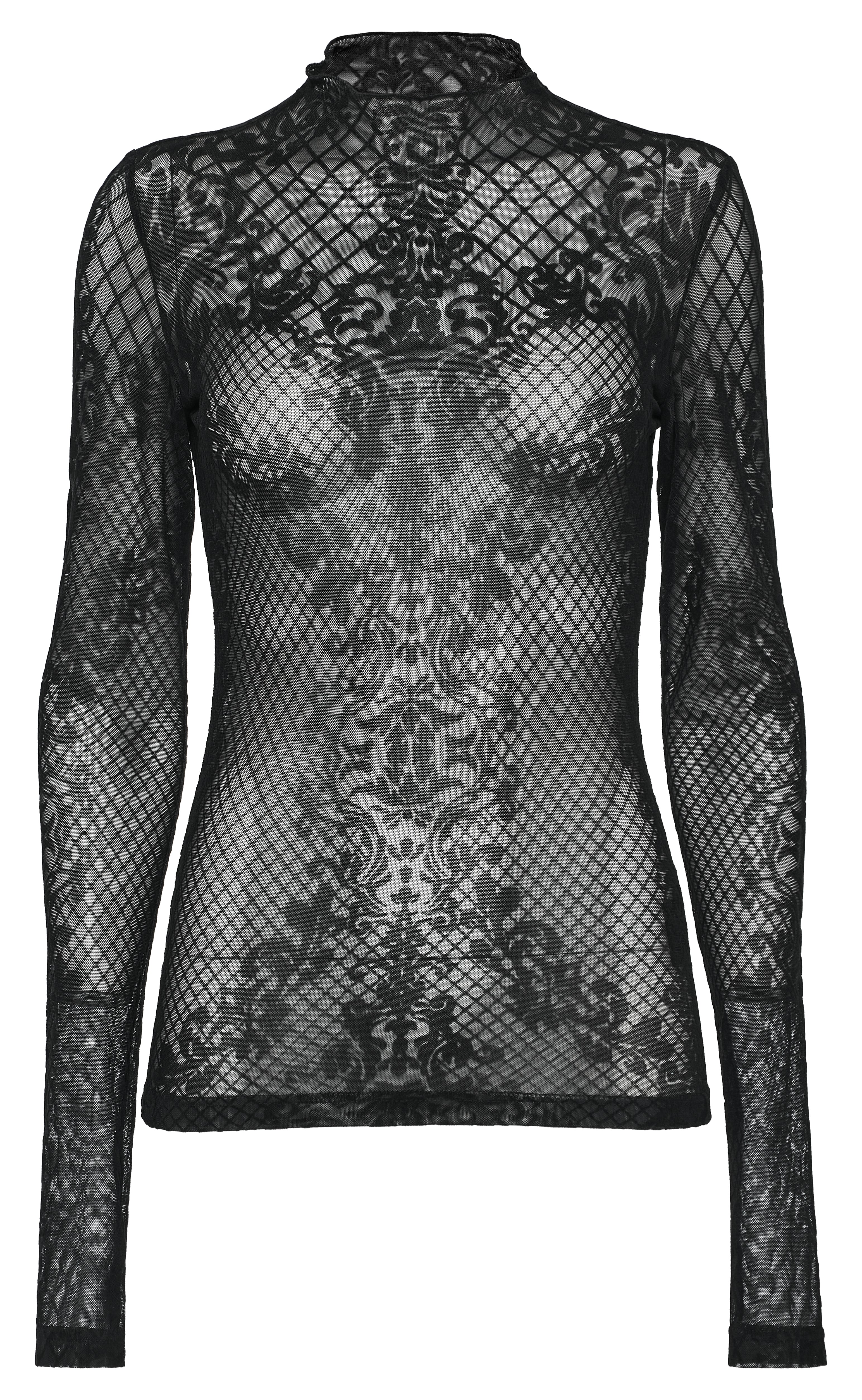 Dieses schwarze Netzoberteil für Damen besticht durch sein auffälliges Samt-Flock-Spitzenmuster und lange Ärmel. Der hohe Kragen verleiht dem Design eine verführerische Note, während das dehnbare Mesh für ein angenehmes Tragegefühl sorgt. Ein gewagtes Statement für selbstbewusste Looks.