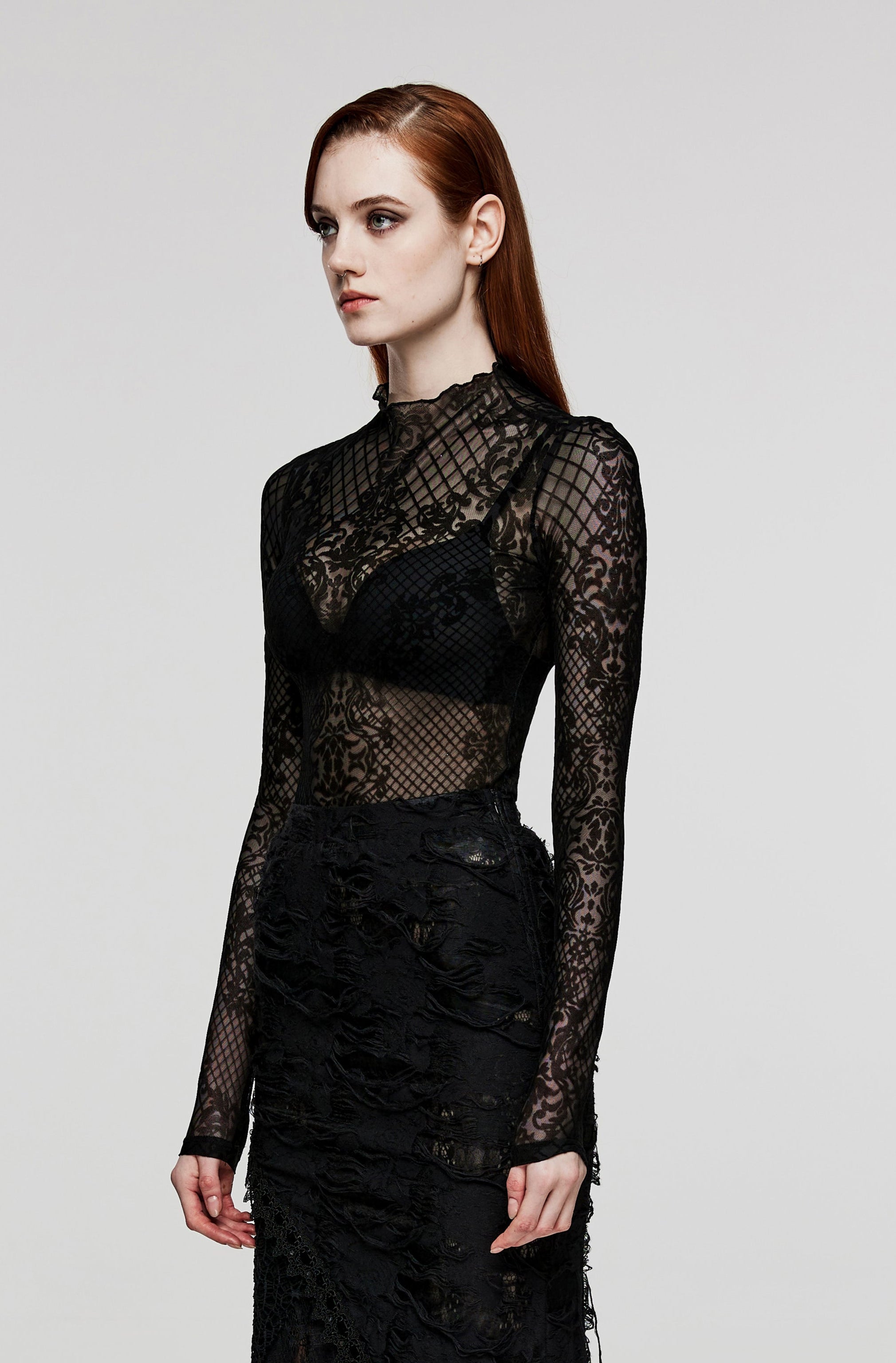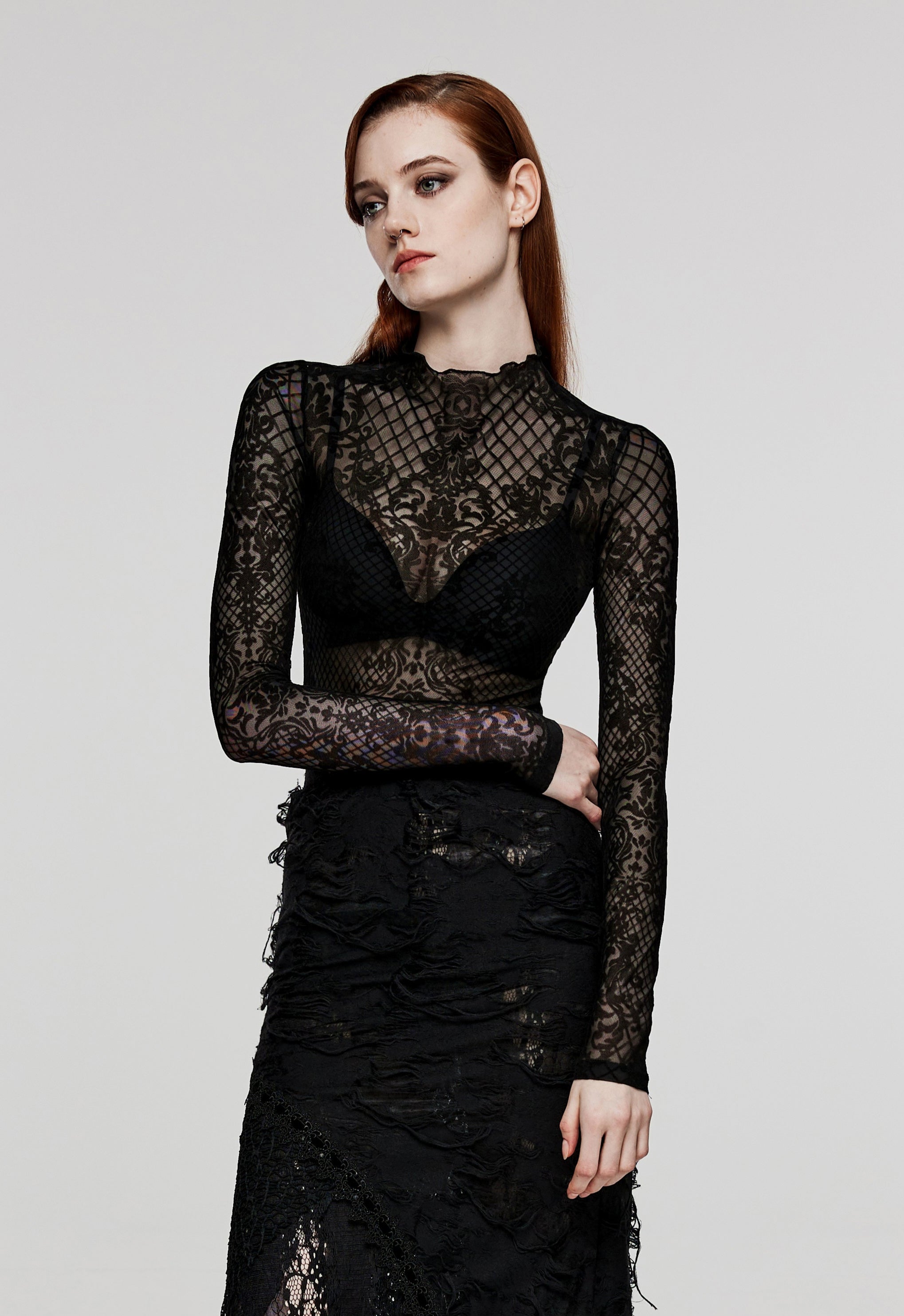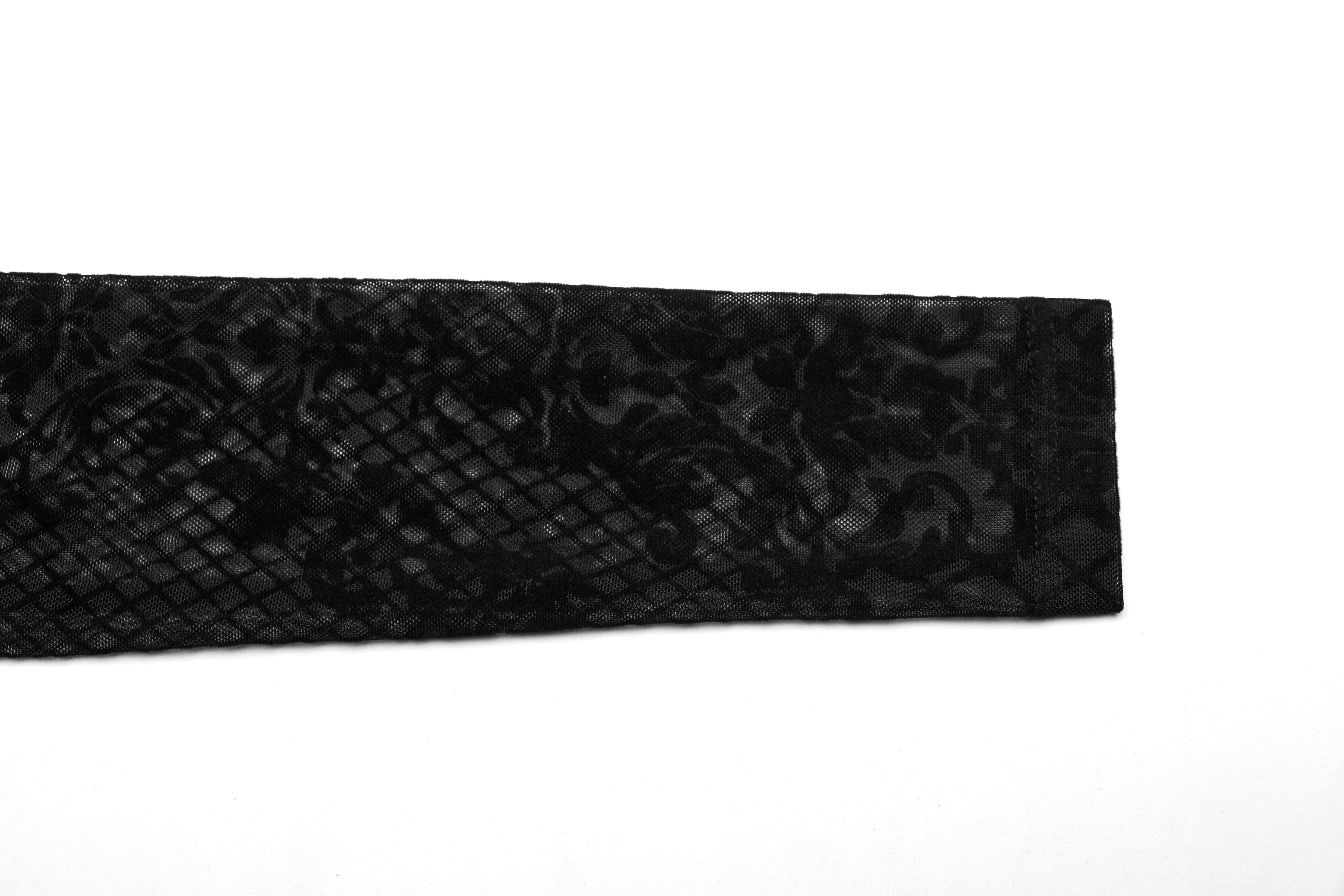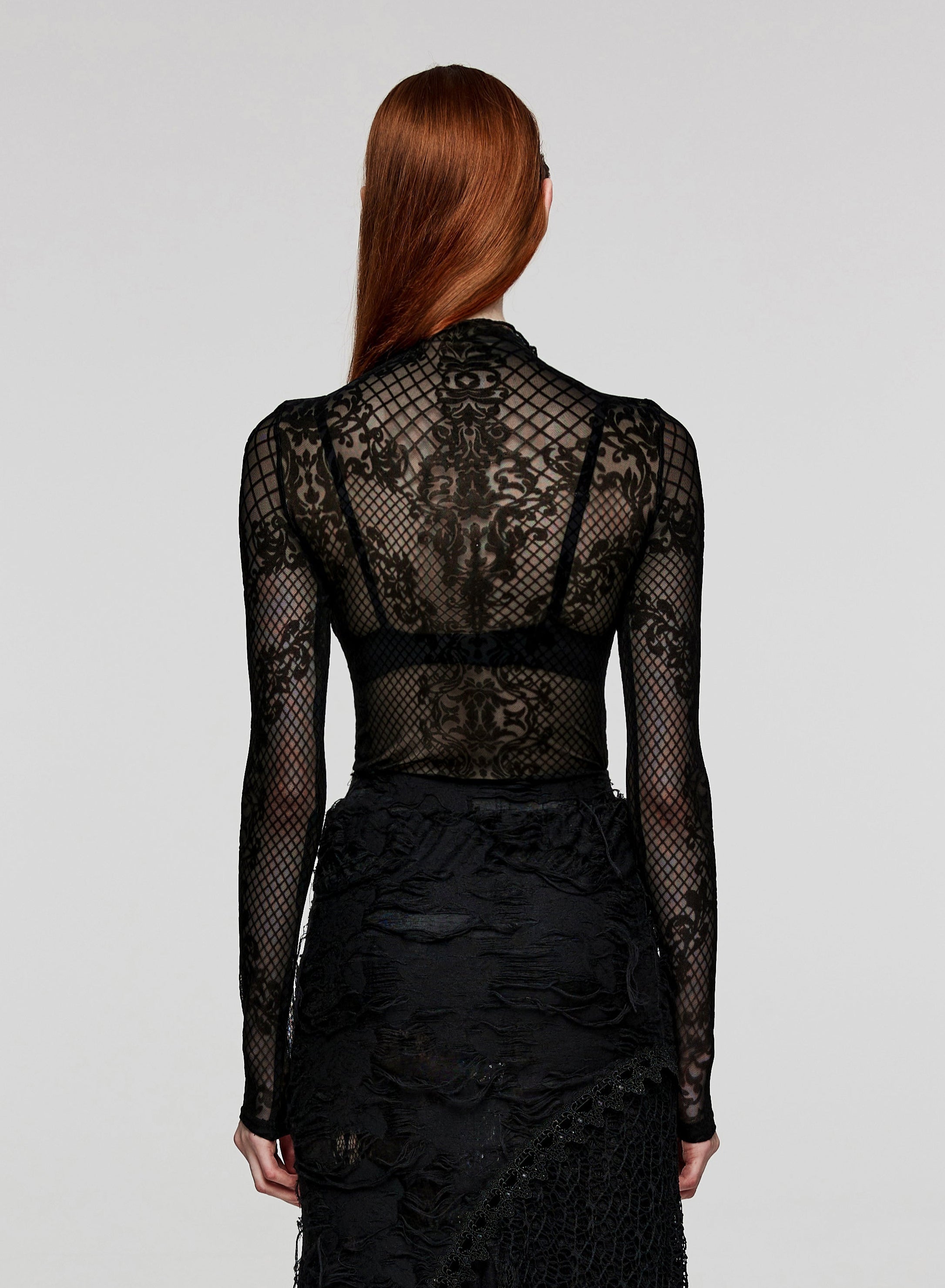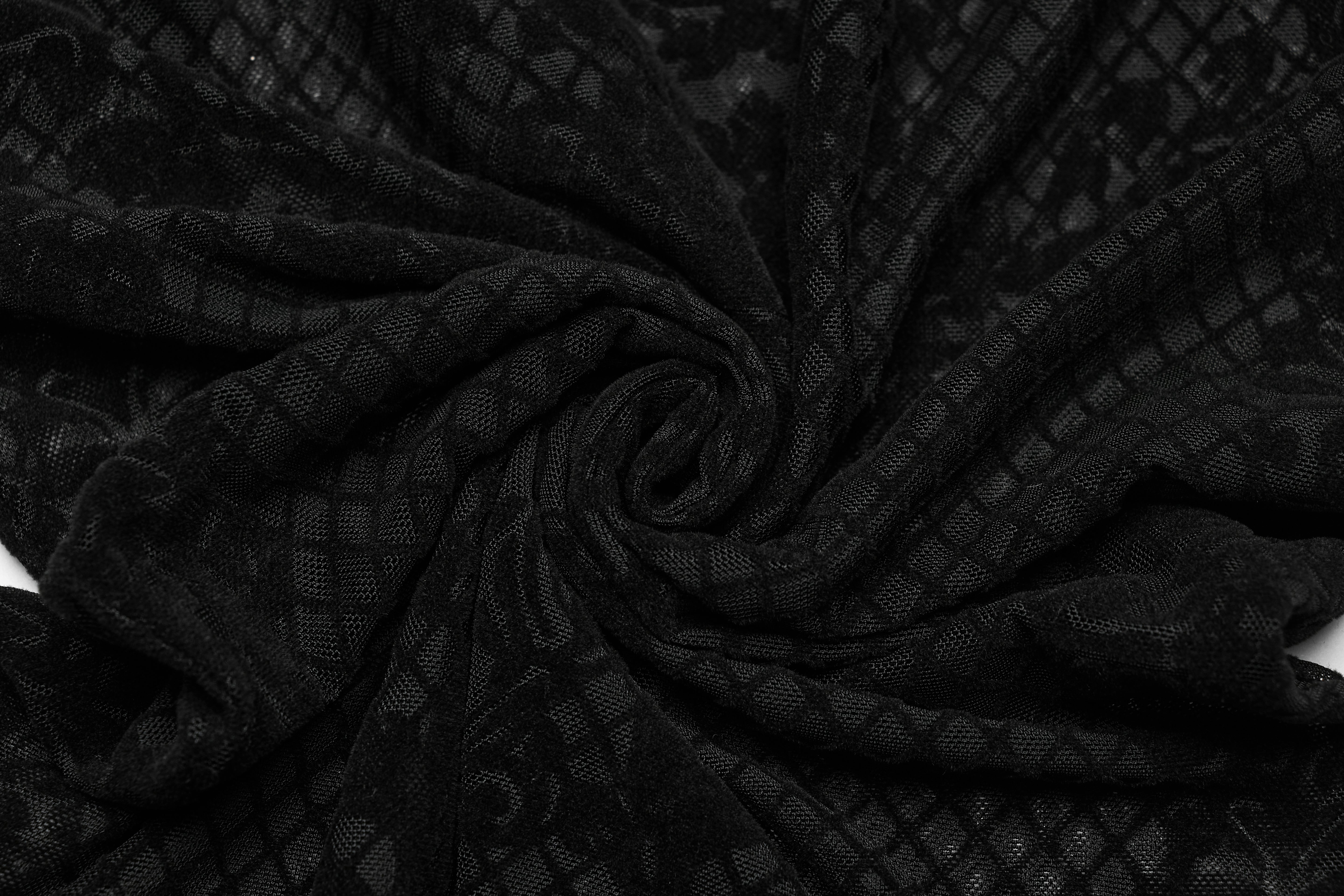 Dieses schwarze Netzoberteil für Damen besticht durch sein auffälliges Samt-Flock-Spitzenmuster und lange Ärmel. Der hohe Kragen verleiht dem Design eine verführerische Note, während das dehnbare Mesh für ein angenehmes Tragegefühl sorgt. Ein gewagtes Statement für selbstbewusste Looks.