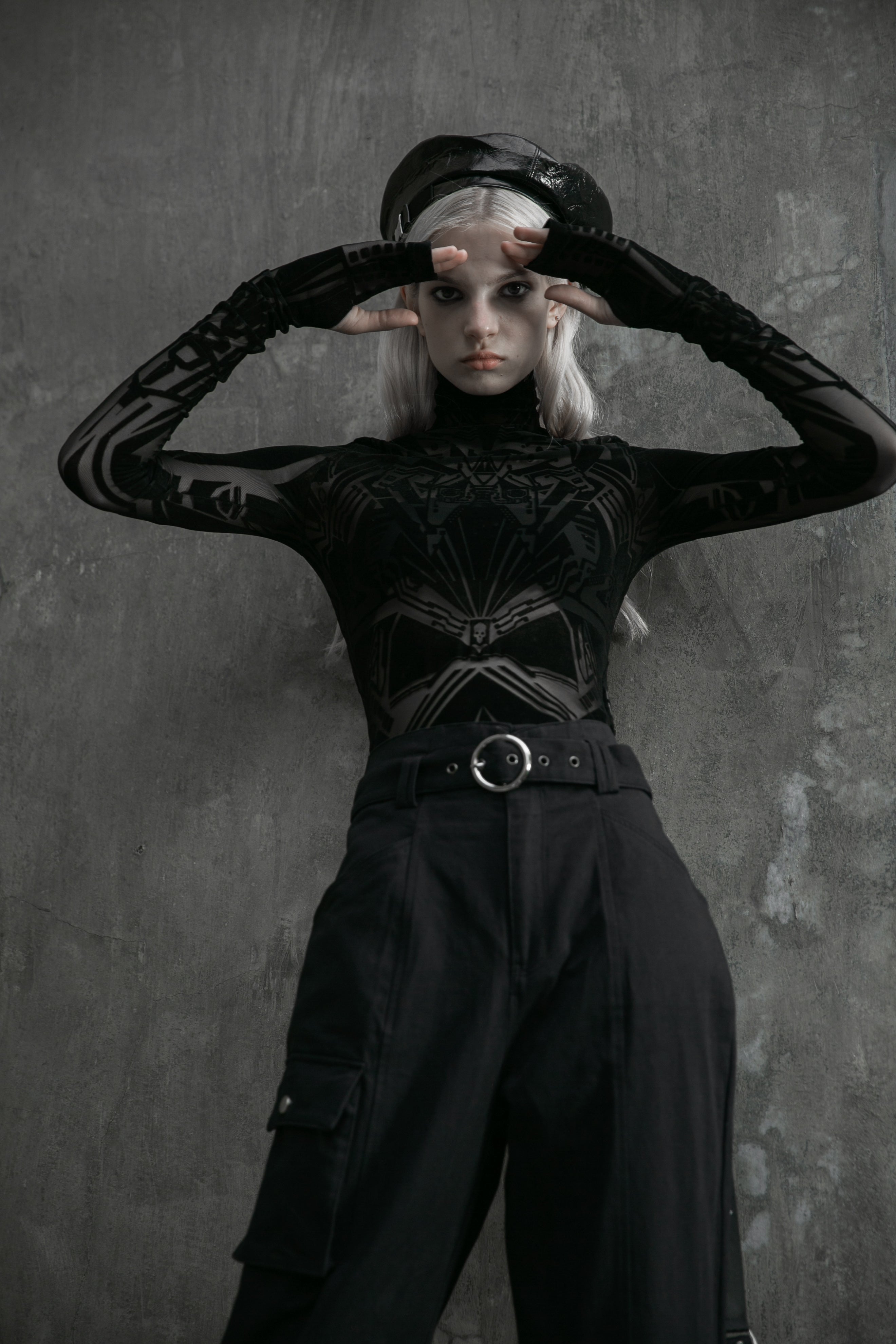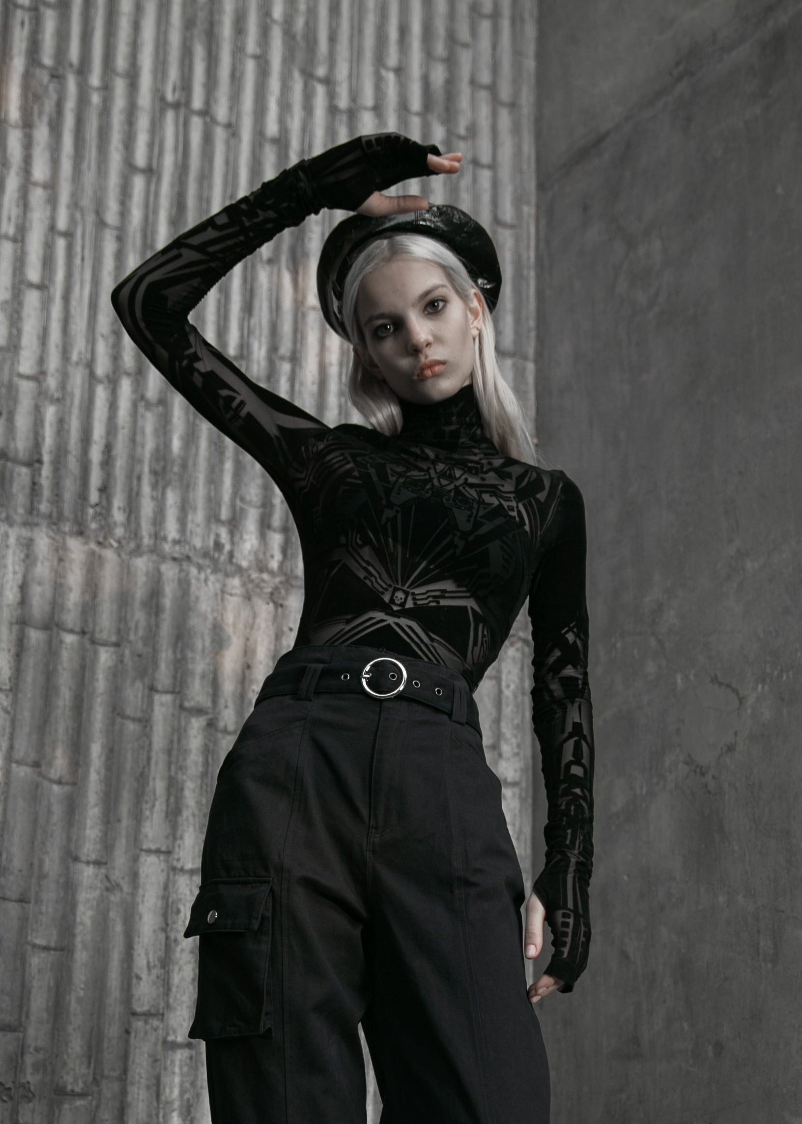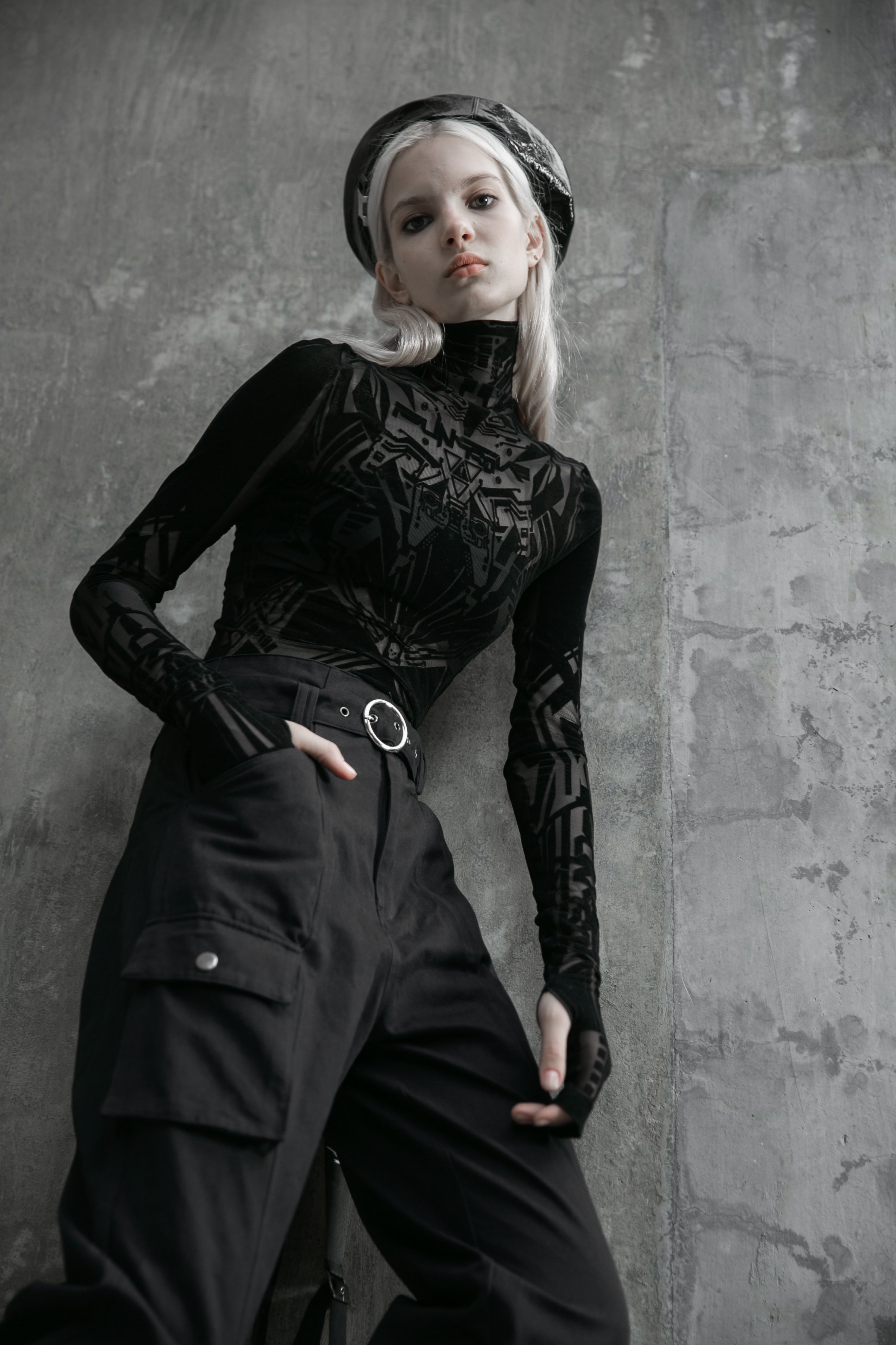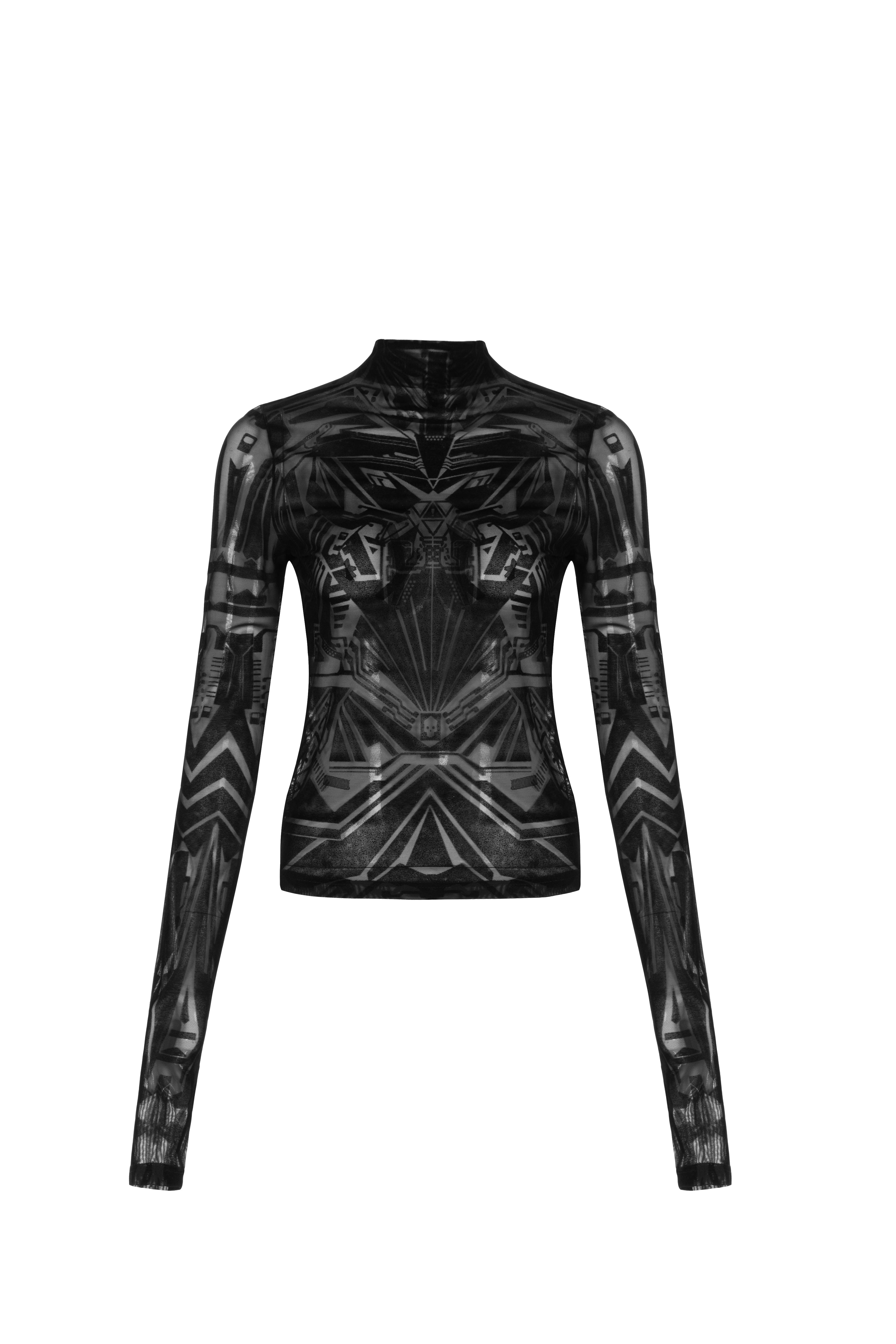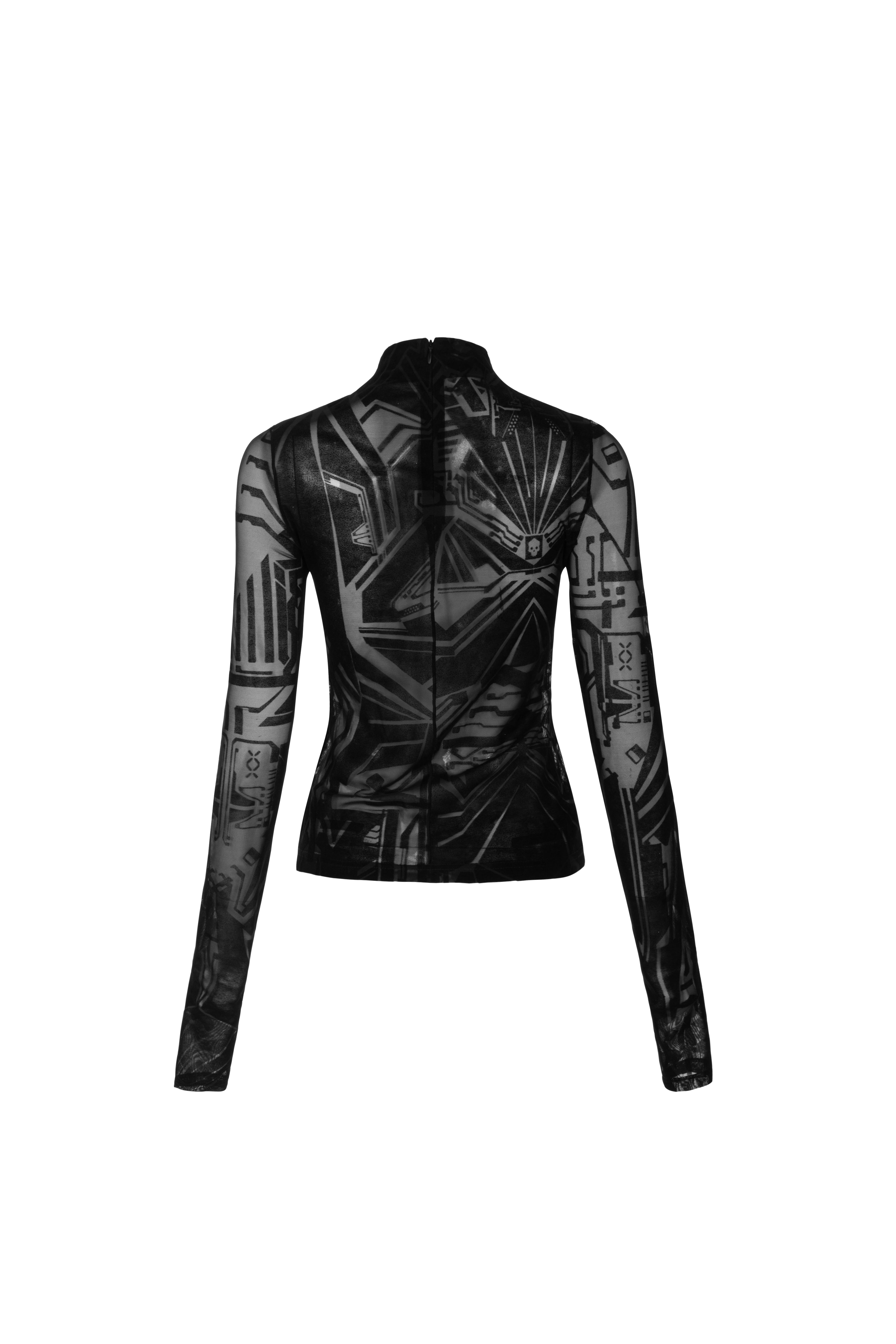 Mesh-Gewebe kombiniert mit samtigem Flockdruck und überlangen Ärmel mit stylischen Daumenlöchern und einem hoher Kragen. Versteckter Reißverschluss auf der Rückseite. Das Oberteil ist leicht dehnbar, sitzt im Brustbereich eher eng, daher empfehlen wir eine Nummer Größer zu nehmen.