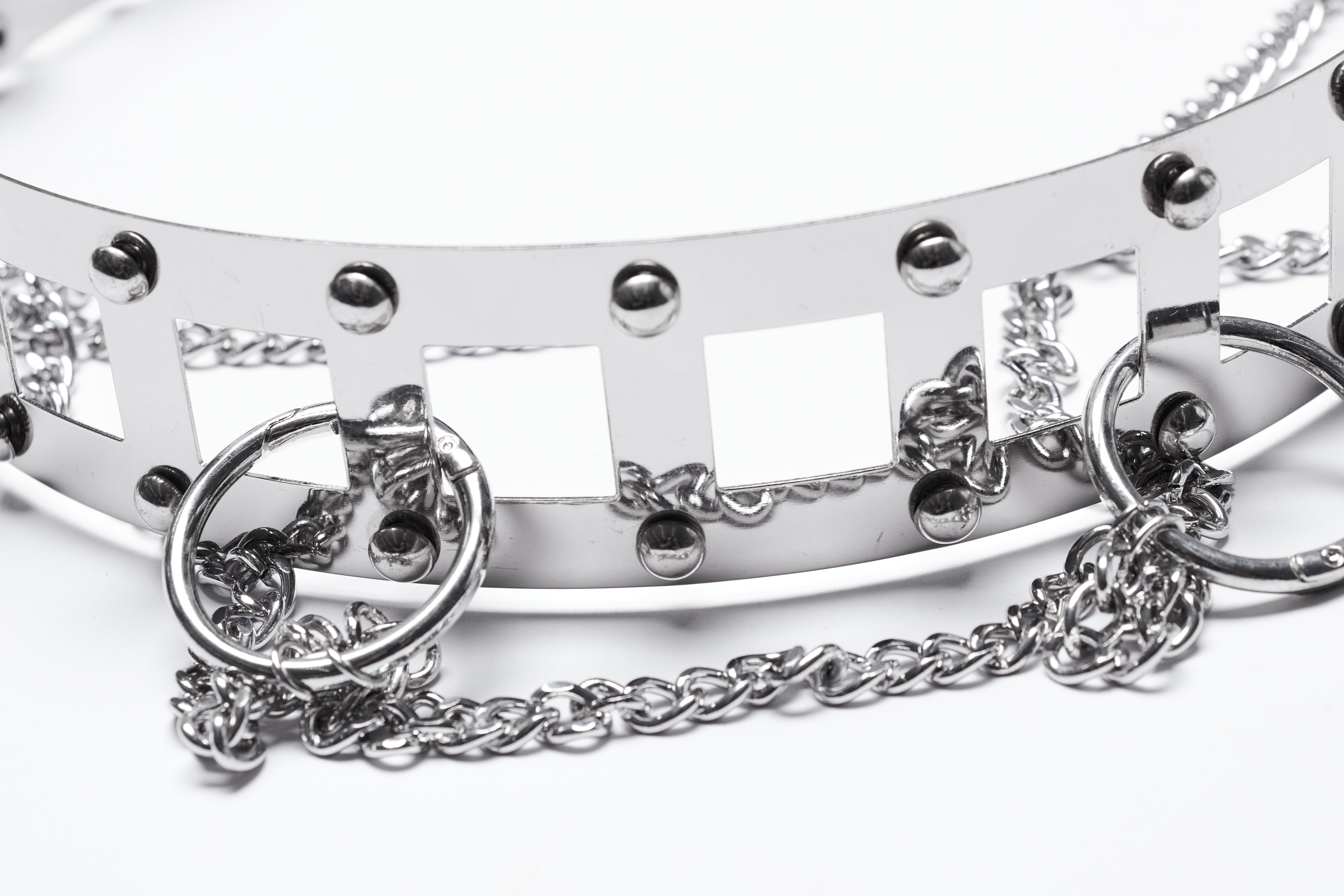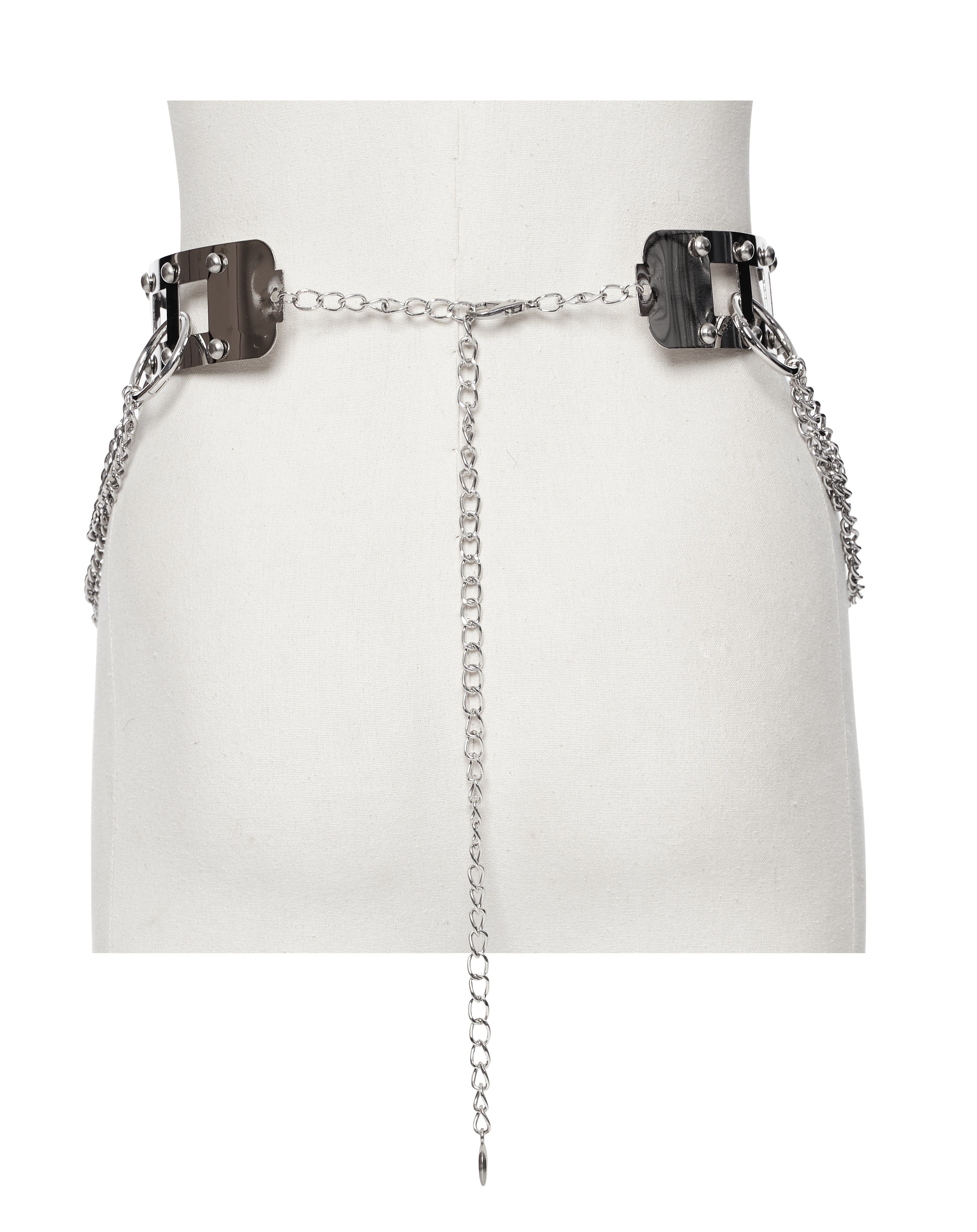 Der Metallgürtel in silbernem Finish besticht durch quadratische Ausschnitte und abnehmbare Ketten, die an Ringen hängen. Der Metall Gürtel verbindet industriellen Charme mit punkiger Wildheit und setzt ein kraftvolles Statement für alle, die das Unkonventionelle lieben. Sein markantes Design und die auffälligen Details verleihen jedem Look eine rebellische Energie. Aus robustem, glänzendem Metall mit rostbeständiger Eisenbasis gefertigt, garantiert er Langlebigkeit. Entfessle deine wilde Seite mit diesem ausdrucksstarken Accessoire.