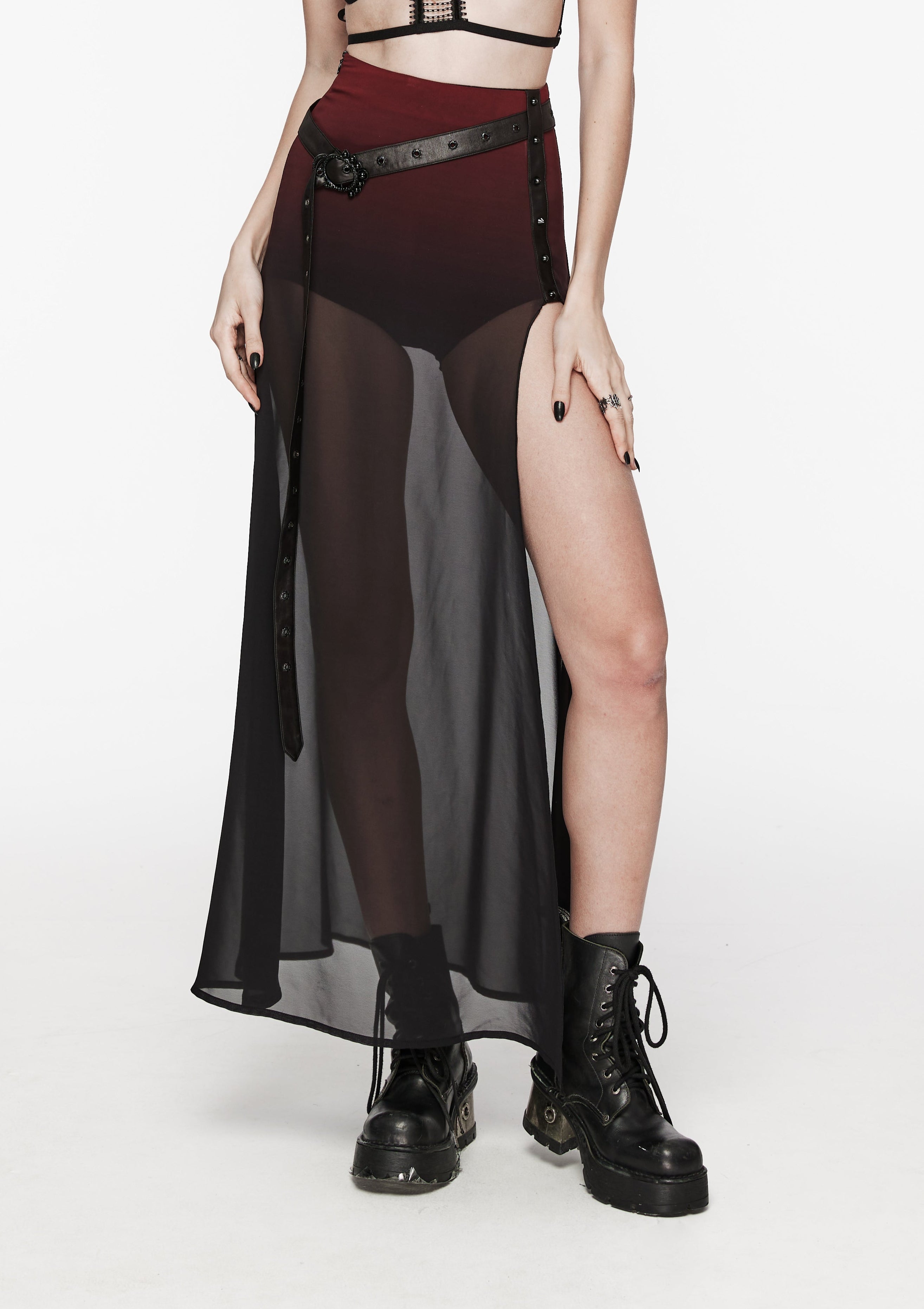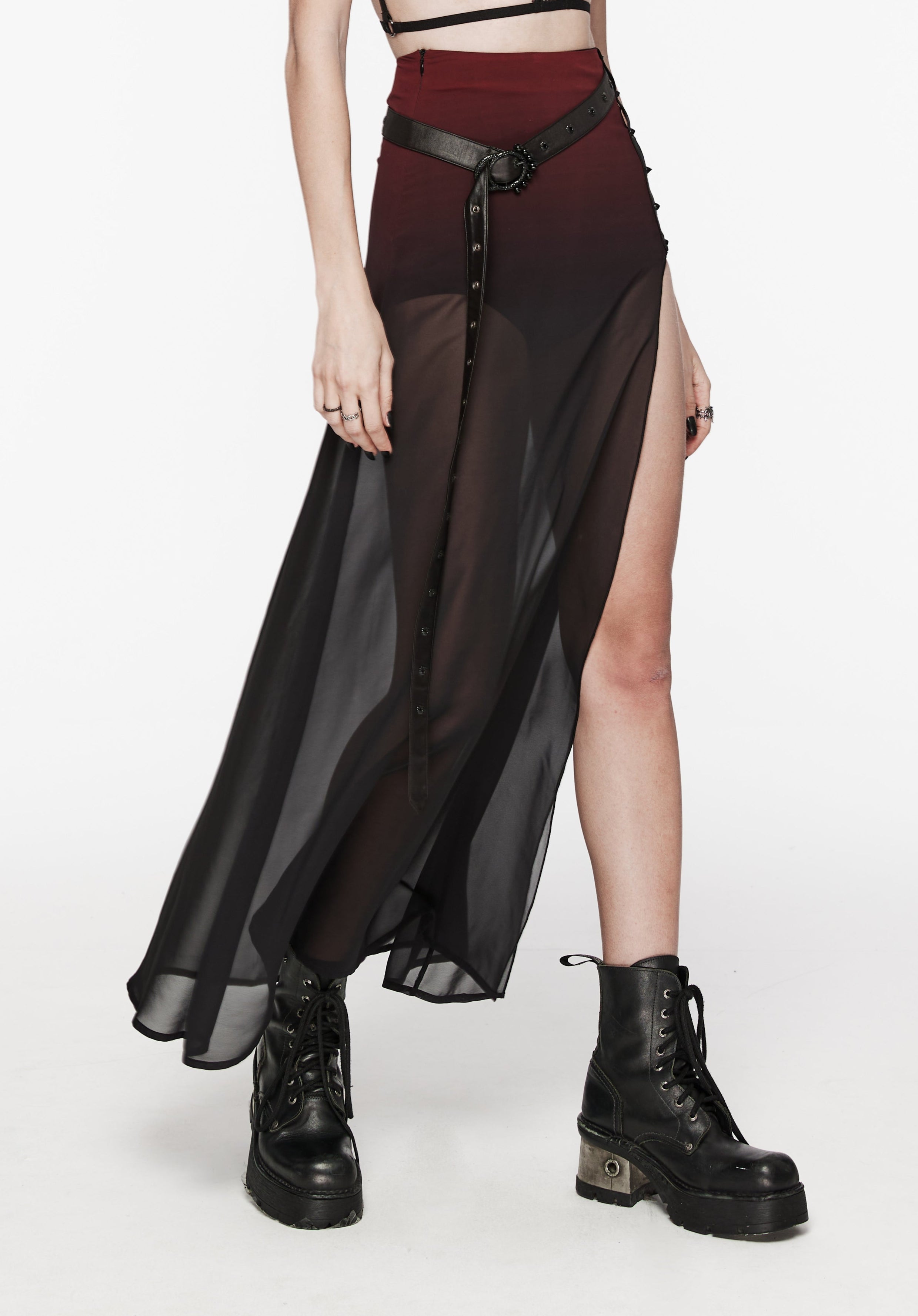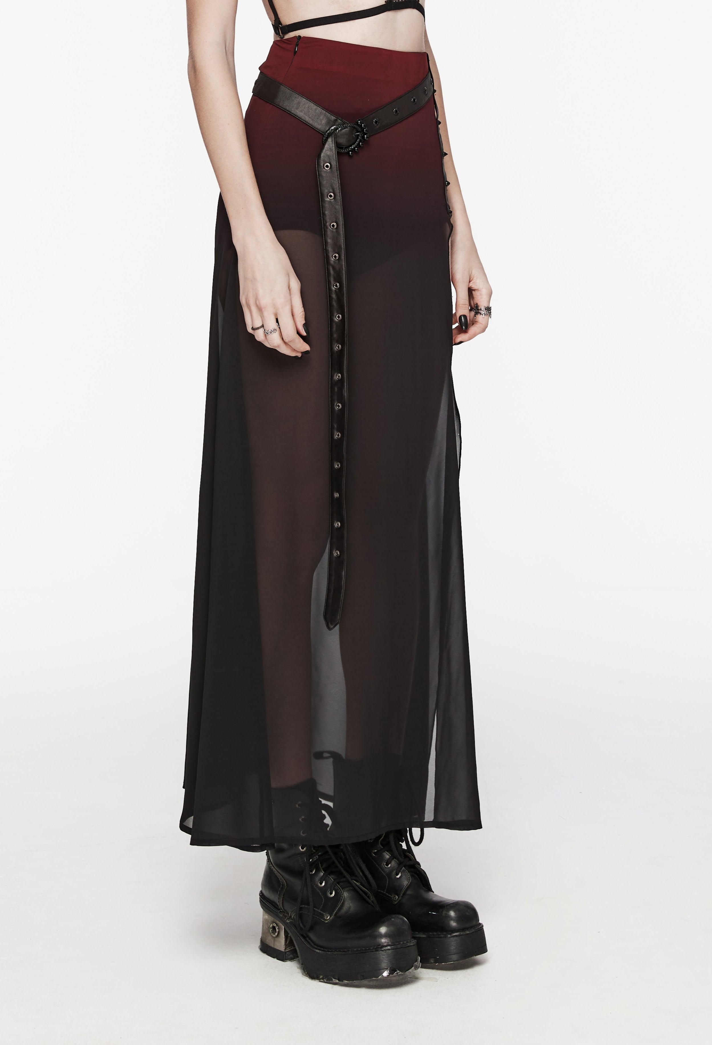 Dieser Maxirock besticht durch seinen verführerischen hohen Schlitz und das schmeichelhafte A-Linien-Design aus Chiffon. Der mitgelieferte Taillengürtel betont Ihre Silhouette, während der sanfte Farbverlauf von Dunkelrot zu Schwarz für einen dramatischen Look sorgt. Ein unauffälliger Seitenreißverschluss macht das Anziehen mühelos. Perfekt, um selbstbewusst und elegant aufzutreten.