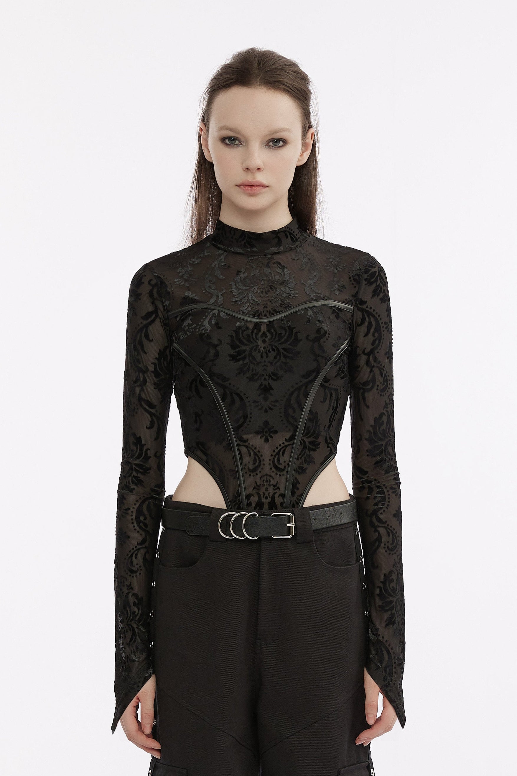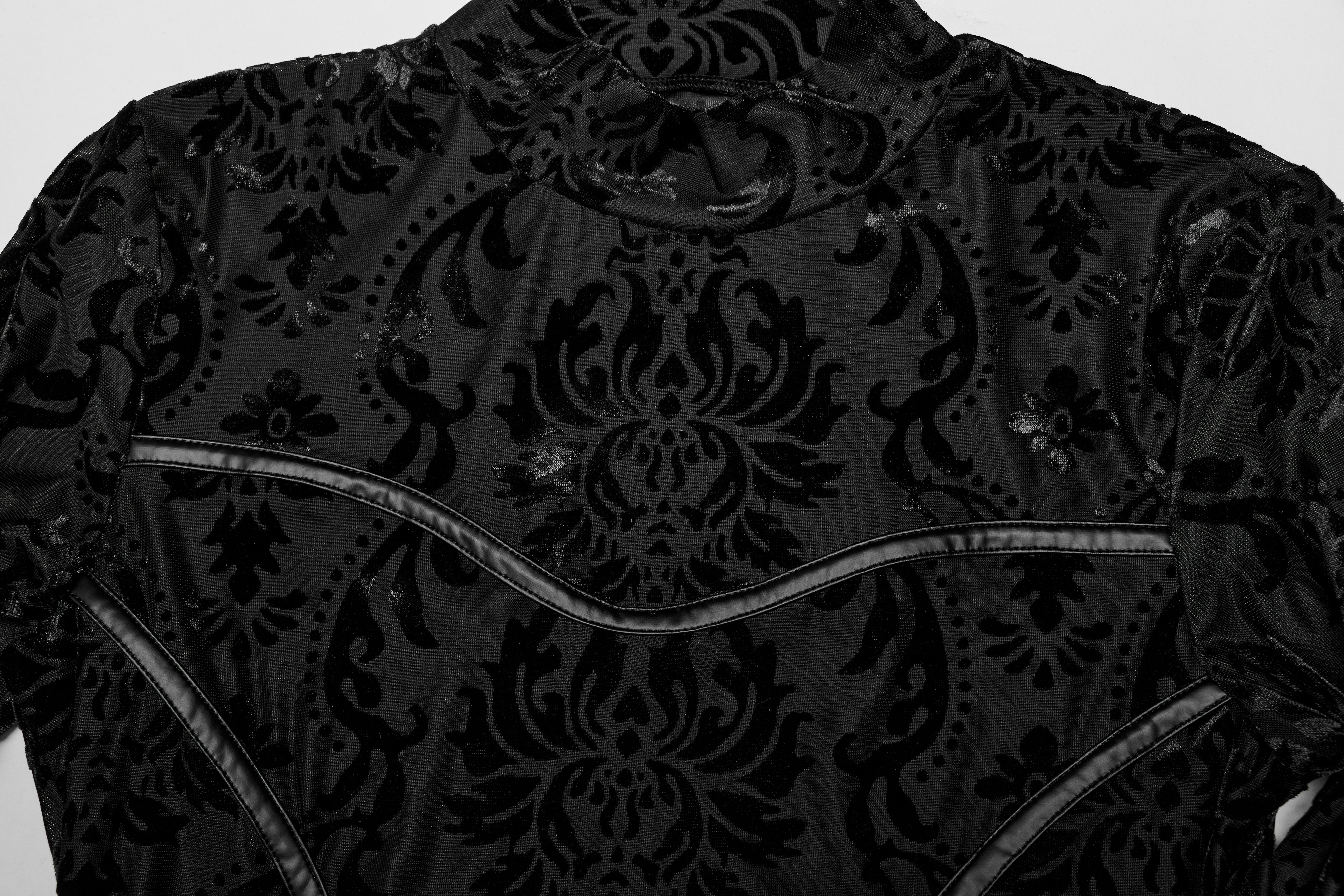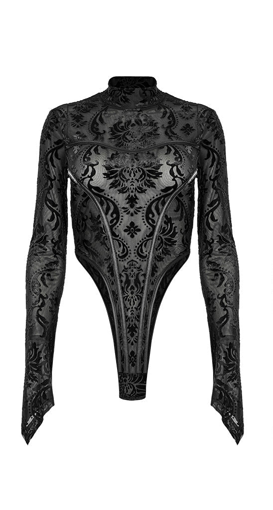 Dieses schwarze, dehnbare Netzgewebe besticht durch einen samtigen Damastdruck und eine figurbetonte Passform. Lange, spitze Ärmel und ein hoher Kragen verleihen dem Look eine verführerische Note. Die hochgeschnittenen Beinausschnitte und dekorativen Nähte setzen reizvolle Akzente, während der Druckknopfverschluss im Schritt für praktischen Komfort sorgt.