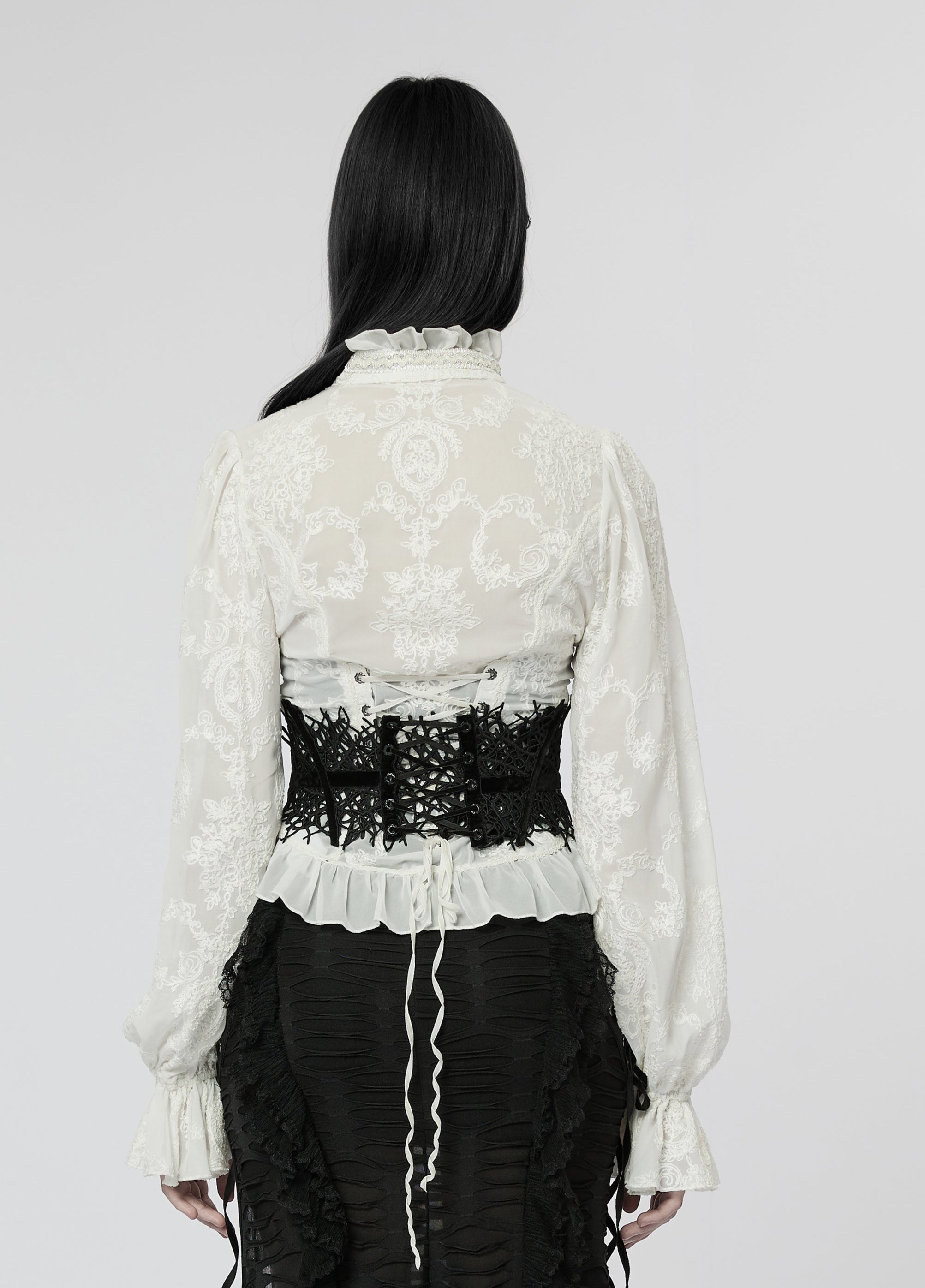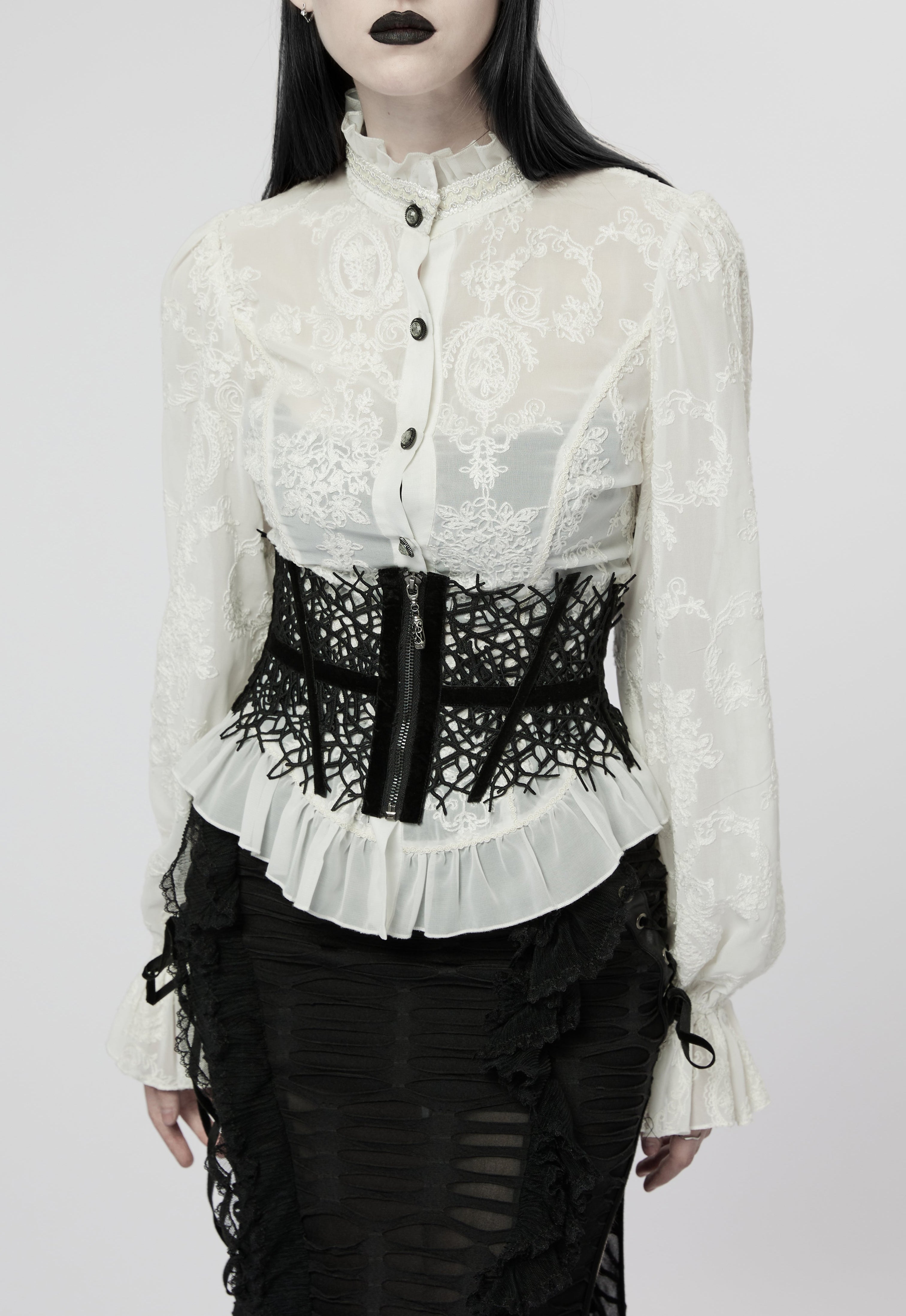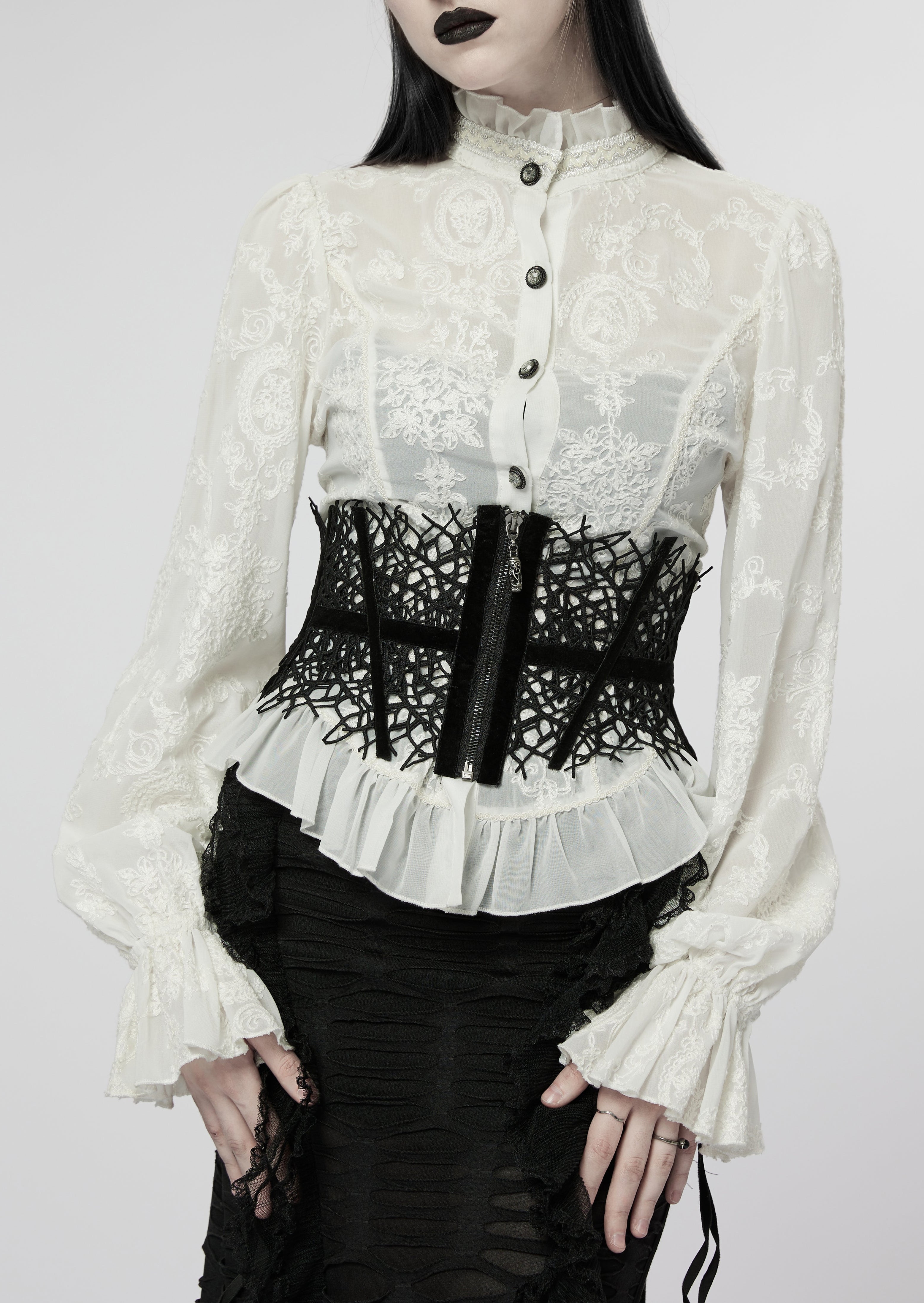 Dieser Miedergürtel besticht durch ein markantes Weinrebenmuster und einen vorderen Reißverschluss, der das An- und Ausziehen mühelos macht. Die Rückenschnürung ermöglicht eine individuelle Anpassung, während das harte, nicht elastische Netz in Form einer verwelkten Ranke für eine auffällige, kantige Optik sorgt. Das kreative Korsett vereint exklusives Samtgewebe, das die Struktur betont und die Enge am Rücken präzise reguliert – perfekt für einen gewagten, einzigartigen Look.