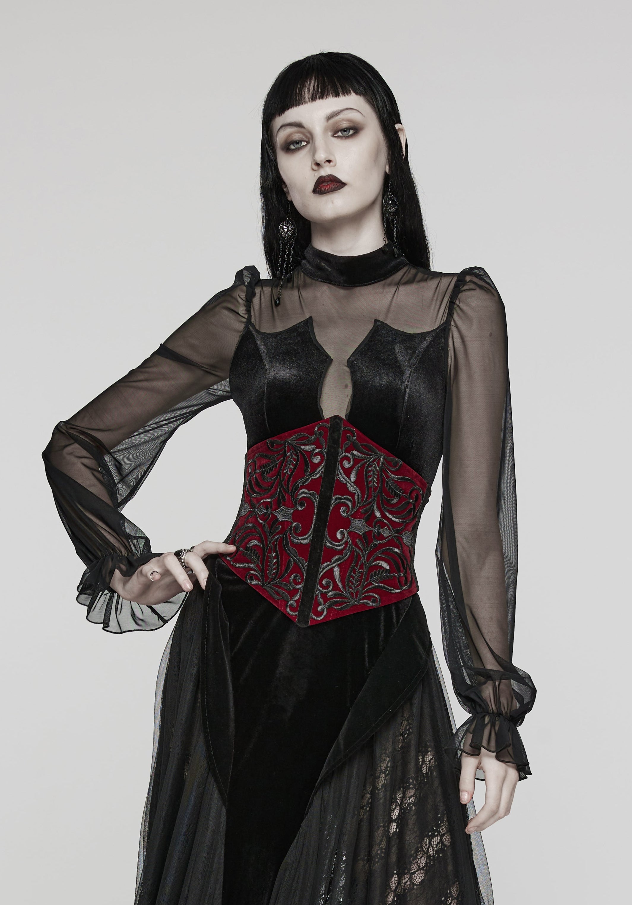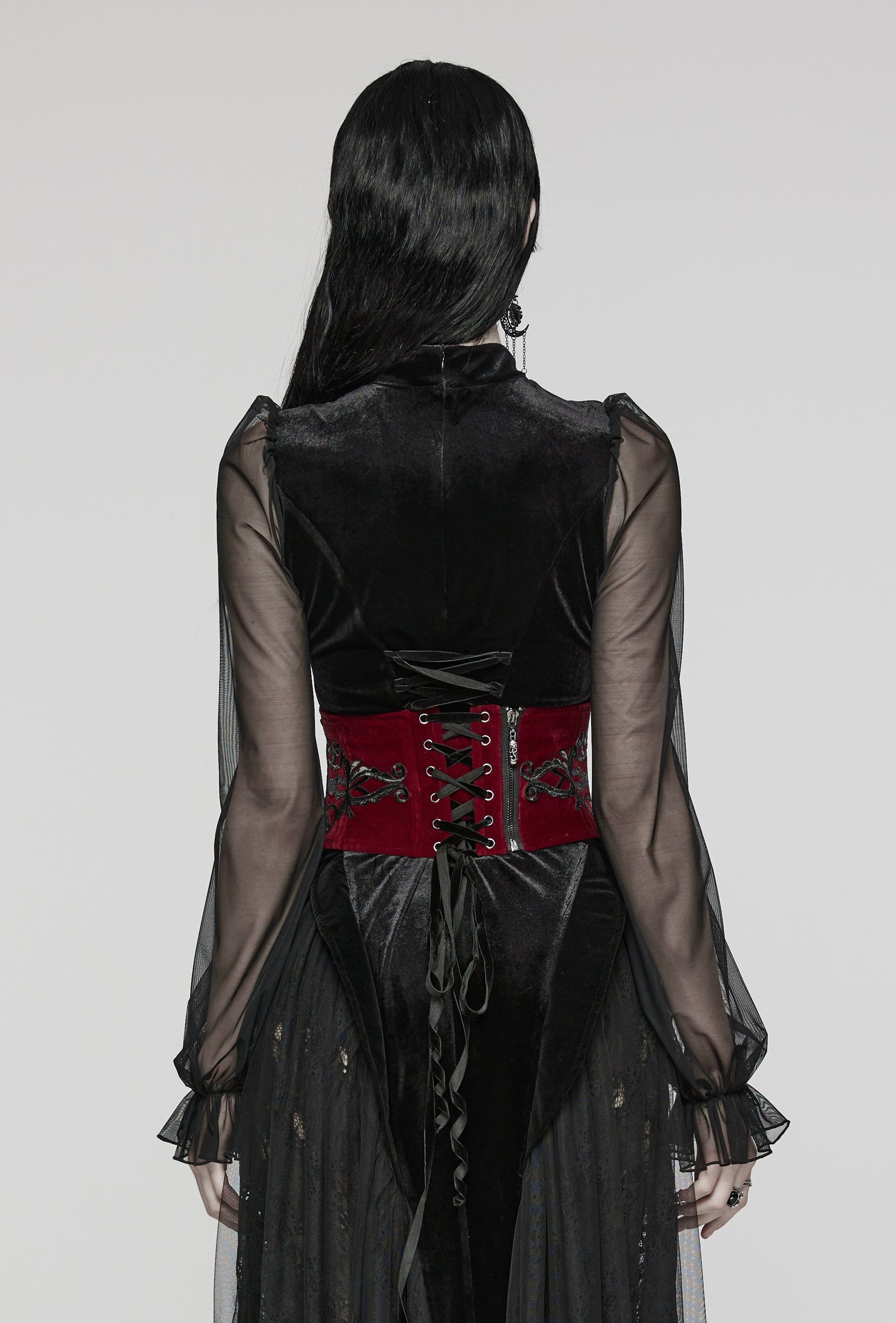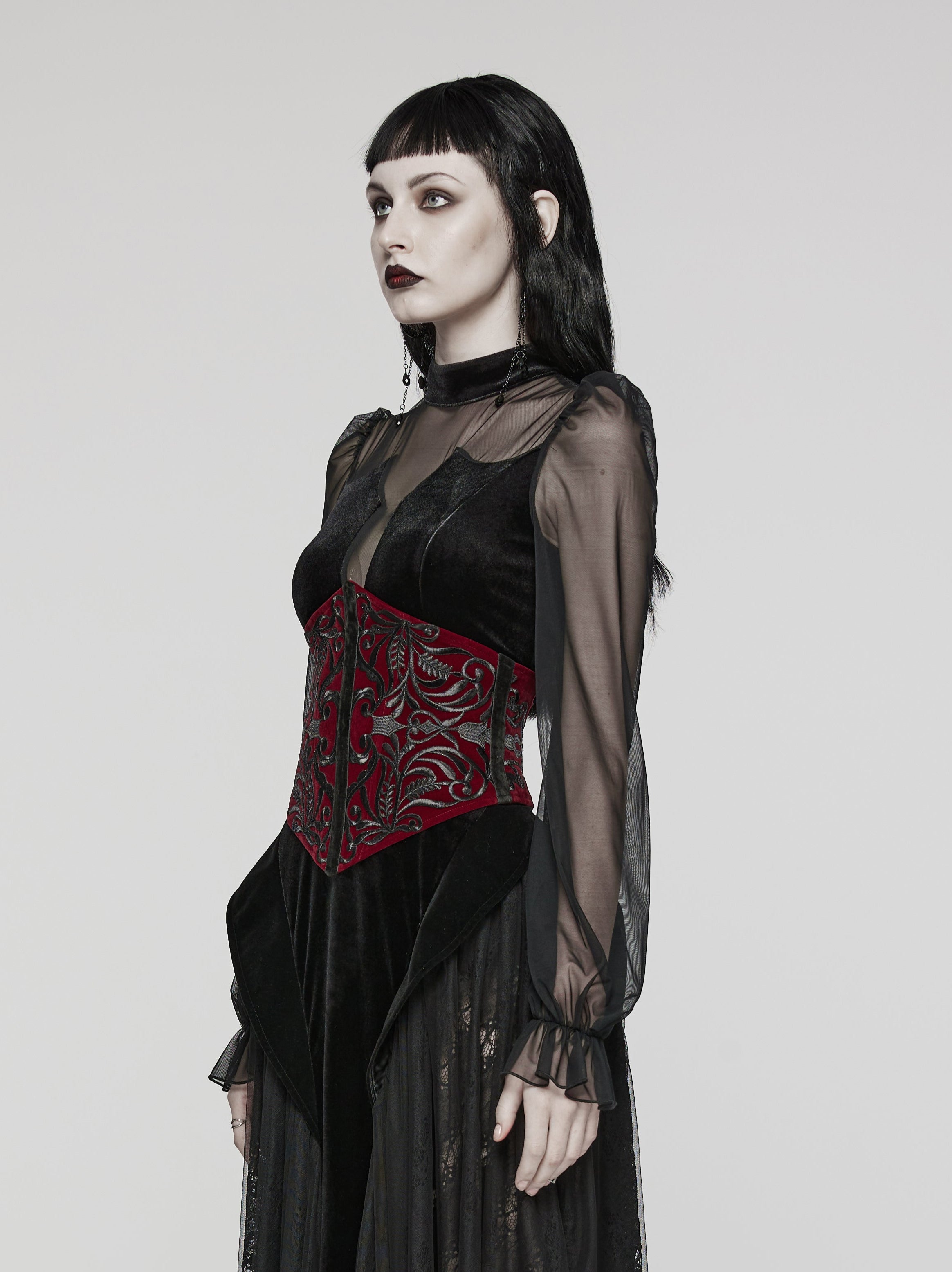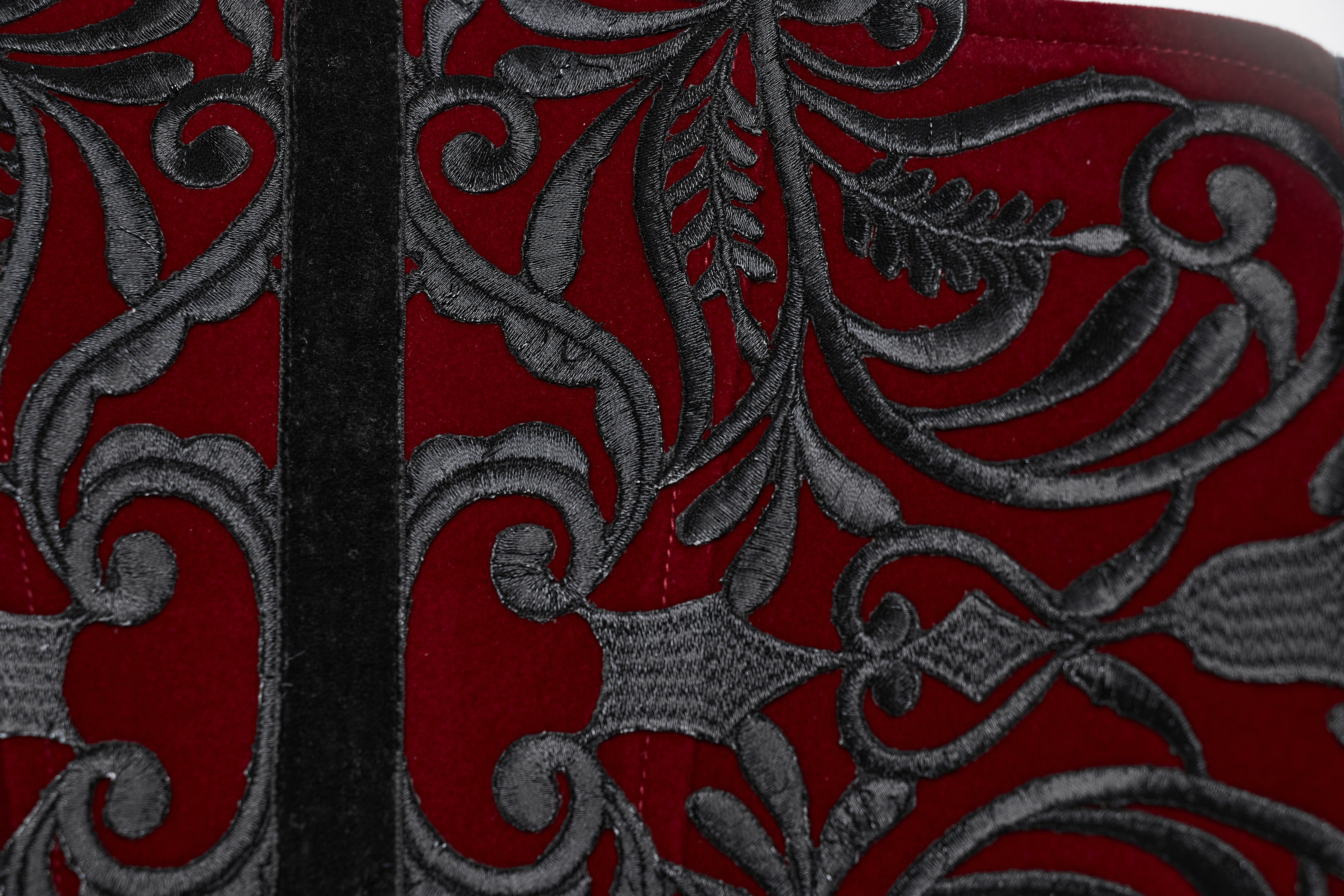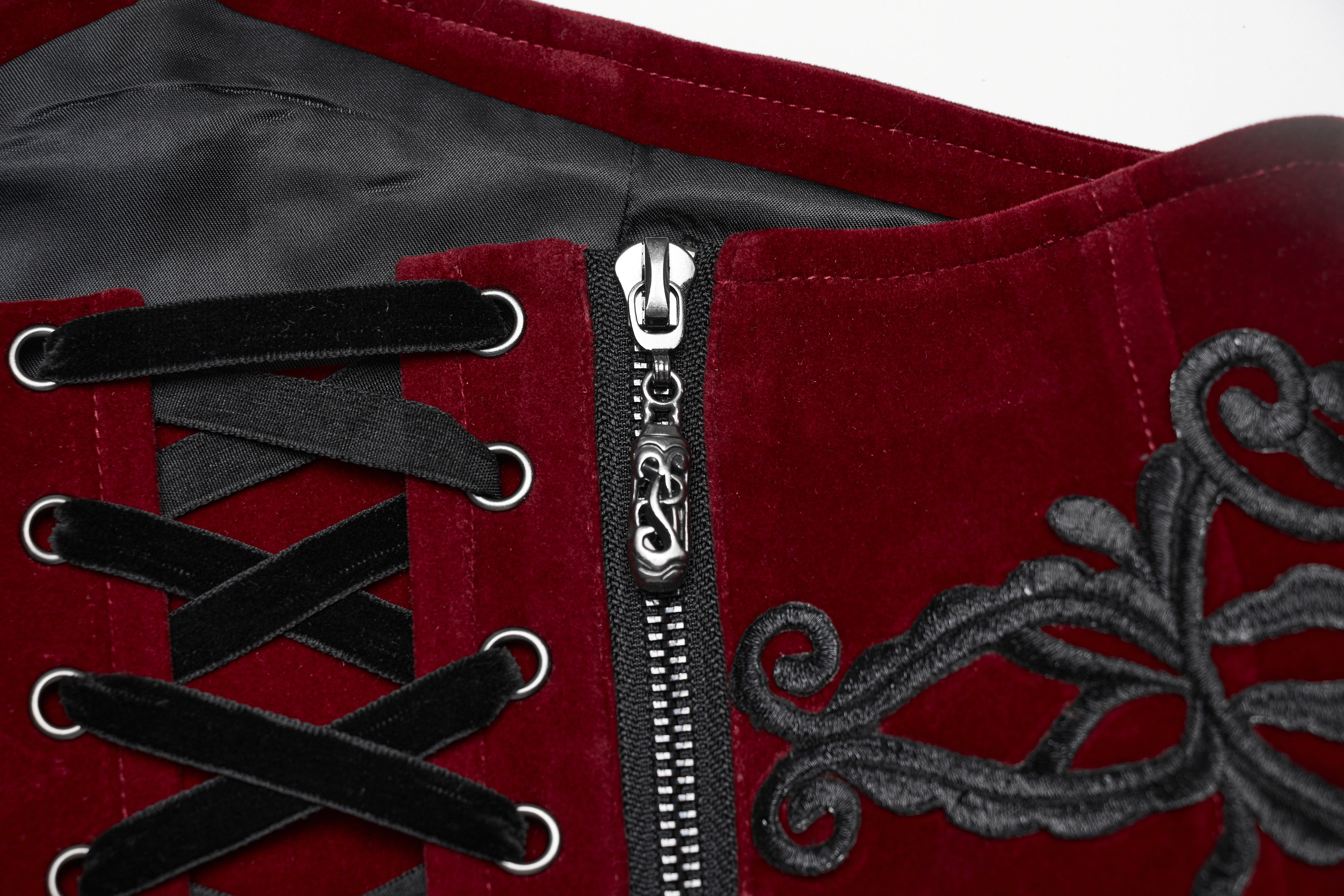 Erlebe königliche Eleganz mit diesem verführerischen, rotem Samt-Miedergürtel für Damen. Das kunstvoll bestickte, gotische Design in Schwarz setzt ein dramatisches Statement, während die Schnürung hinten und der Reißverschluss für eine perfekte Passform sorgen. Die Kunststoffstäbchen formen die Taille und verleihen dir eine verführerische Silhouette.