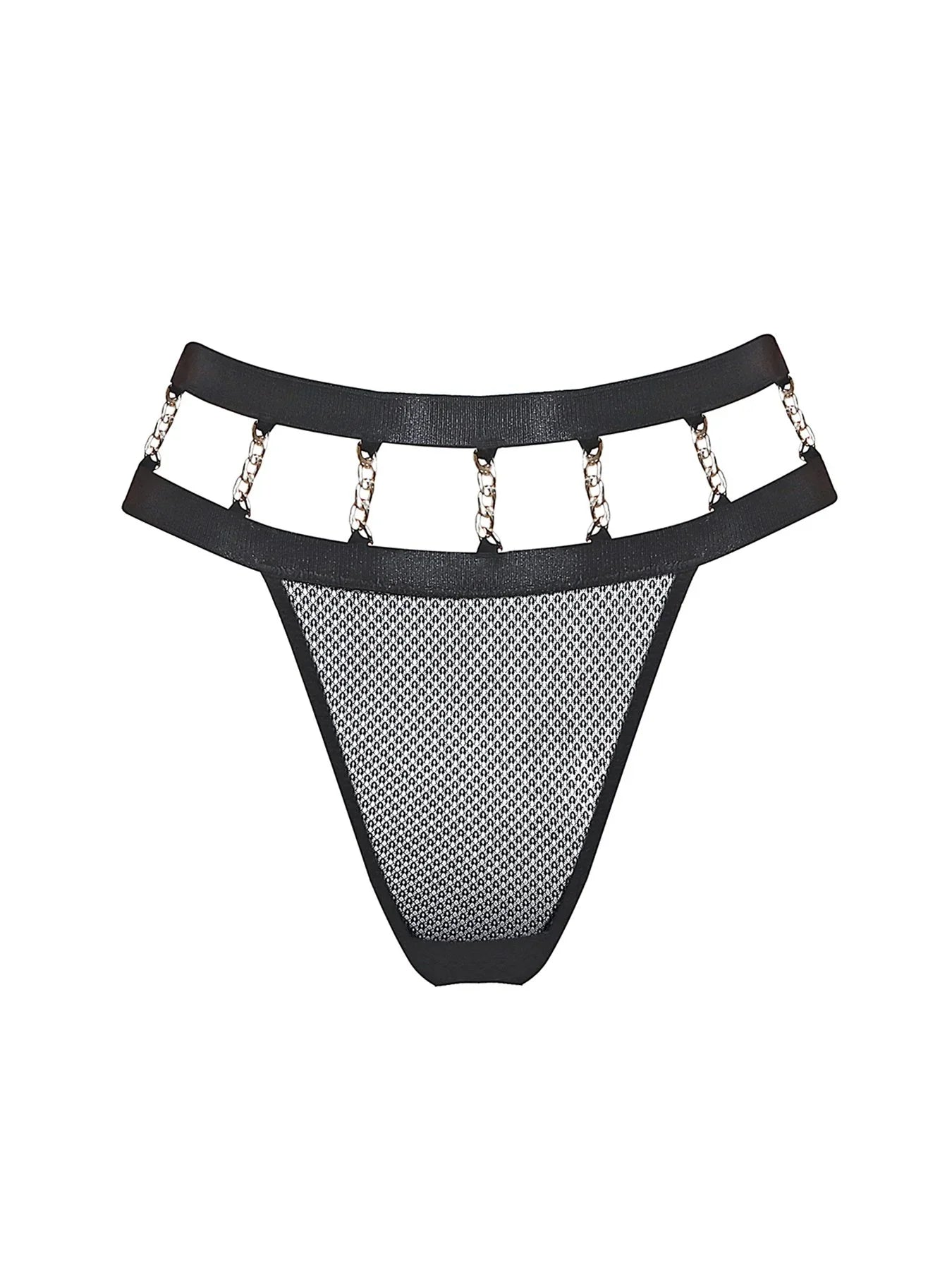 Hochgeschnittener String mit Netz und raffinierten Goldketten. Hinten befinden sich auf jeder Seite Bänder zum verstellen, dies sorgt für eine perfekte Passform.