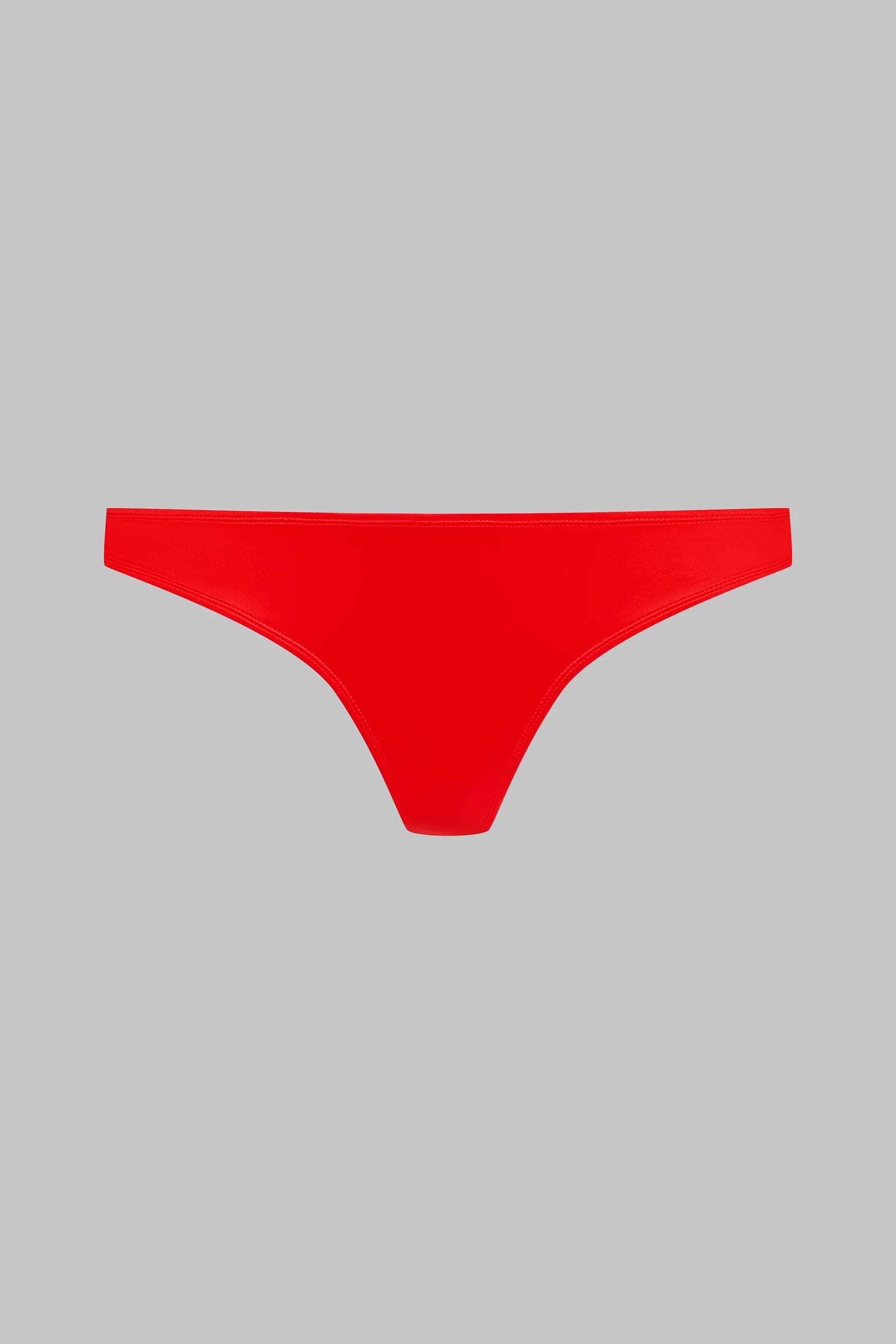 String mit hohem Beinausschnitt, der samtige Weichheit und zeitlosen Stil verbindet. Mit einem grafischen Ausschnitt vorne verleiht er einen ausgeprägten 80er-Jahre-Touch.