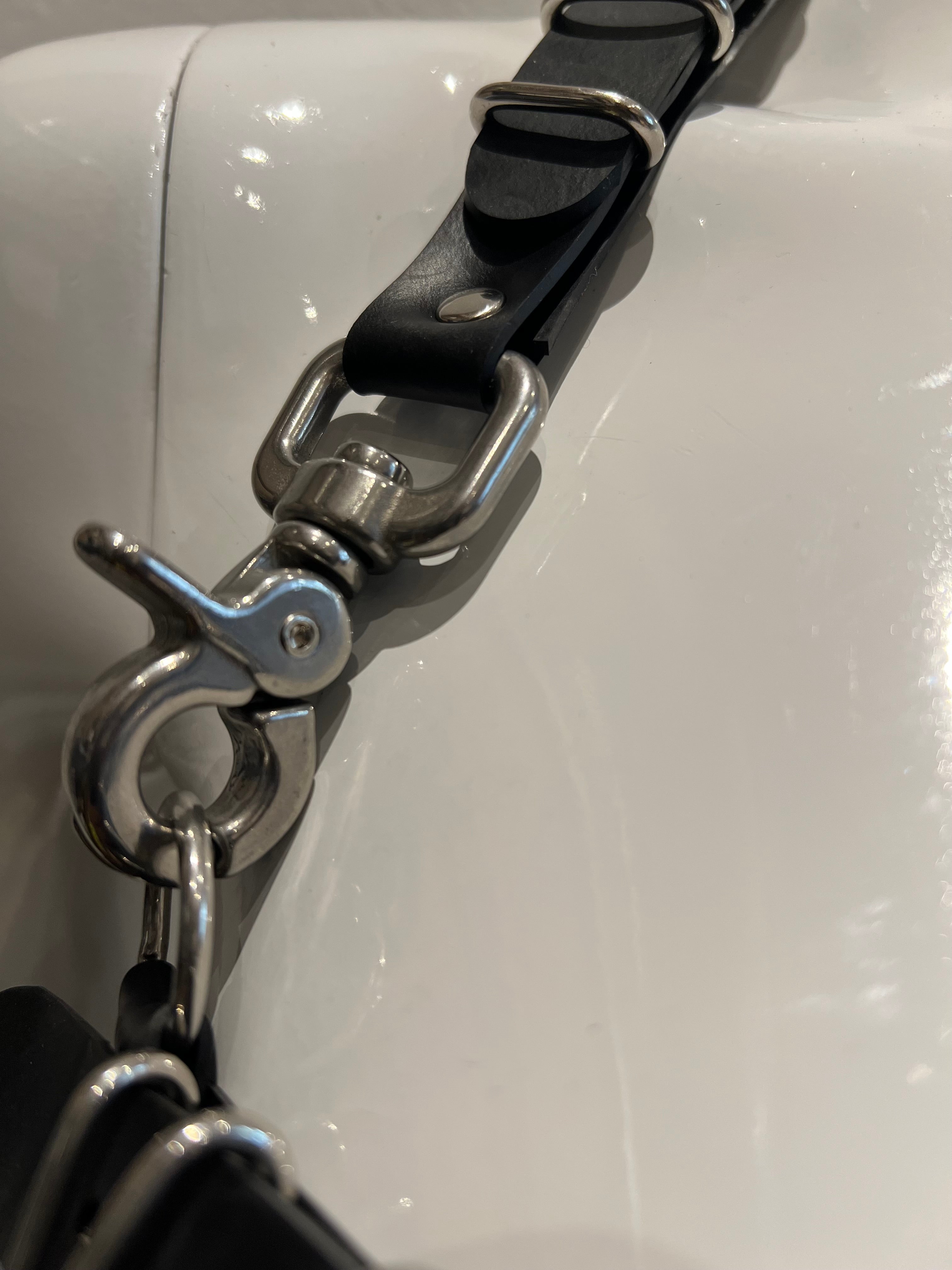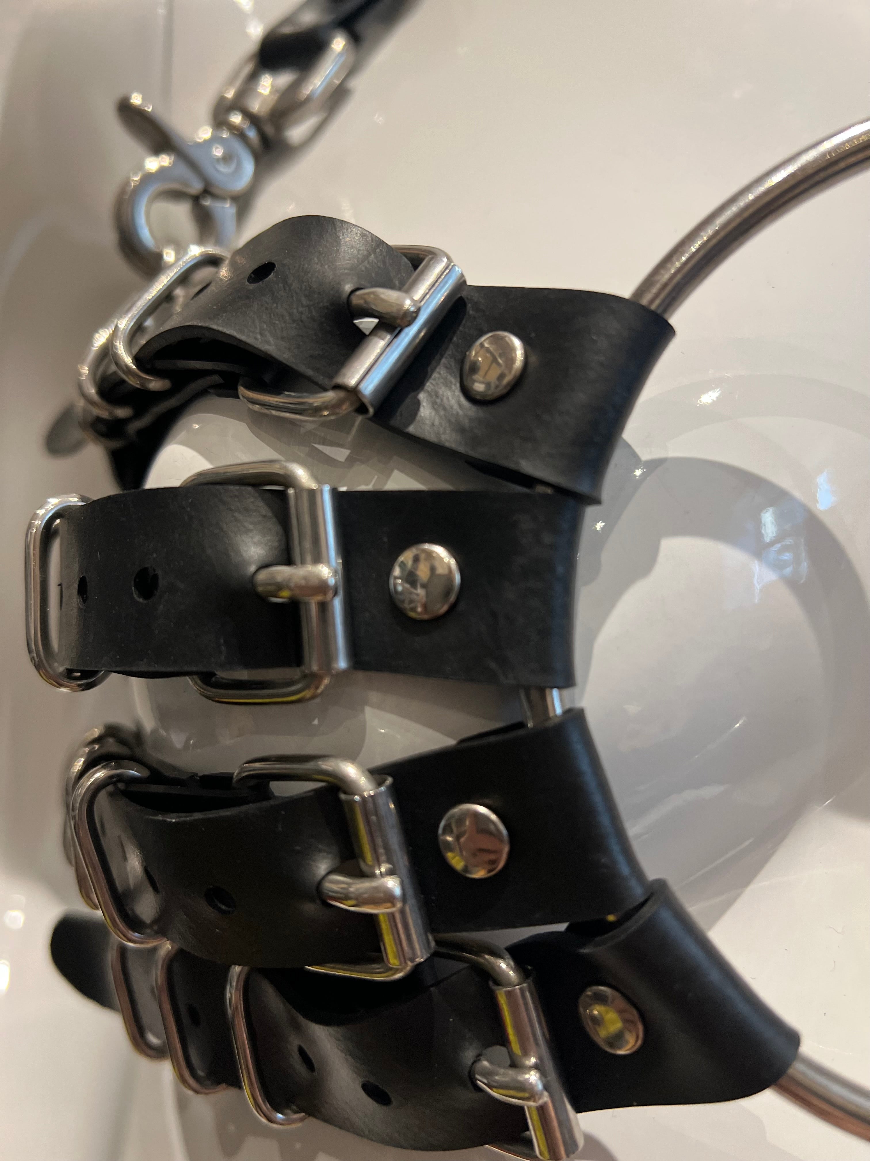 Dieser Harness BH aus Gummi besticht durch zahlreiche Schnallen und einen markanten großen Ring in der Mitte. Die nickelfreie Hardware ist wahlweise in Silber oder Gold erhältlich. Passend für einen Umfang von 65cm bis 83cm, setzt dieses Accessoire ein mutiges Statement.