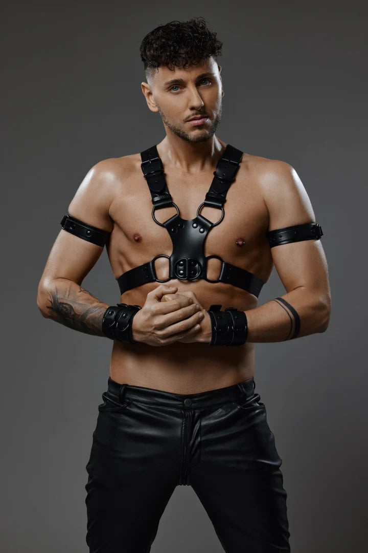Echtleder Harness mit extra breiten Lederriemen. Kompromisslose Männlichkeit und elektrisierende Sinnlichkeit vereint.  Eine wilde Verschmelzung von hochwertigem Rindsleder, und Schwarz auf Schwarzer Hardware.