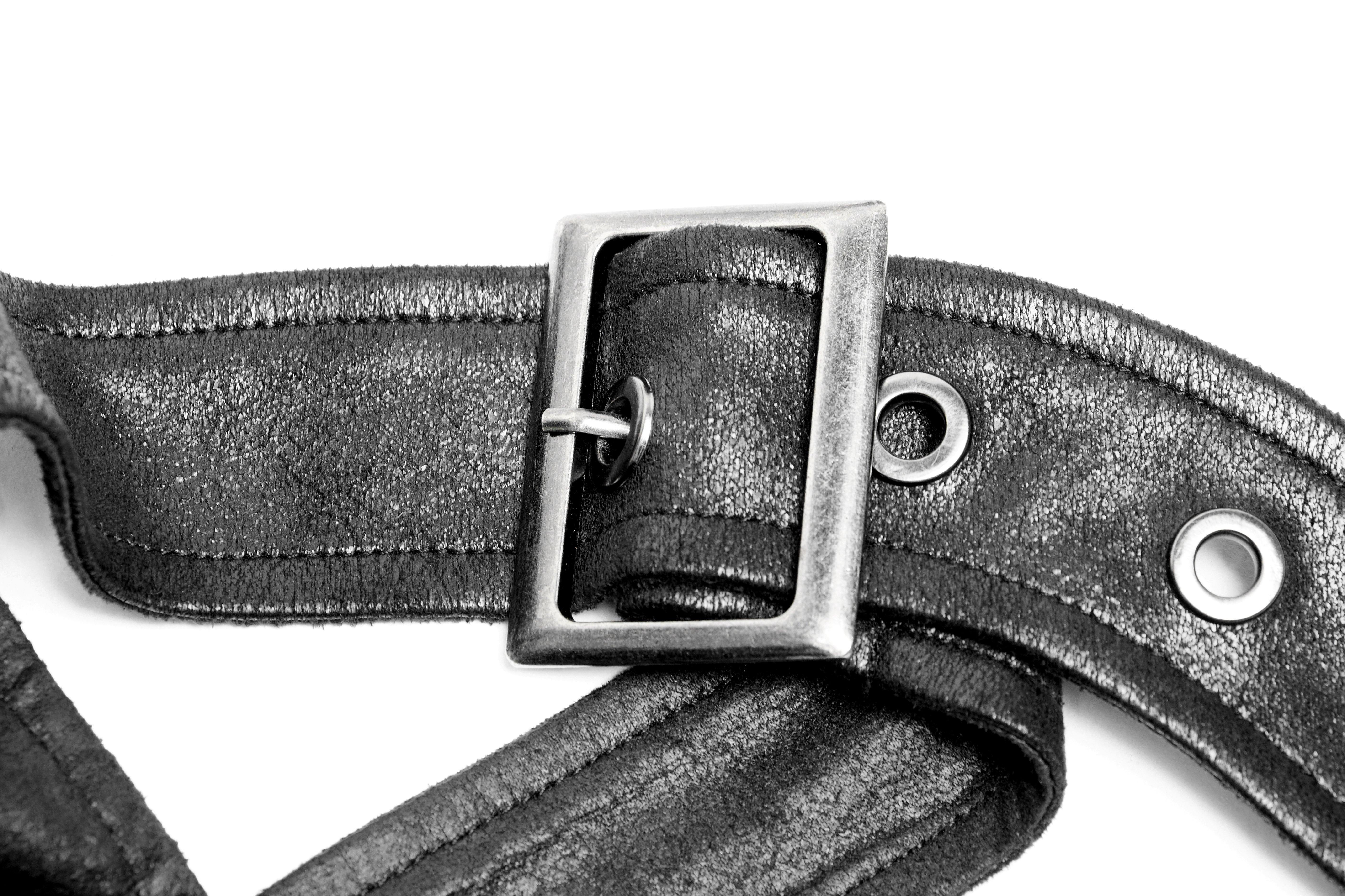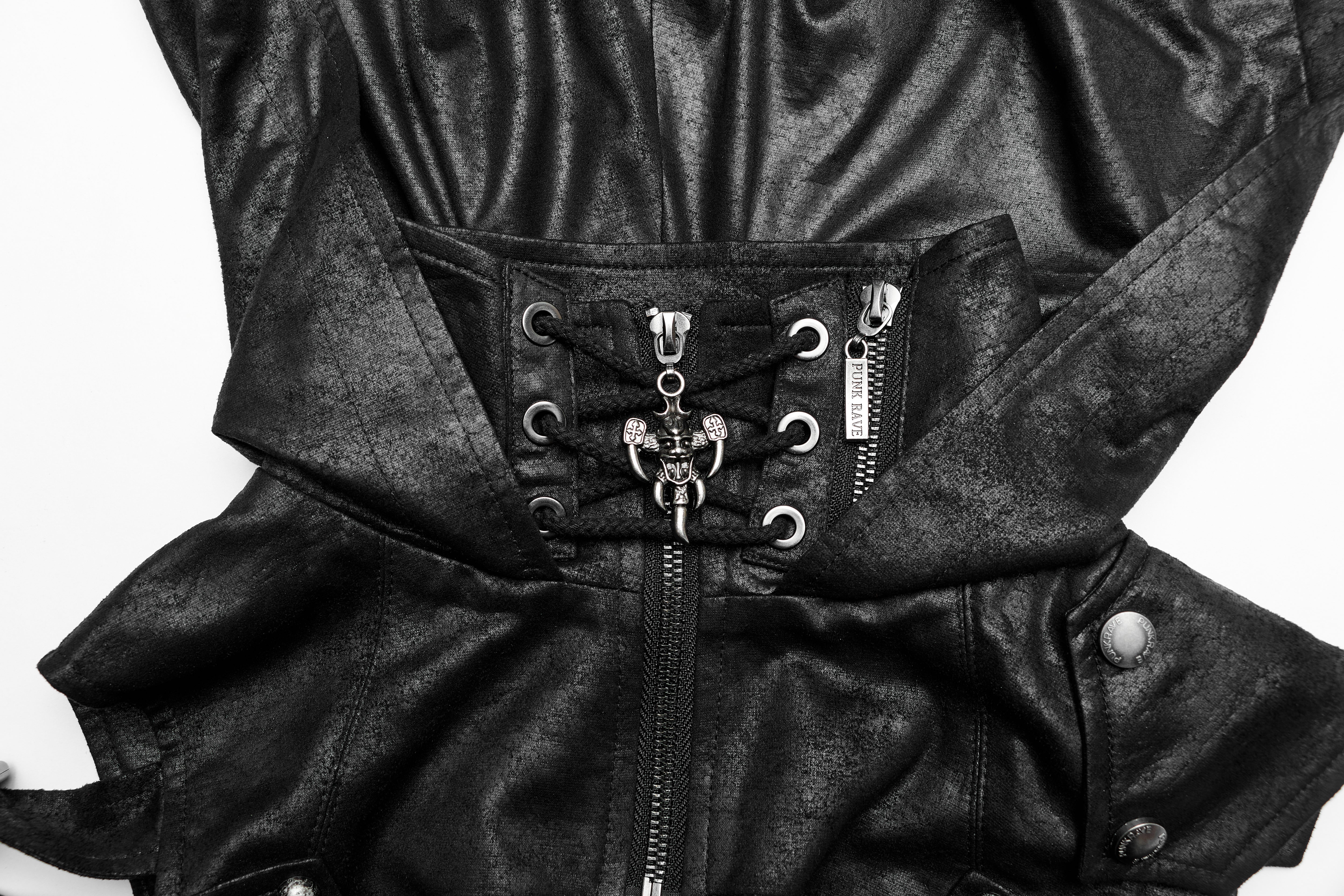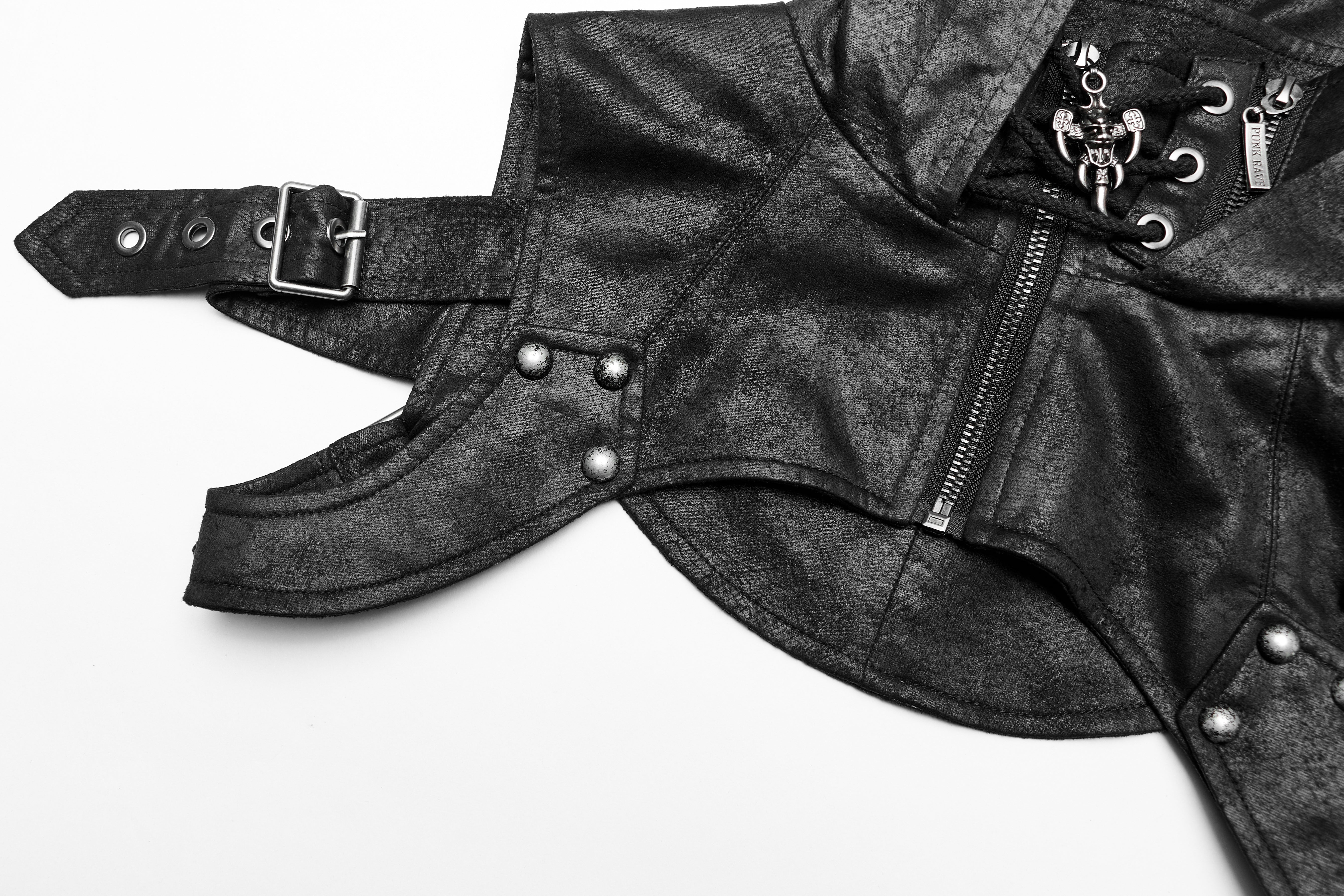 Dieser Schulterharness kombiniert eine markante Kapuze aus weichem, rissigem Kunstleder mit einer flexiblen Schlaufe auf der Rückseite zum Befestigen. Ein Frontreißverschluss ermöglicht einfaches An- und Ausziehen, während die Baumwollkordel die Passform individuell anpasst. Der auffällige fünfeckige Totenkopfanhänger, die bewegliche Armschlaufe und robuste Metallnieten verleihen deinem Look eine unverwechselbare, rebellische Gothic-Note.