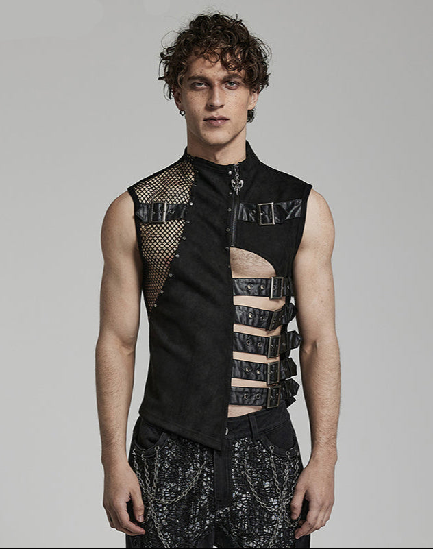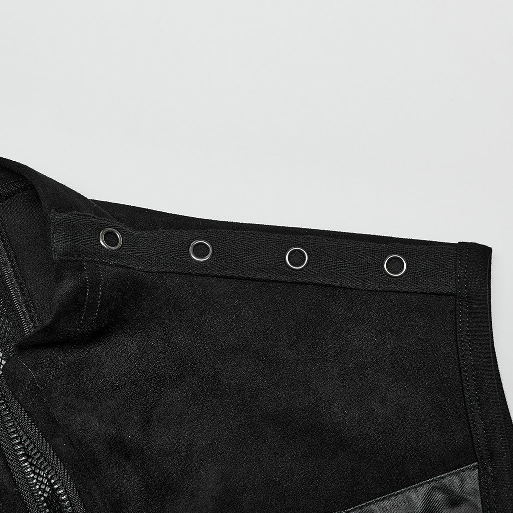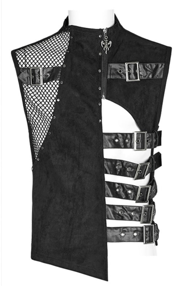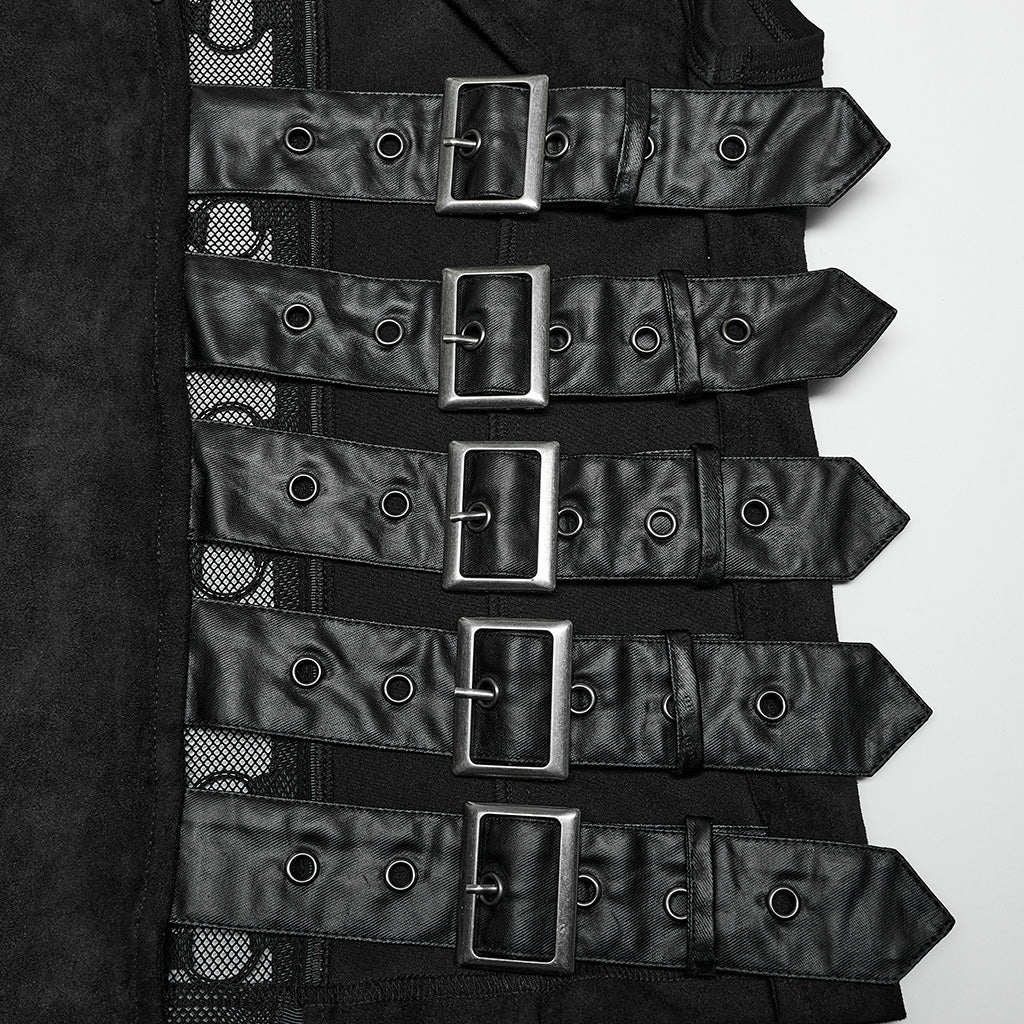 Diese Harness-Weste besticht durch einen modernen Materialmix aus Wildlederimitat und gummiertem Kunstleder. Verstellbare seitliche Schlaufen sorgen für perfekten Sitz, während das Netz die Sicht geschickt zulässt. Auf der Rückseite sorgt ein Metallringgewebe für einen aufregend coolen Look – verführerisch und selbstbewusst.