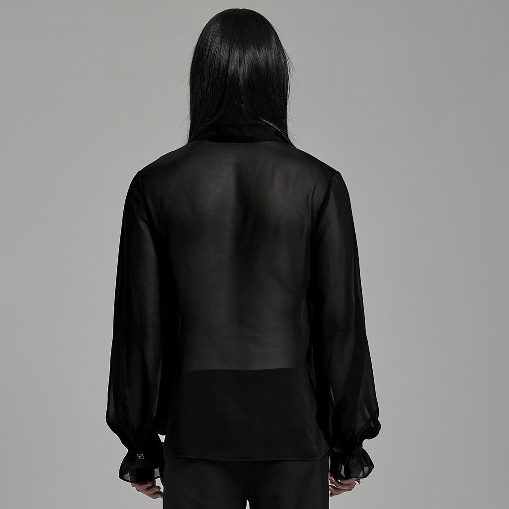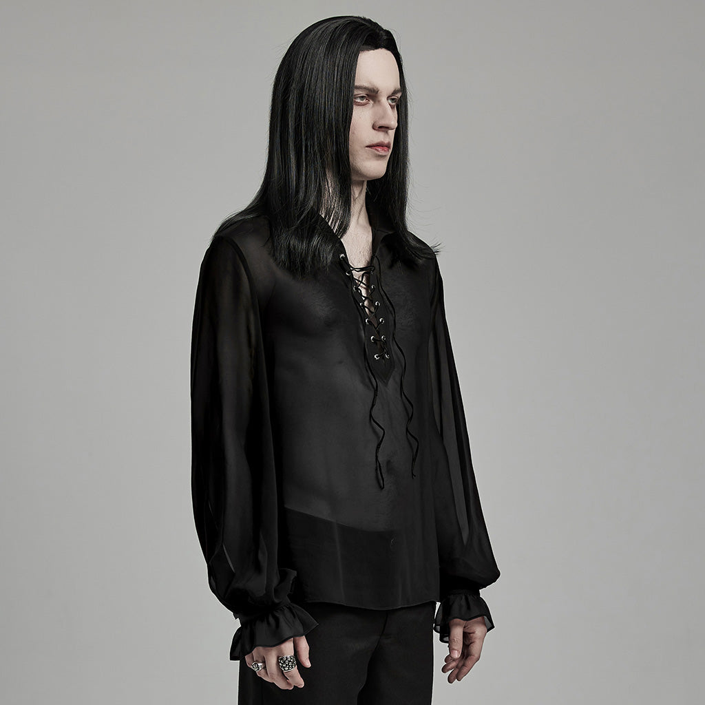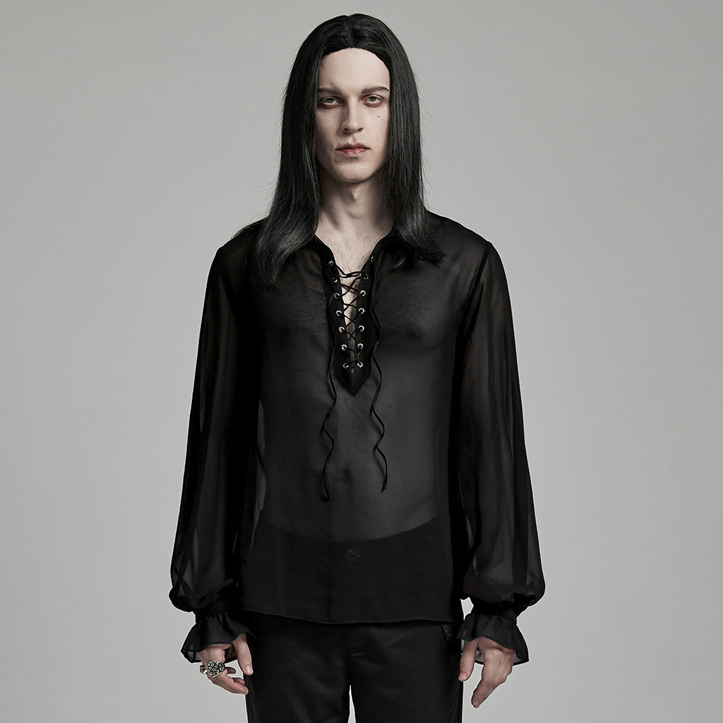 Dieses langärmelige Hemd im Poet-Stil verleiht jedem Auftritt eine dramatische Note und fließende Bewegung. Der schwarze Chiffon sorgt für einen transparenten, zarten Look, während der Schnürausschnitt eine individuelle Passform und einen Hauch Vintage-Charme bietet. Der klassische Kragen rundet das elegante Design ab. Dieses auffällige Hemd ist perfekt für alle, die mit dunkler Raffinesse und romantischem Flair bei Events oder Partys hervorstechen wollen. Tauchen Sie ein in pure Eleganz und setzen Sie ein mutiges Statement.