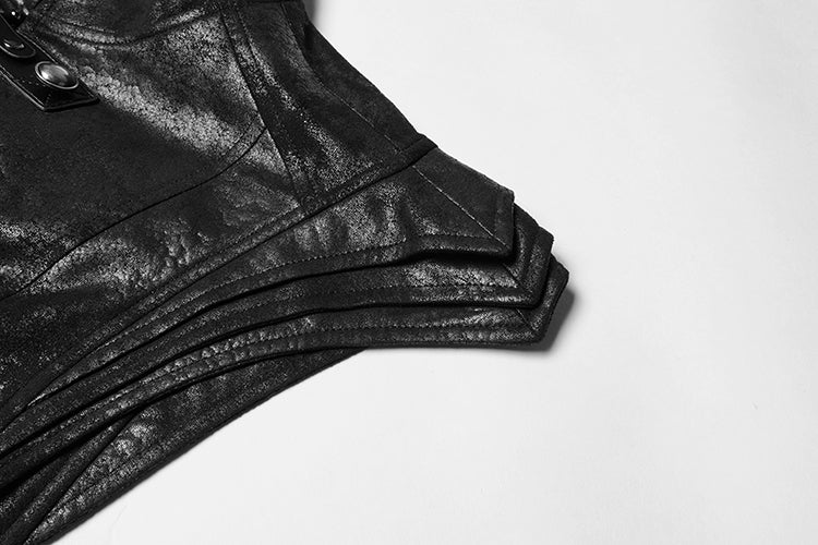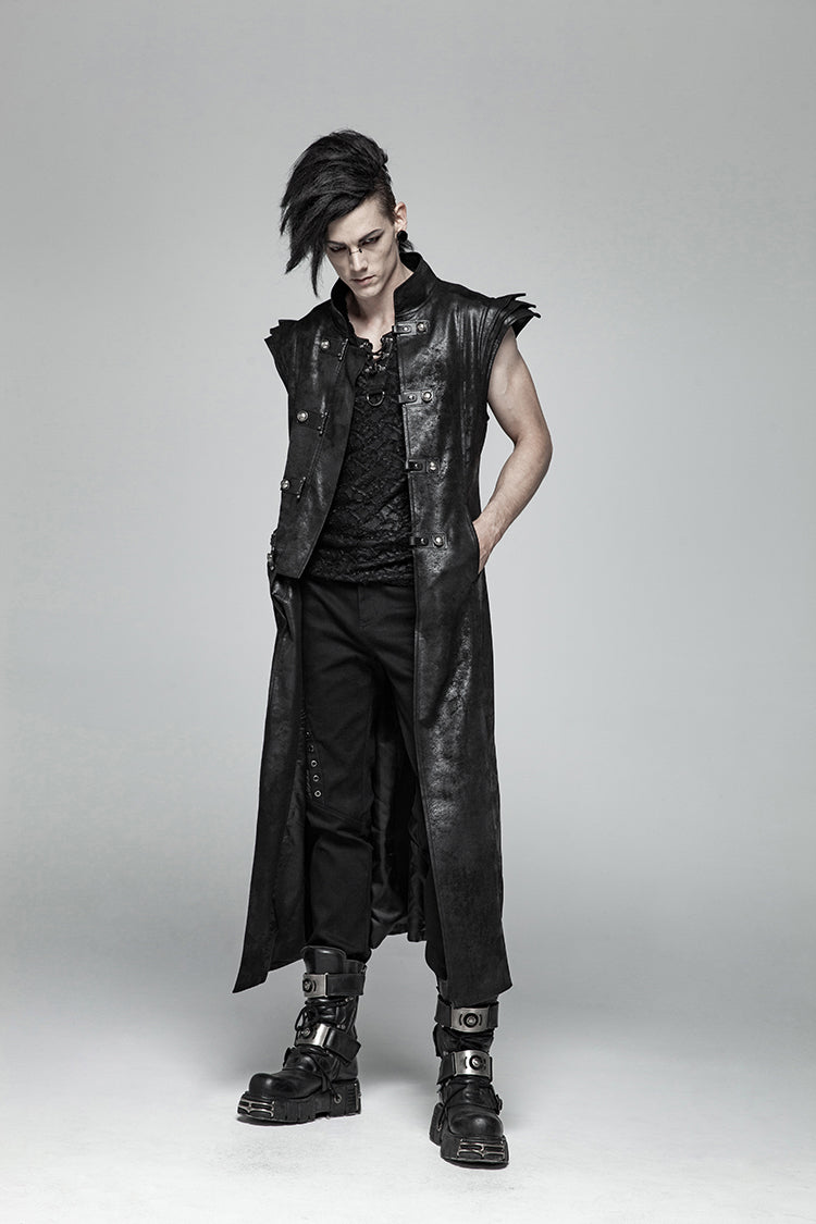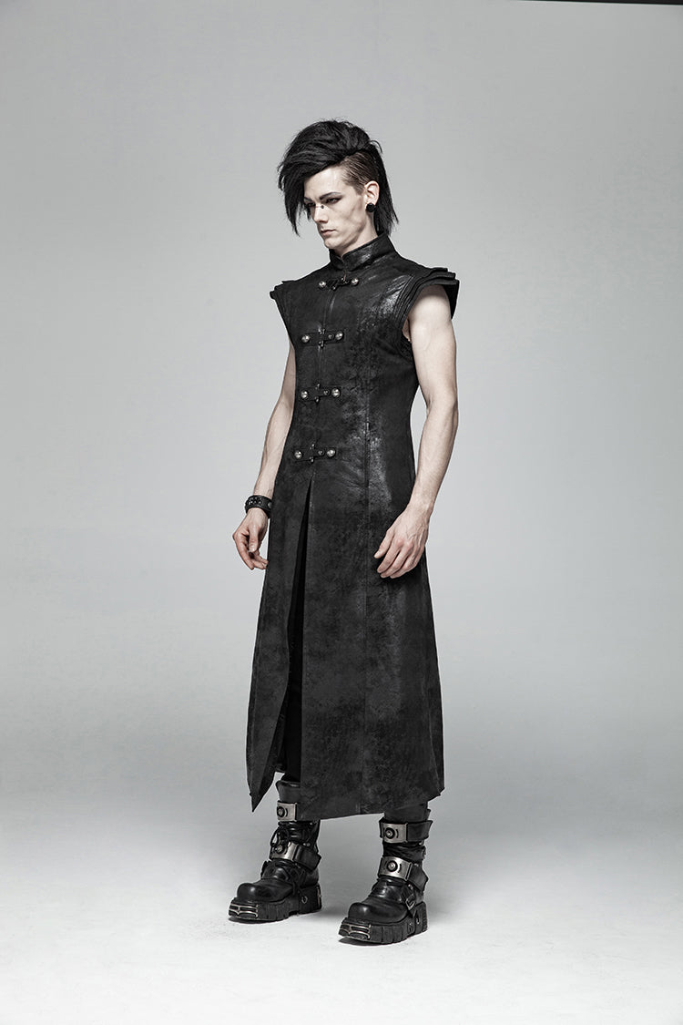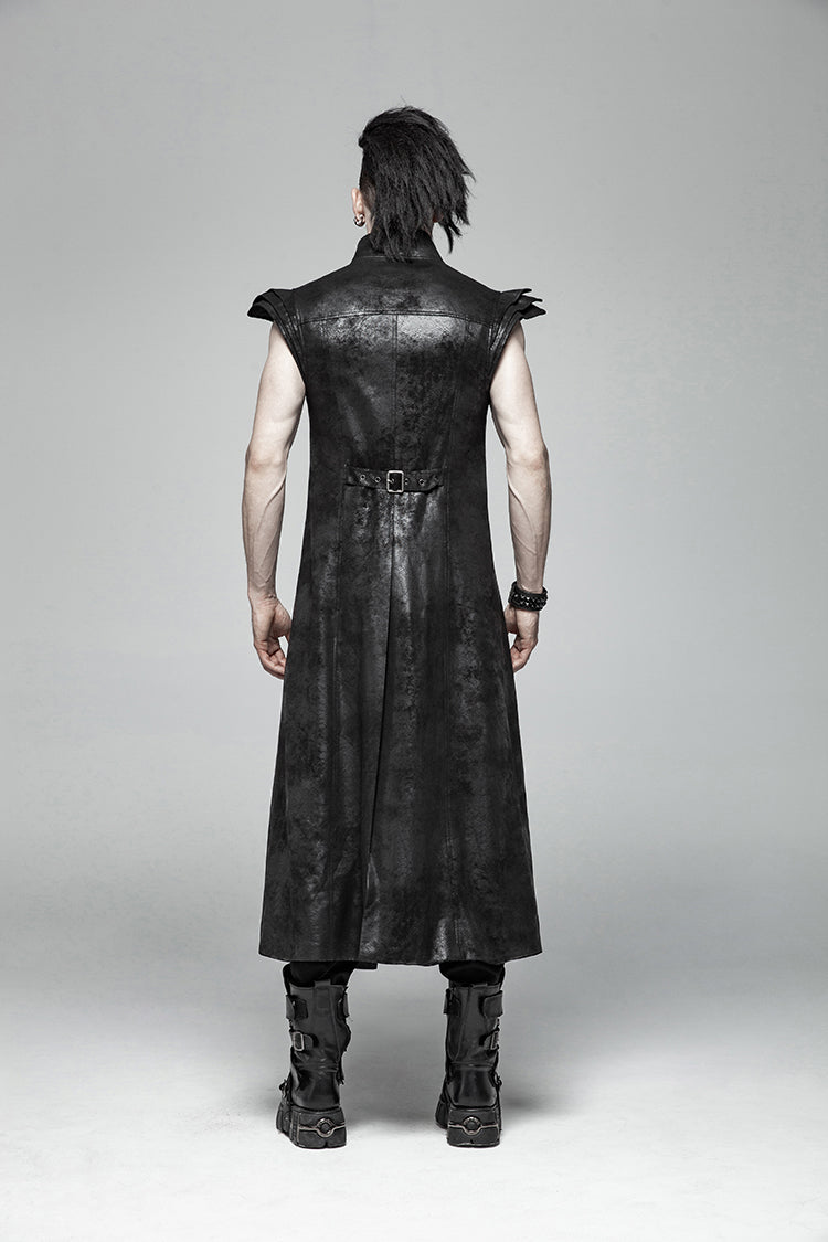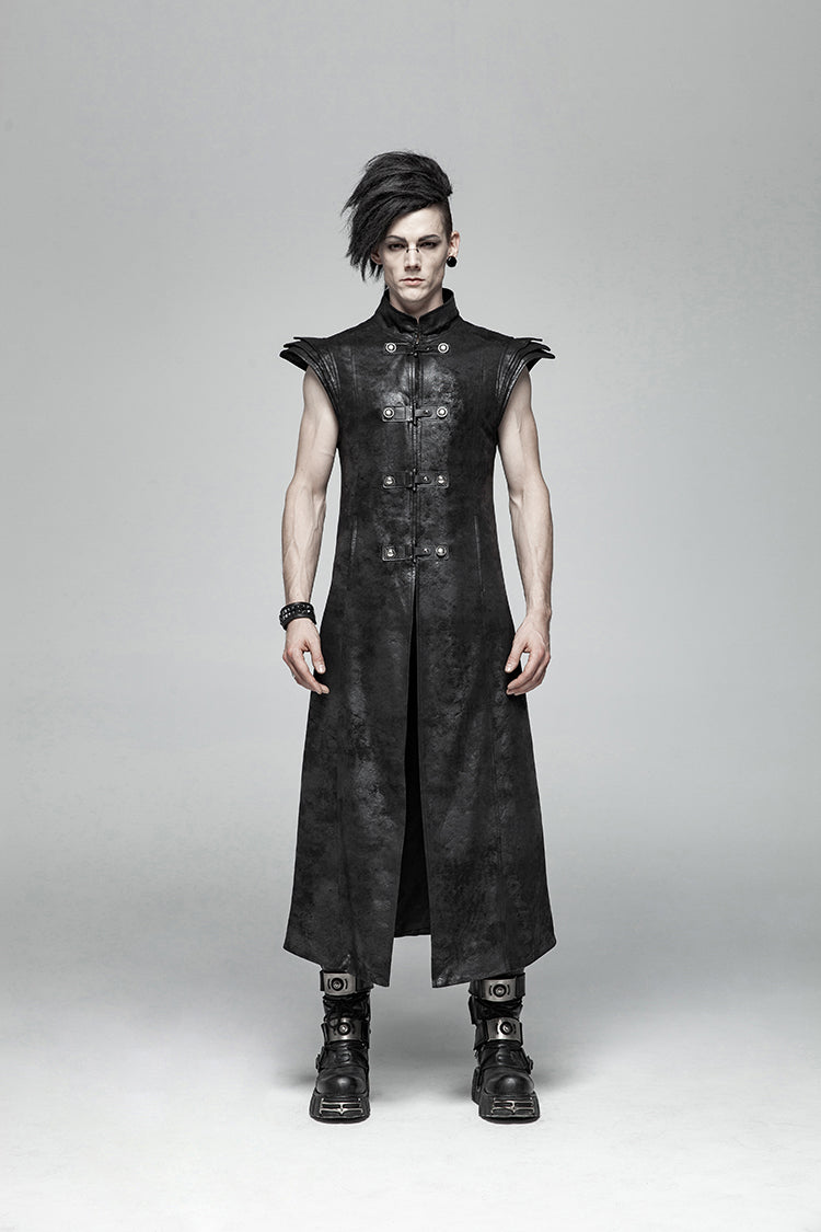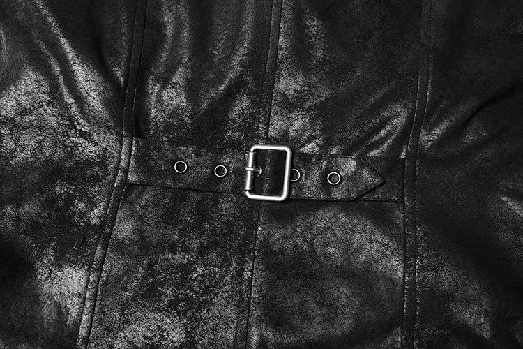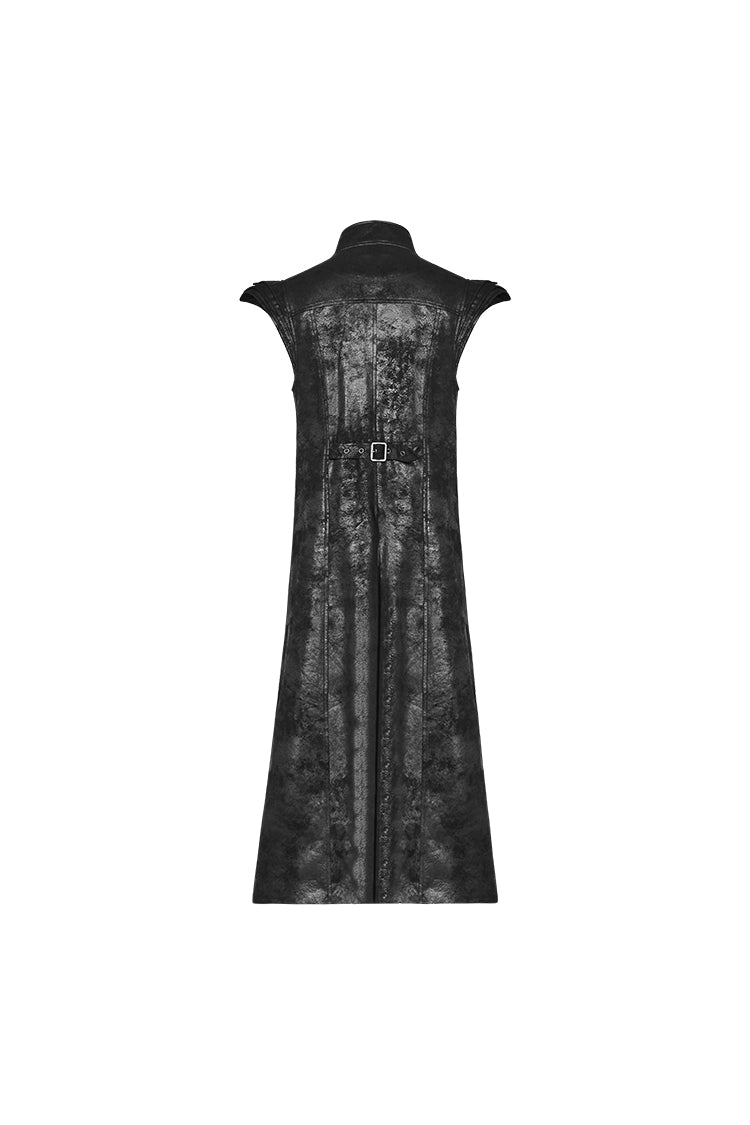 Die lange Weste zieht alle Blicke auf sich und strahlt pure Eleganz aus. Gefertigt aus beschichtetem Rissgewebe, besticht sie durch eine markante Knopfleiste mit kunstlederner Schnalle. Die Ärmel verleihen dir eine kraftvolle, schulterbreite Silhouette. Praktische Seitentaschen sind vorhanden. Sichere dir jetzt deinen Selbstbewussten Look!