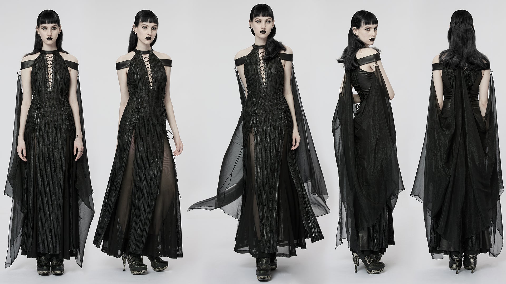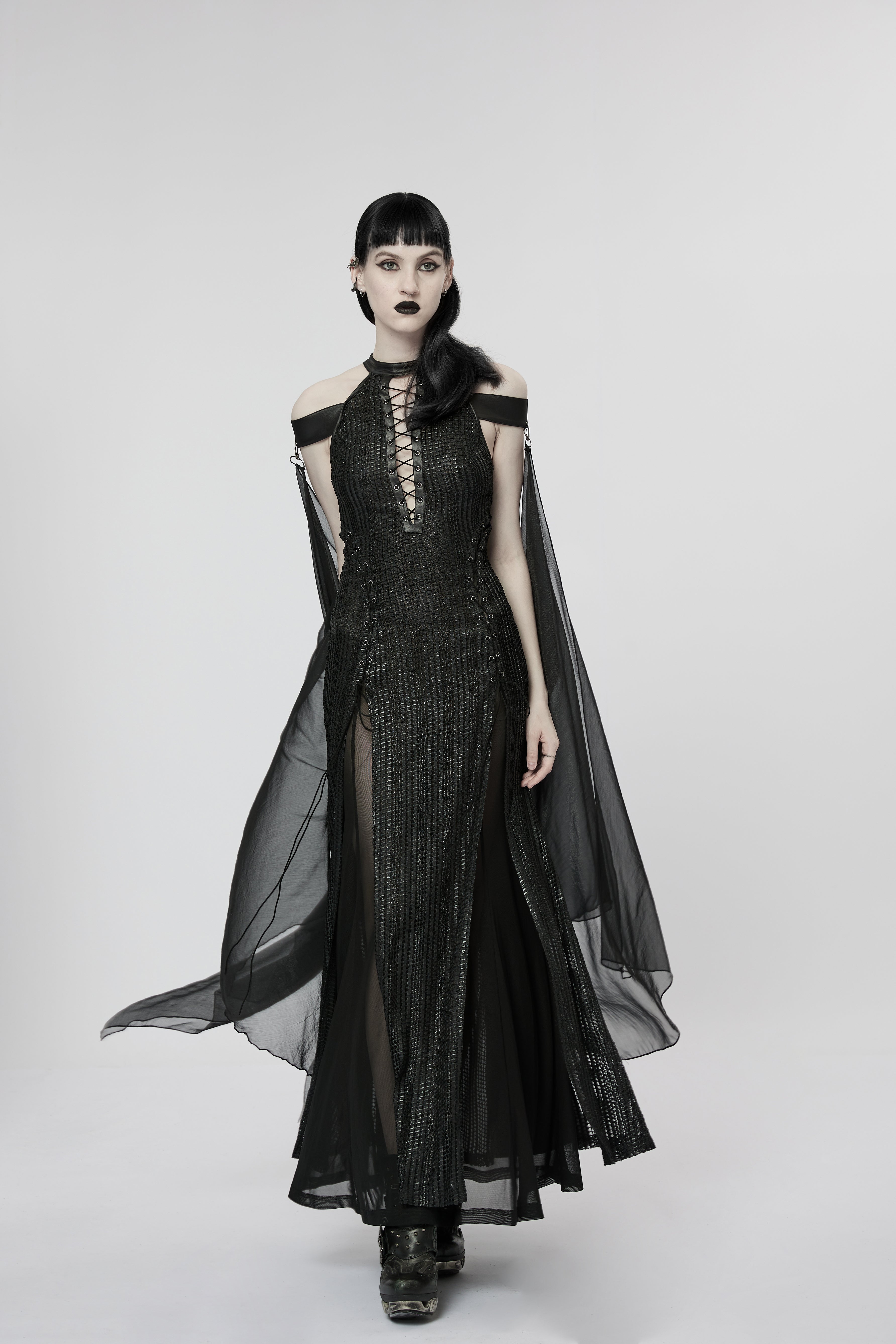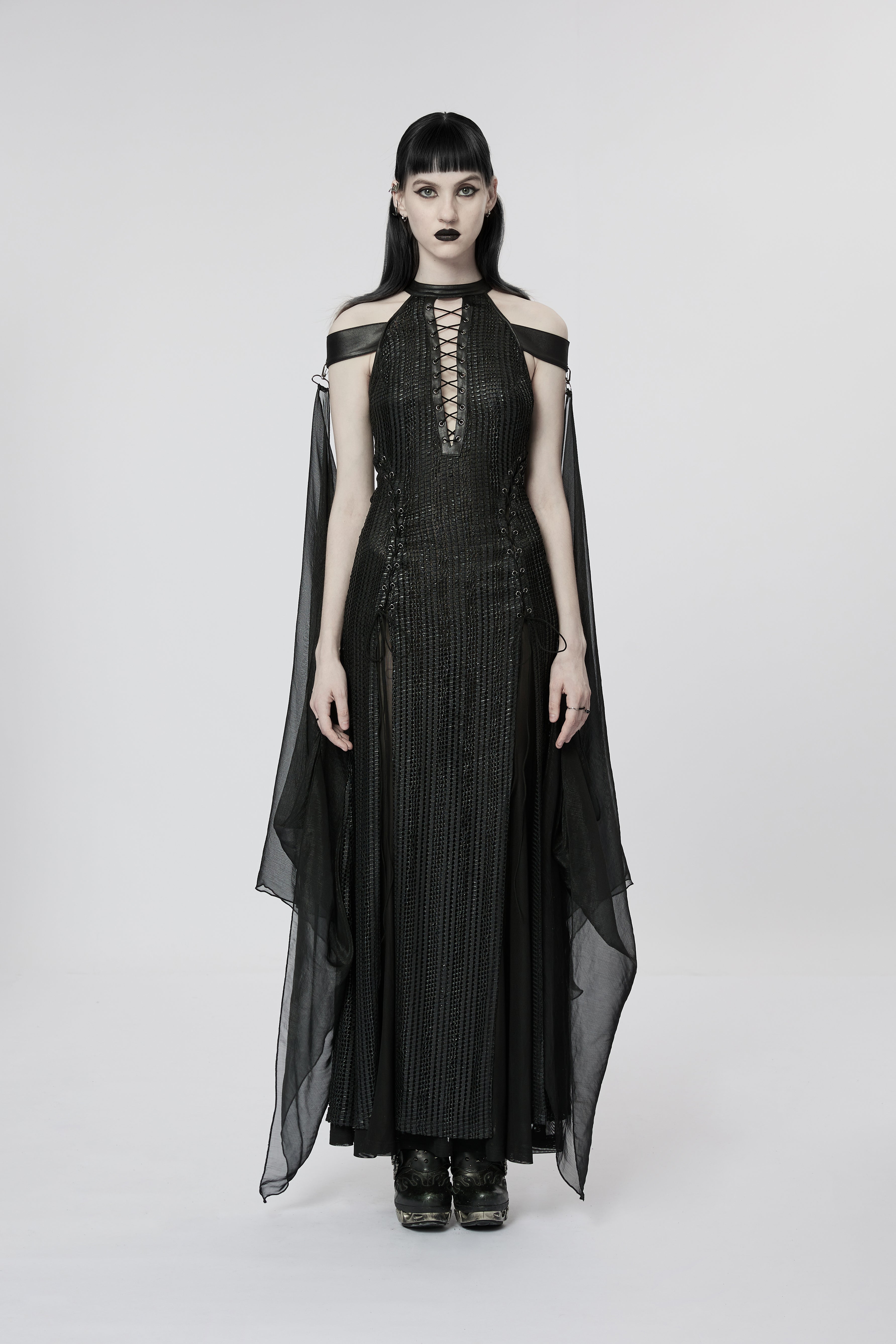 Dieses schwarze Maxi-Kleid kombiniert einen strukturierten Basisstoff mit einem Netzzunterlayer für einen verführerischen Look. Der ärmellose Schnitt mit Halterneck und tiefem V-Ausschnitt mit Schnürung setzt sinnliche Akzente. Zwei hohe Schlitze vorne betonen die Beine, während der abnehmbare Chiffon-Umhang und Details aus schwarzem Kunstlederimitat dem Outfit eine dramatische Note verleihen. Seitliche Schnürungen und ein Rücken-Schnürdetail sorgen für eine perfekte Passform. Ein mutiges Statement für besondere Anlässe.