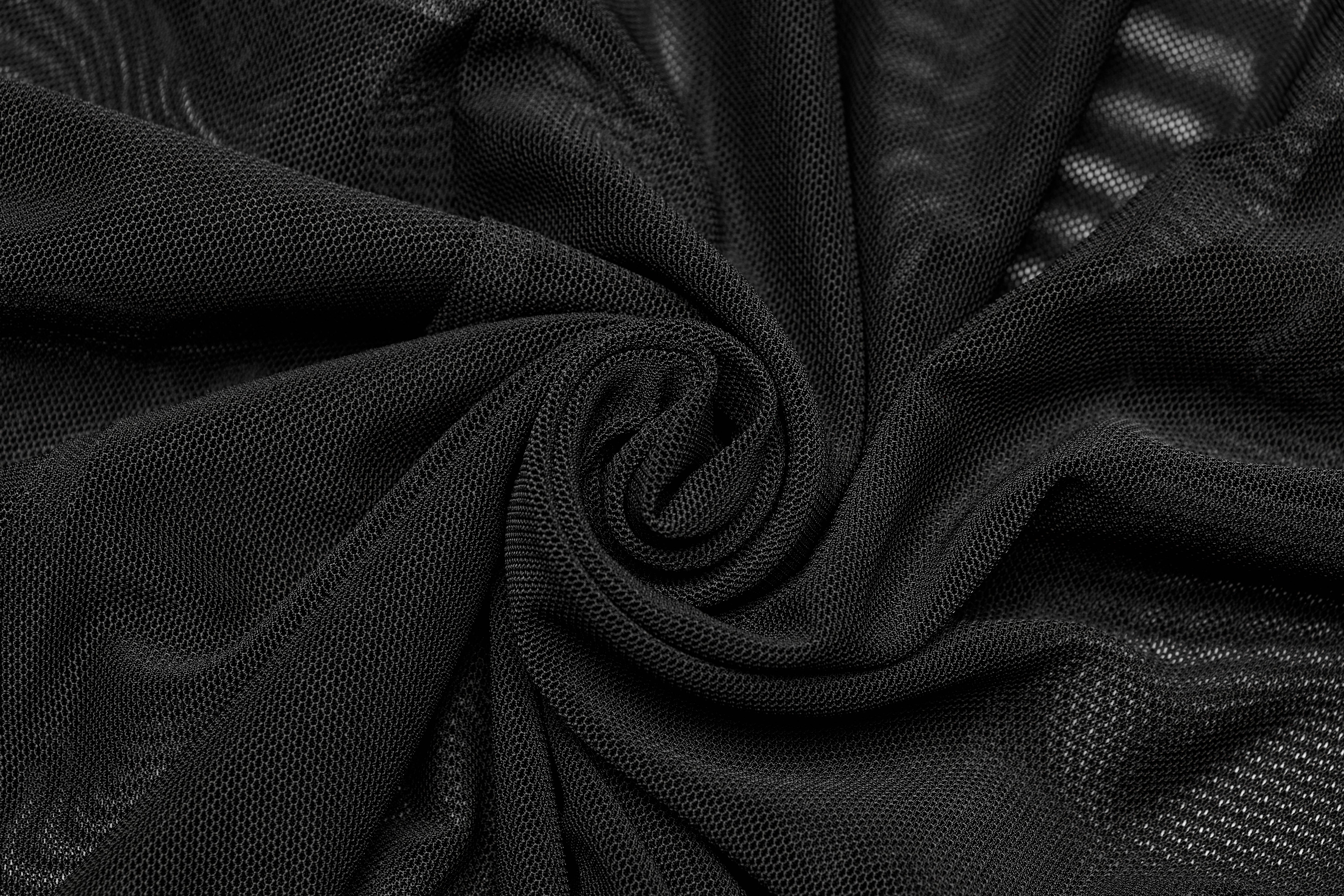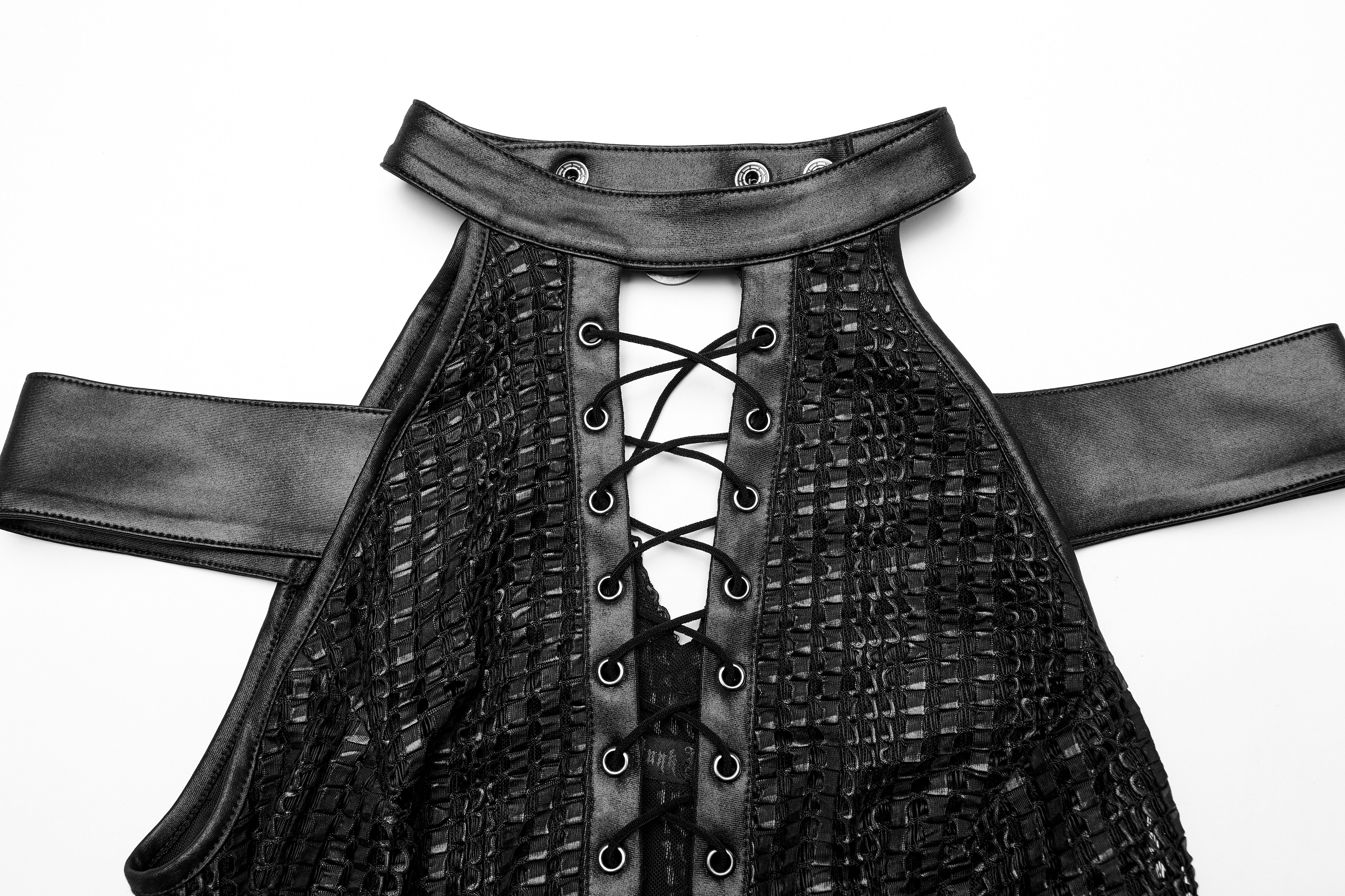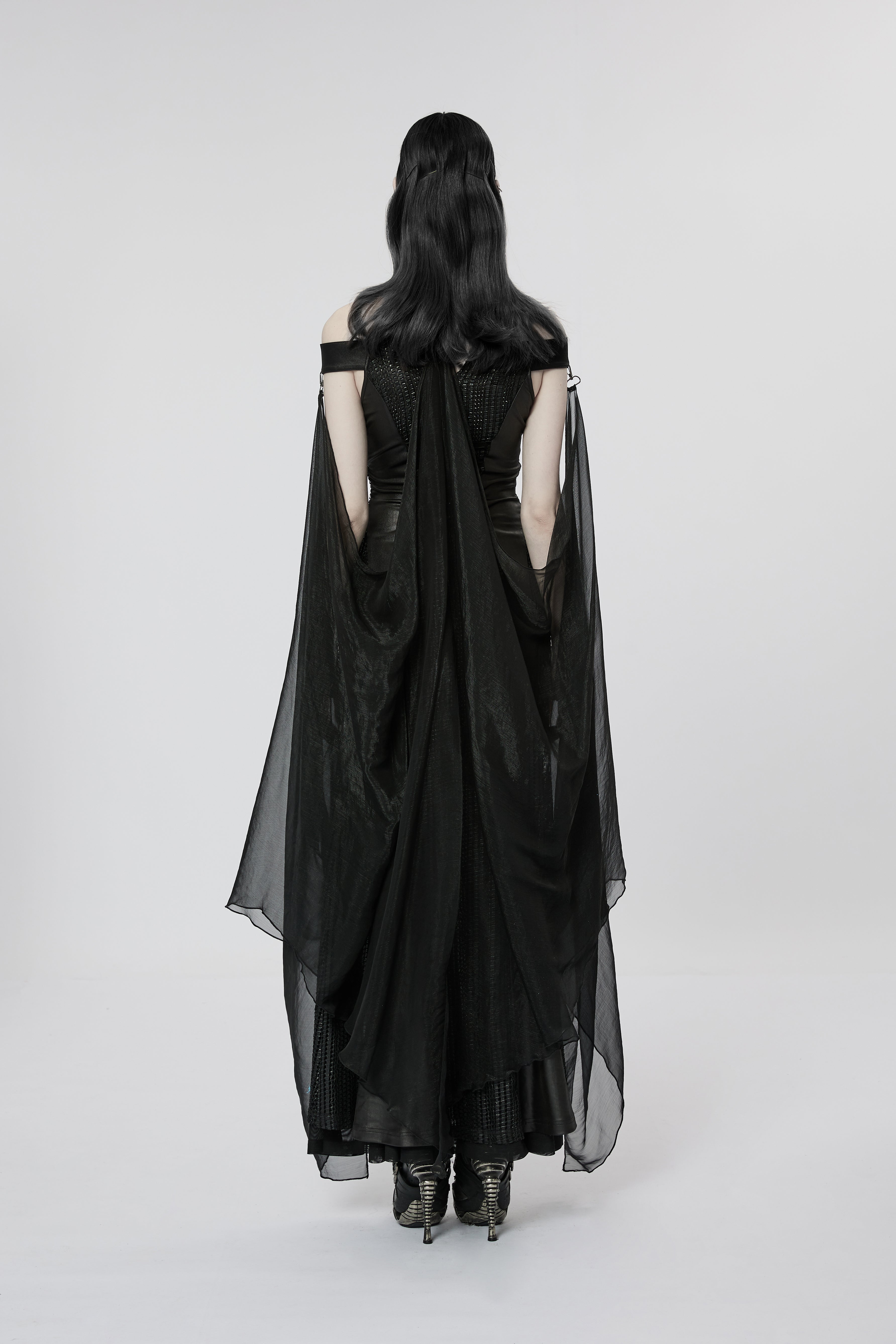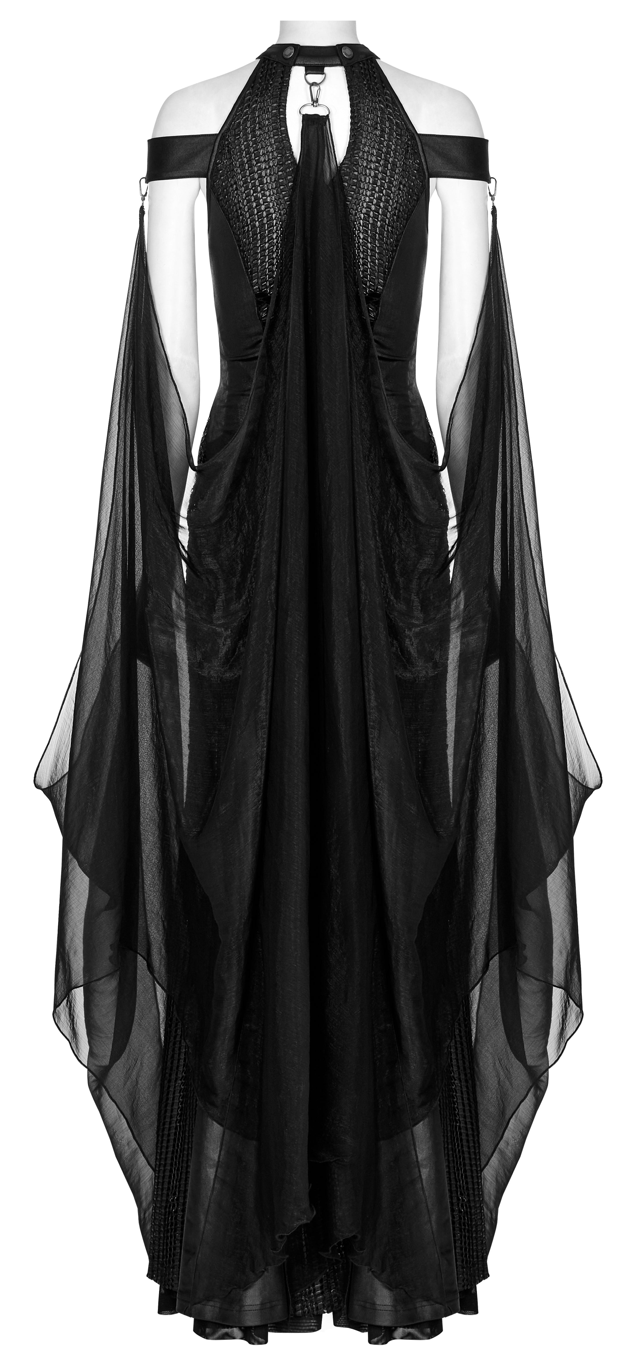 Dieses schwarze Maxi-Kleid kombiniert einen strukturierten Basisstoff mit einem Netzzunterlayer für einen verführerischen Look. Der ärmellose Schnitt mit Halterneck und tiefem V-Ausschnitt mit Schnürung setzt sinnliche Akzente. Zwei hohe Schlitze vorne betonen die Beine, während der abnehmbare Chiffon-Umhang und Details aus schwarzem Kunstlederimitat dem Outfit eine dramatische Note verleihen. Seitliche Schnürungen und ein Rücken-Schnürdetail sorgen für eine perfekte Passform. Ein mutiges Statement für besondere Anlässe.