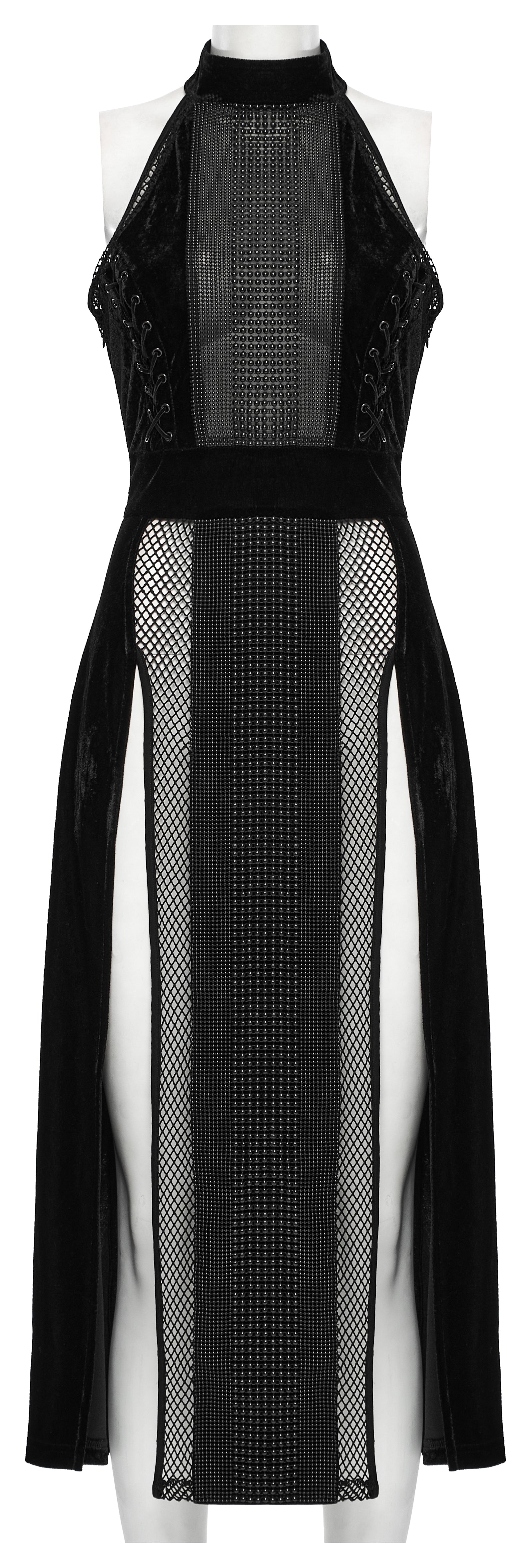 Dieses verführerische Langkleid kombiniert elastischen Samt mit transparentem Mesh für einen aufregenden Gothic-Look. Das Neckholder-Design und der schmale Schnitt betonen die Silhouette, während funkelnde Perlen auf der Vorderseite alle Blicke auf sich ziehen. Der hohe Beinausschnitt mit durchscheinendem Mesh sorgt für eine verlockende Note und setzt Ihre Beine gekonnt in Szene.