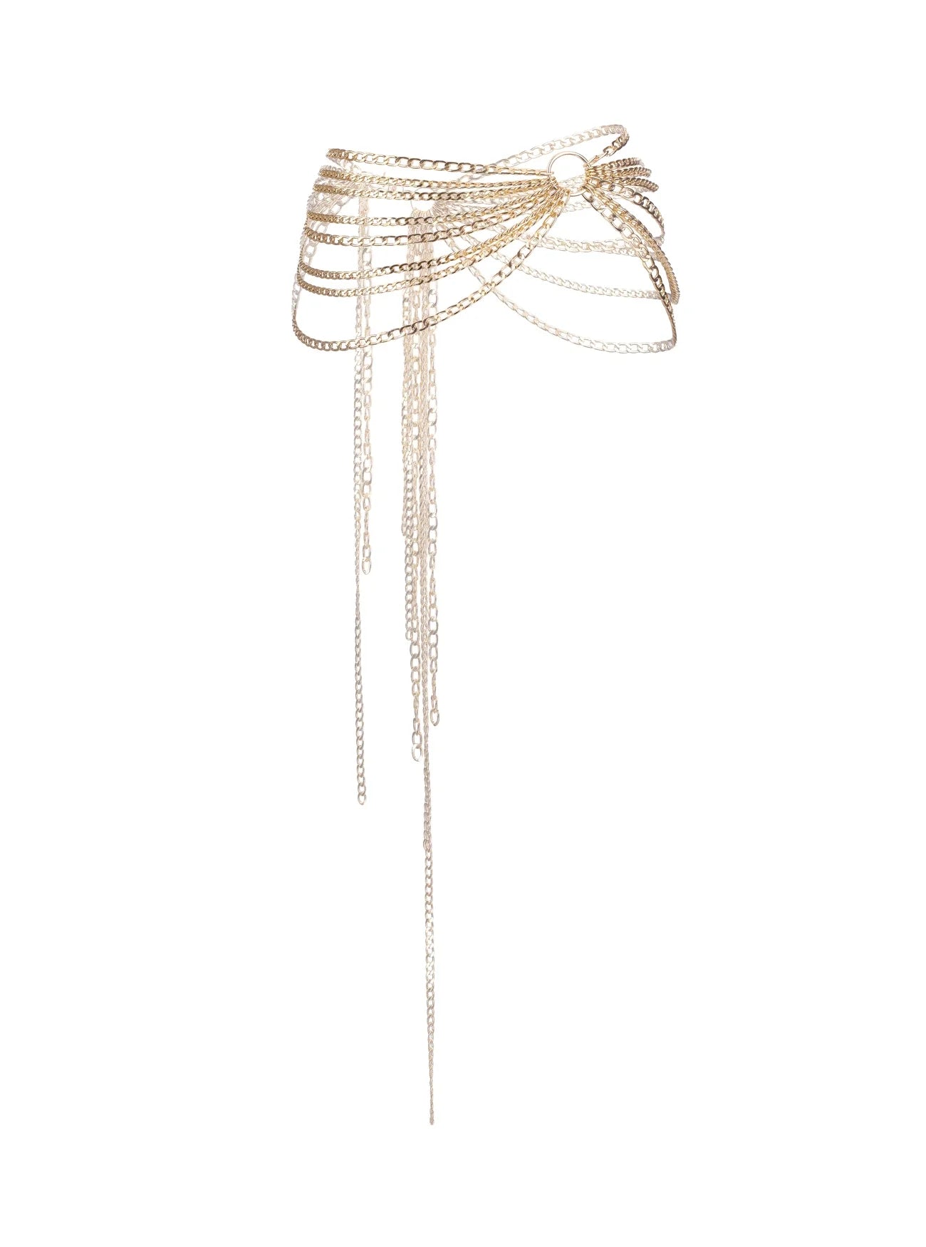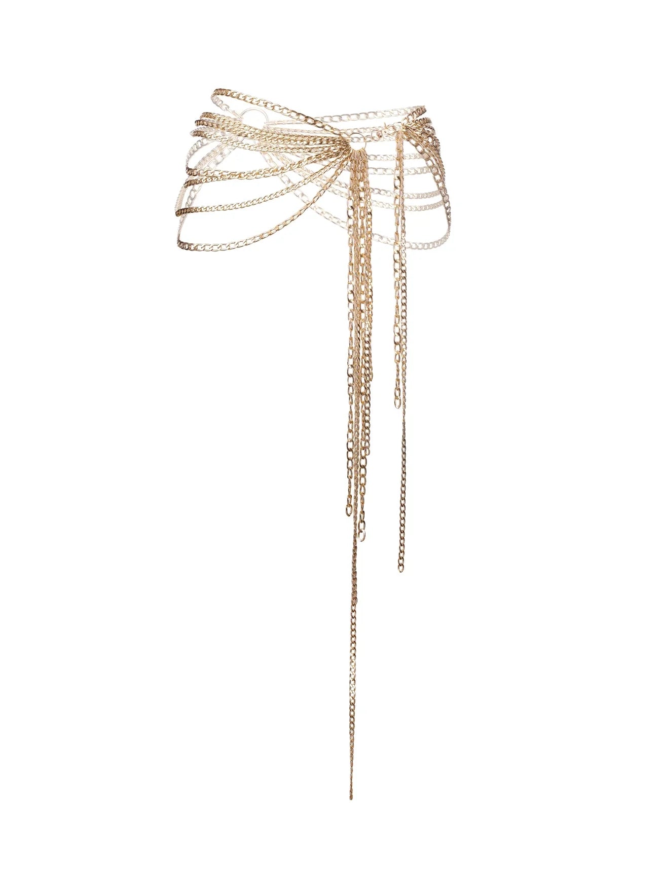 Entwickelt, um Ihre Silhouette zu betonen, ist der Kettengürtel ein auffälliges Statementstück mit geschichteten goldfarbenen Ketten, die elegant über den Hüften drapiert sind. Verstellbar für eine bequeme Passform, kann dieses vielseitige Accessoire über Unterwäsche, Badebekleidung oder enganliegender Kleidung für einen eleganten Look gestylt werden. Wagemutig, raffiniert und mühelos glamourös – ein Muss für mutige Stylings.