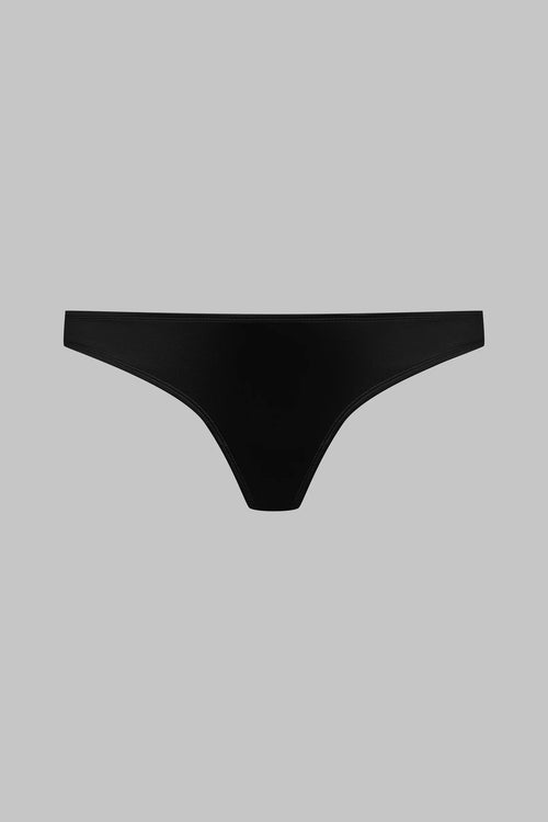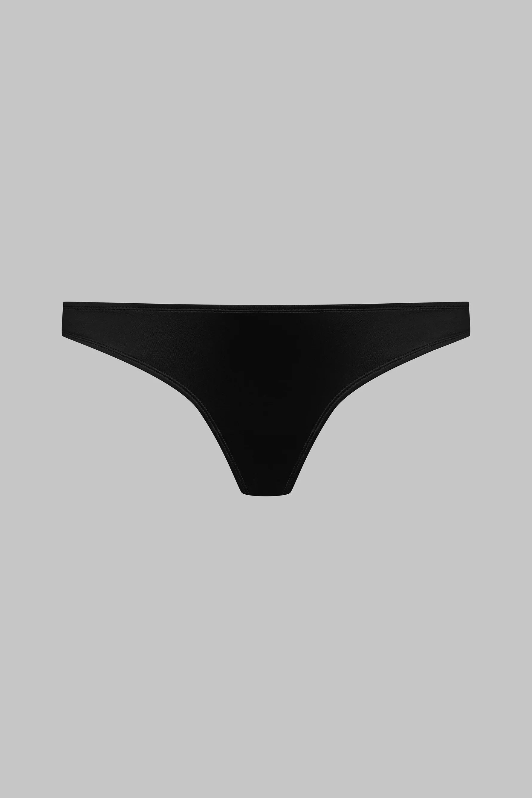 Hoch geschnittener Tanga, der satinierte Weichheit und zeitlosen Stil vereint. Aufgewertet durch einen grafischen Ausschnitt auf der Vorderseite bietet es einen vermeintlichen 80er-Jahre-Touch.