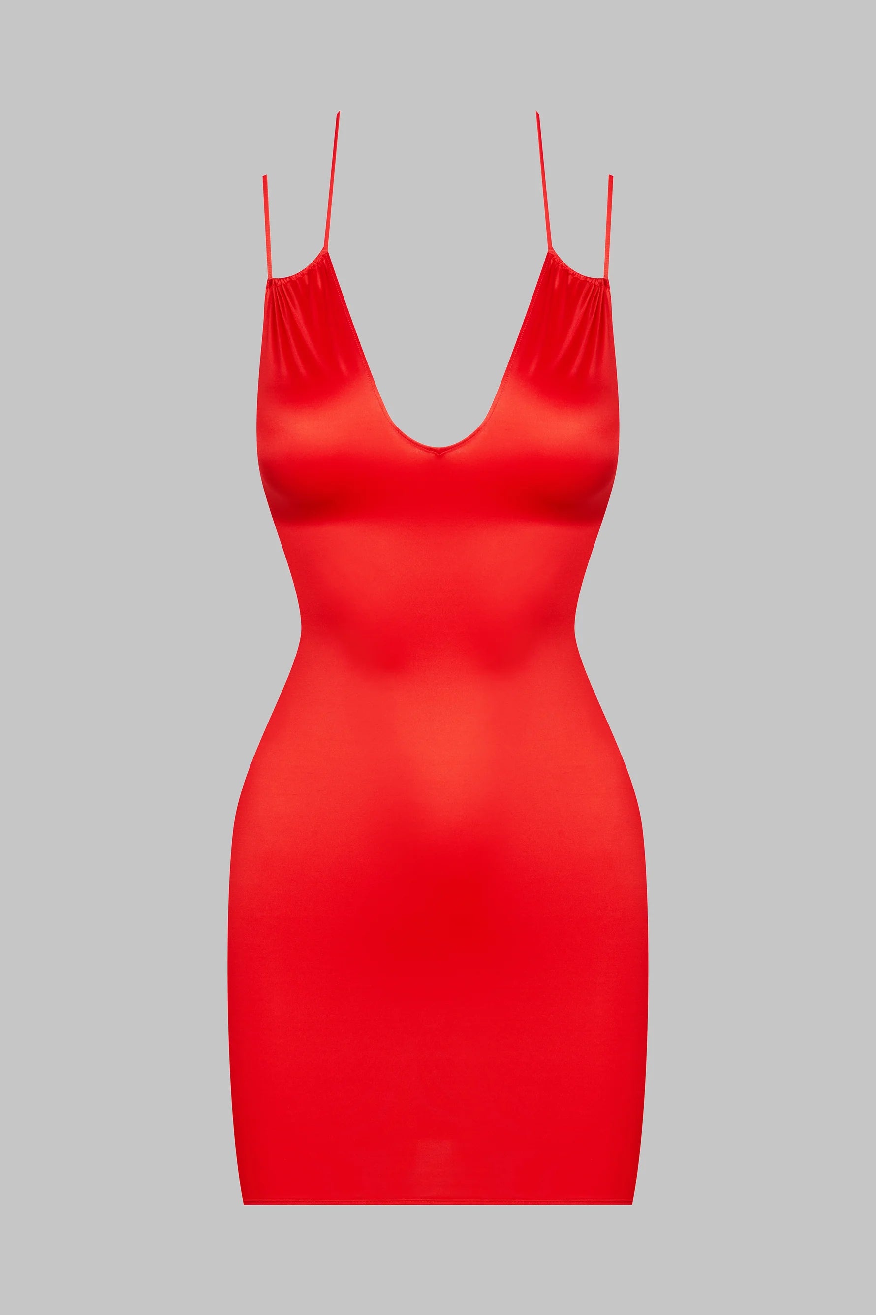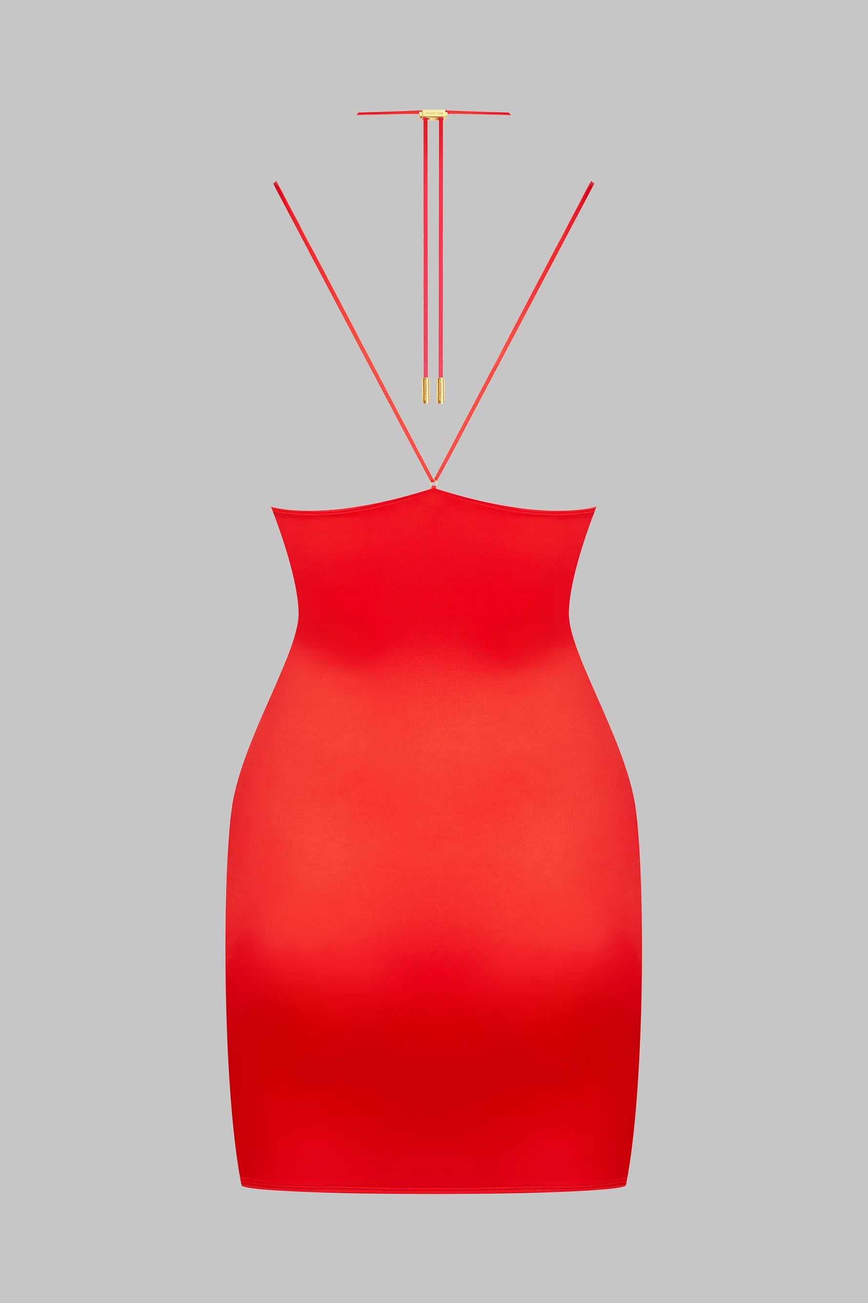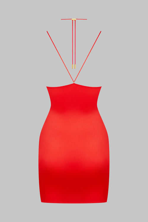 Kurzes Kleid, das satinierte Sanftheit und einzigartigen Stil vereint. Strukturierte Dekolleté mit subtiler Raffung. Die am Hals gebundene Schnürung ist verstellbar dank des einzigartigen Regler in Gold, verleiht dem Dekolleté und dem Rücken Eleganz und ermöglicht eine Personalisierung nach Ihren Wünschen. Ein poppiges, auffälliges und mutiges Rot, das alle Blicke auf sich zieht.