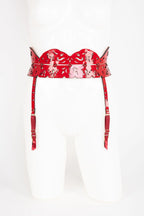 Add some serious sex appeal to your outfit with this Red Harness Garter Belt. Crafted from lasered red patent leather, it features rose gold crystal studs and detachable garters. Style with lingerie or layer over a pencil skirt for a high fashion look. Super versatile!
