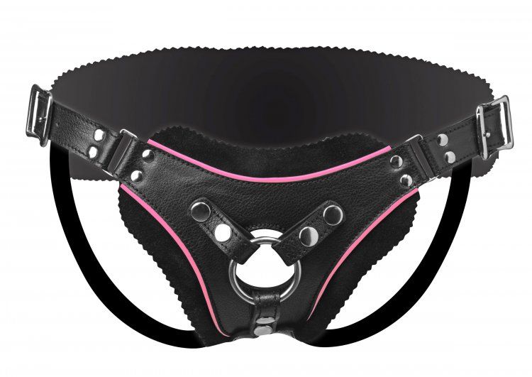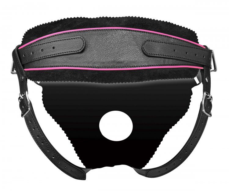 Echtleder Strap-On mit schwarzem Dildo und rosa Akzenten, tief ausgeschnittenes Design. Der Gürtel ist voll verstellbar, mit Schnallen an den Hüften und hinteren Gurten für einen engen Sitz. Die Rückseite ist breit für mehr Halt und mit weichem Stoff für Komfort gefüttert. Die Vorderseite verfügt über eine einfache Einrastfunktion. Mit einem der beiden mitgelieferten O-Ringe aus Stahl können Sie Ihren Lieblingsdildo mit mehreren Größenoptionen hinzufügen. 110 cm Umfang an der breitesten Stelle, passend für Dildos bis 42 mm Durchmesser