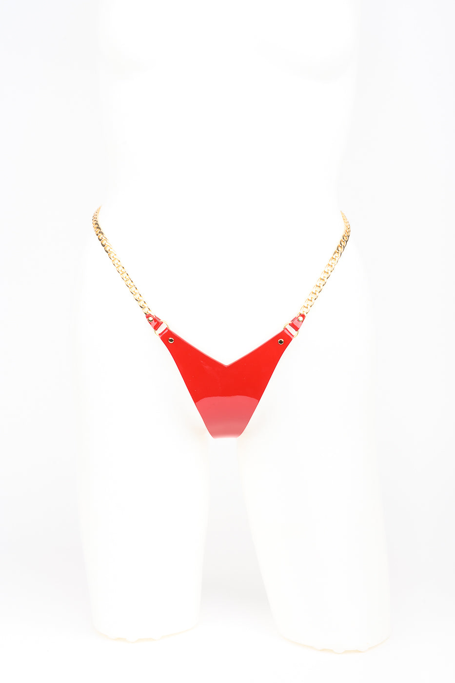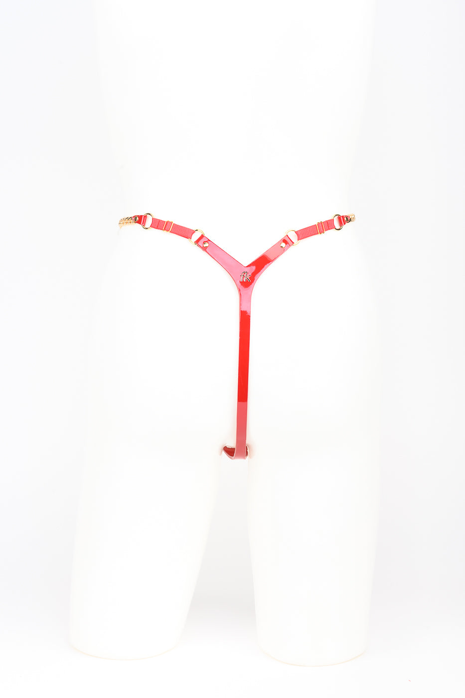 Verschönern Sie Ihren Körper mit diesem sexy String. Aus rotem Lackleder mit Ketten und Zierleisten aus 24 Karat Gold. Verstellbares Satingummiband für einfache Größenanpassungen. Gönnen Sie sich Luxus-Bondage!