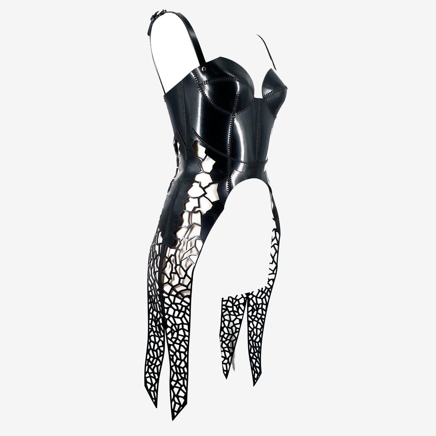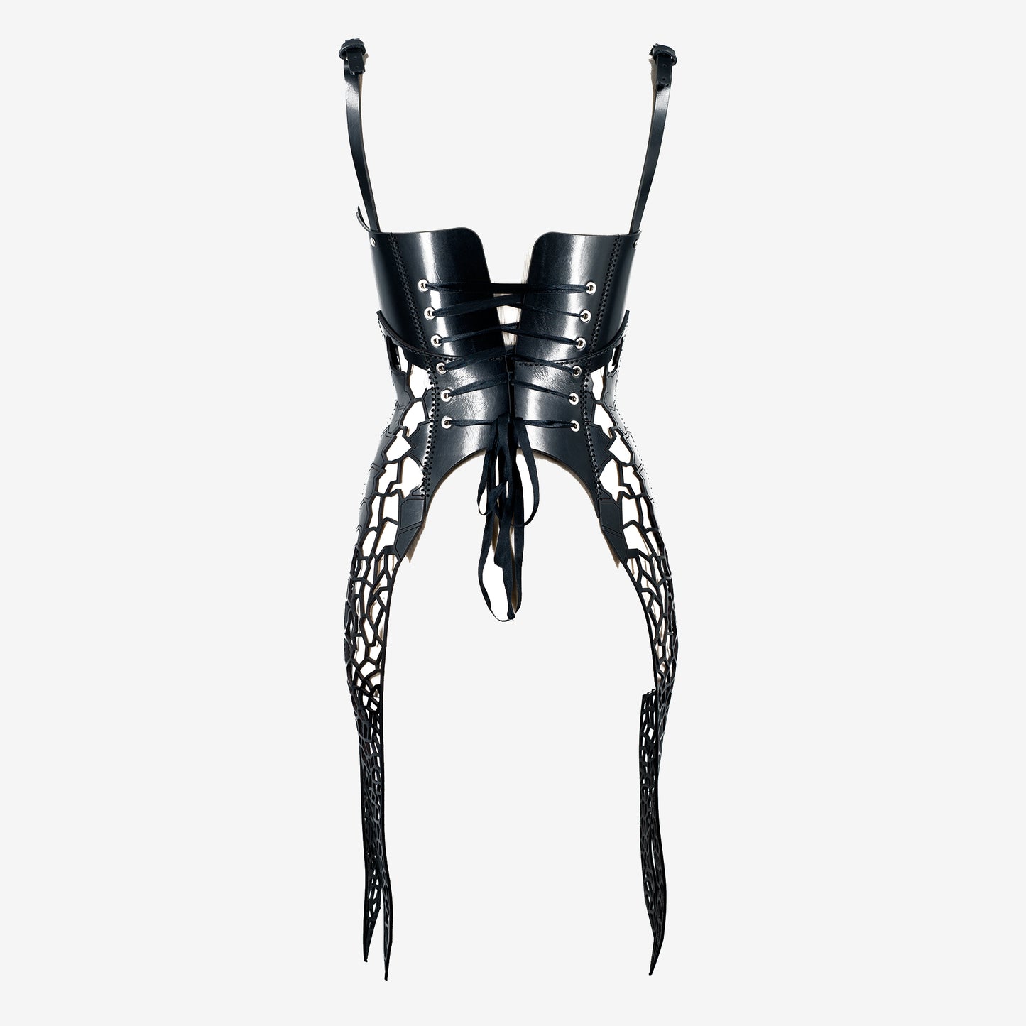 Lasergraviertes und geschnittenes Lederkorsett mit Sattelnähten. Verstellbares strukturiertes Korsett mit Kreuzschnürung.