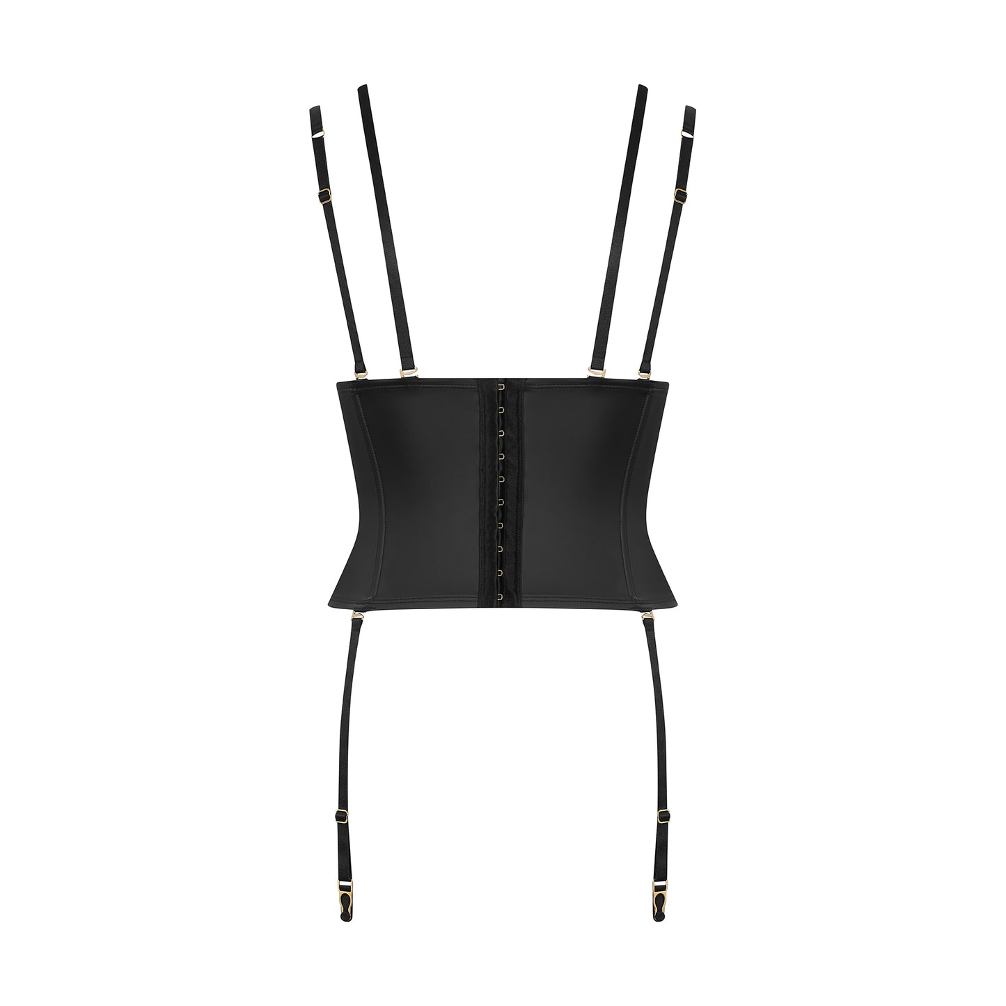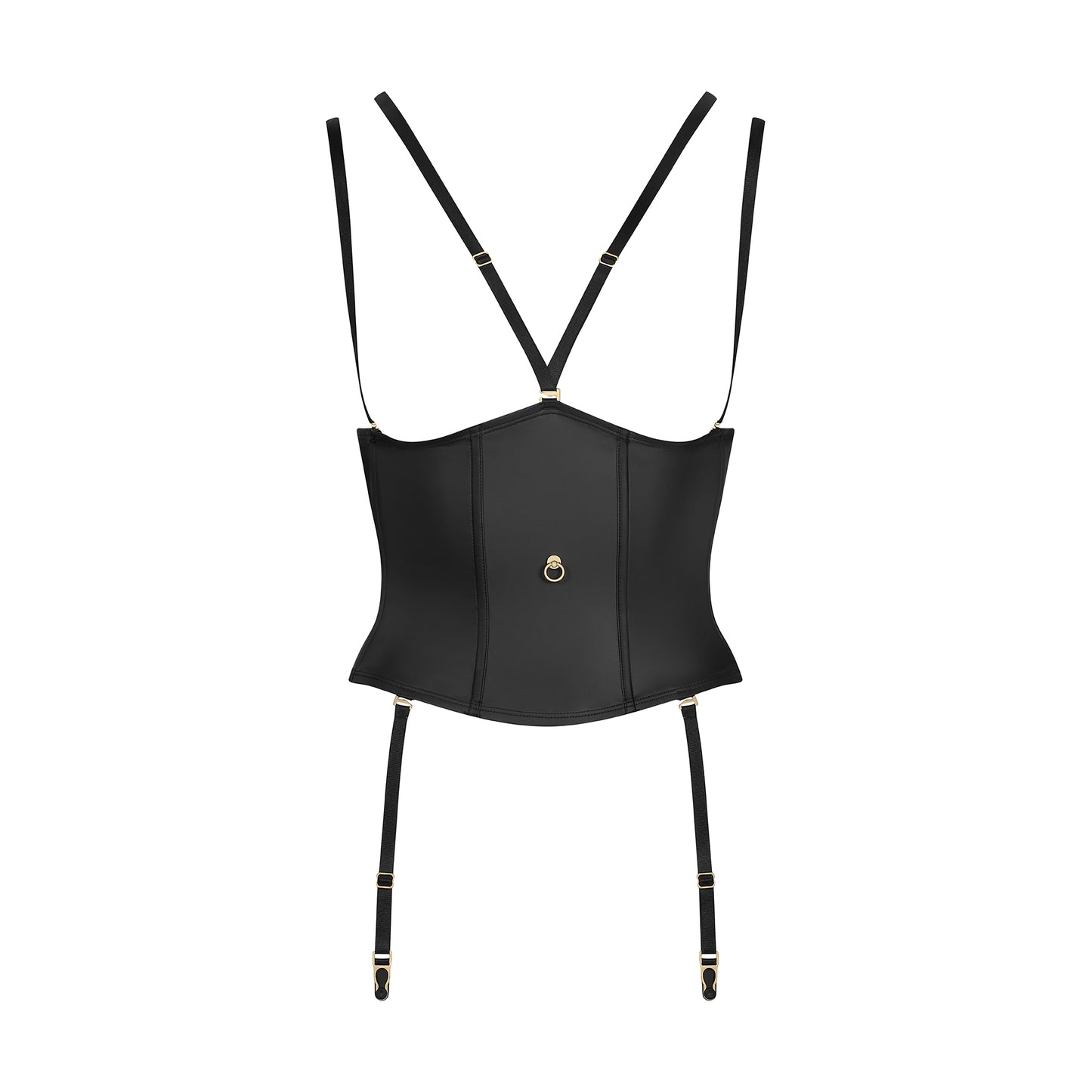 Strapsgürtel in matter Lederoptik. Eng anliegender, taillenbetonter Schnitt. Strapse, Träger und Halsbandgurt sind abnehmbar und können mit goldfarbenen Accessoires verstellt werden. Senkreichte weiche Streben für mehr Struktur und Halt. Verstellbarer Hakenverschluss am Rücken. Als Kennzeichen der Kollektion ziert ein vergoldeter Ring im "Feti-Chic" die Vorderseite und regt zum Festbinden an.